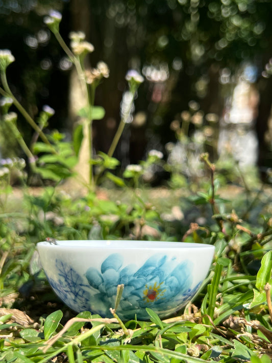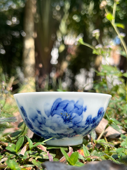 Chinese Handpainted Chinese Peony Blue and White Porcelain Teacup Jingdezhen Teacup Ceramic Master Pottery Artwork
