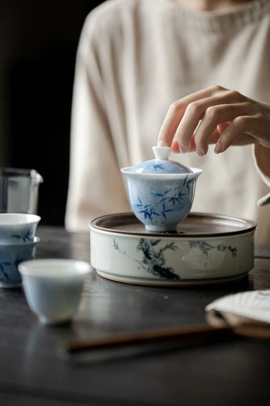 Chinese Jingdezhen Gaiwan Handpaited Bambo Pattern Teaware white Green Teapot Chinese Master Pottery Ceramic Japanese Ceramic