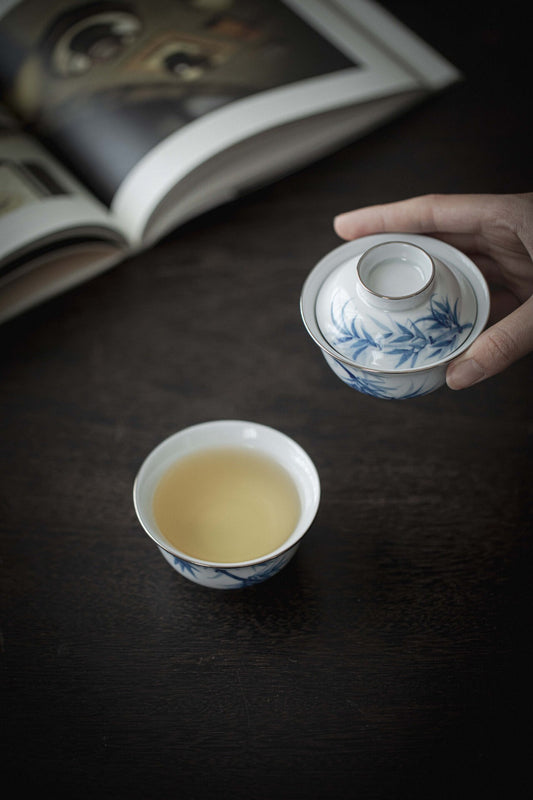 Chinese Jingdezhen Gaiwan Unique Original Handpainted Bamboo Pattern Teaware Set Vintage White Teapot Chinese Master Porcelain Ceramic