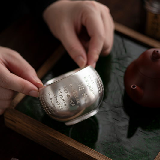 Hand Engraved Heart Sutra Chinese Gilded Pure Silver Teacup Ceramic Teacup