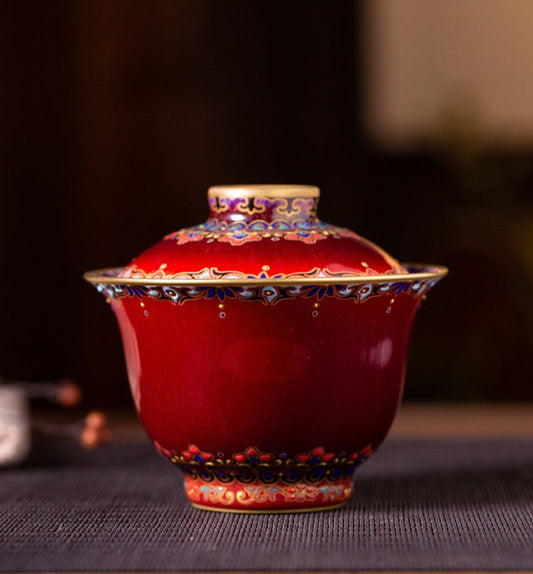 Handcrafted Chinese Hand Painted Chinese Langyao Red Teaware Jingdezhen Gaiwan Pottery Artwork