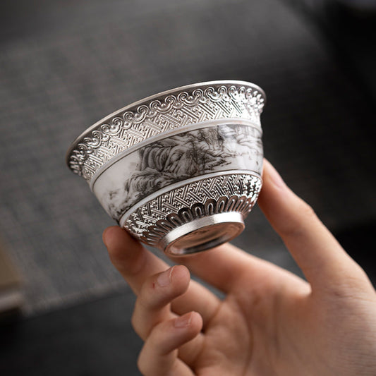 Handmade Chinese Original Gilded Silver Teacup Ceramic Master Cup Traditional Silvering Landscape Teacup