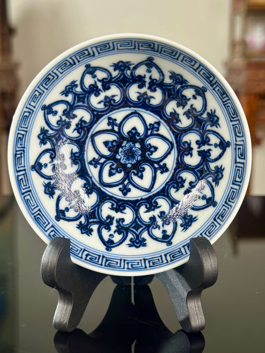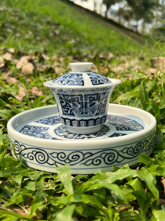 Handpainted Chinese Blue and White Qinghuaci Taotie Pattern Tea Set Gaiwan Teacup Tray