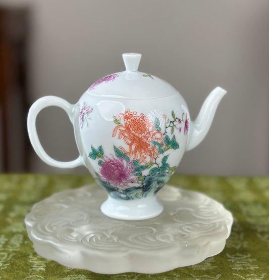 Handpainted Chinese Enamel Chrysanthemum Flower White Porcelain Artwork Teapot