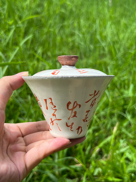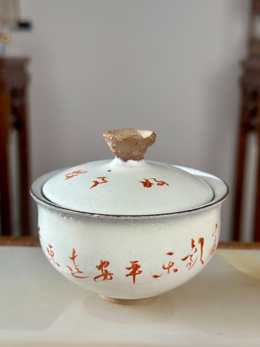 Handpainted Chinese Calligraphy Poem Alum Red Jingdezhen Orange Red Gaiwan Teaware Pottery