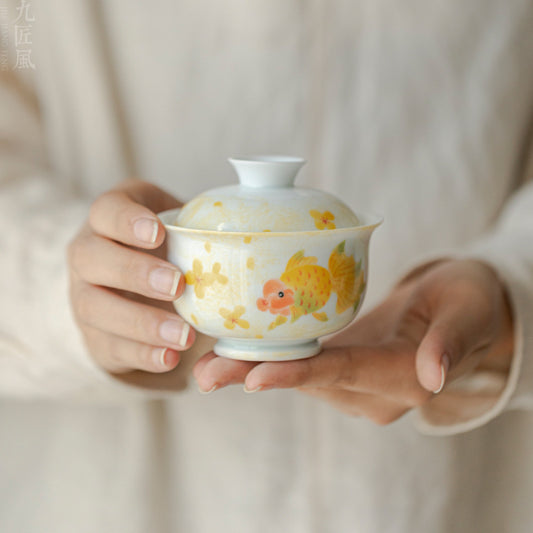 Handpainted Fat Fish Pattern Gaiwan Chinese Yellow Teaware Tea Maker Ceramic Kungfu Teapot