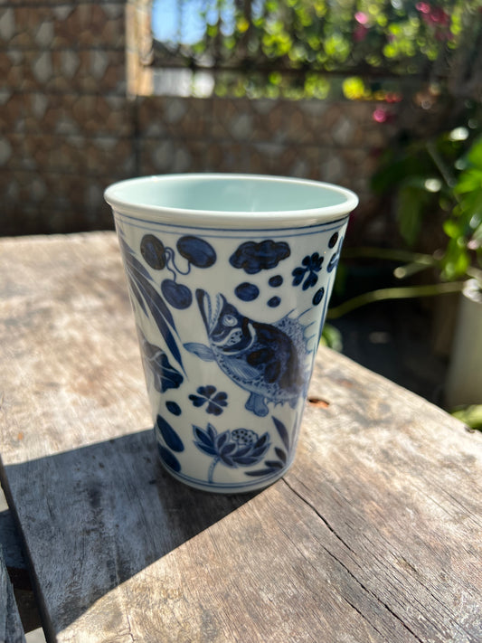 Handpainted Jingdezhen Teacup Chinese Fish Algae Mug White Blue Porcelain Fine China Cup
