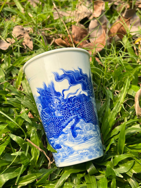 Handpainted Jingdezhen Teacup Chinese Qilin Kirin White Blue Porcelain Fine China Cup