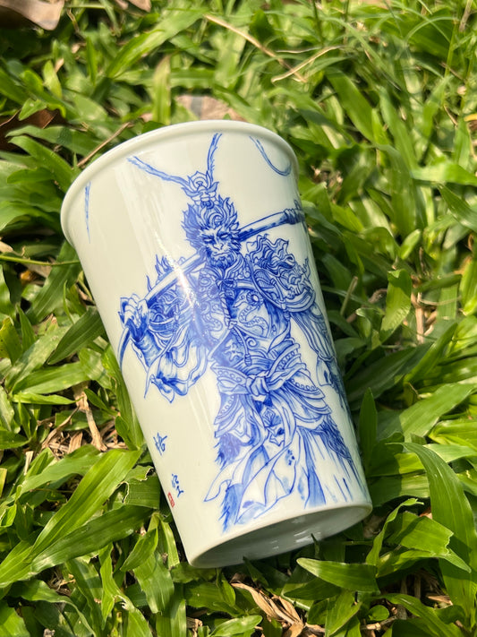 Handpainted Jingdezhen Teacup Chinese Wukong Monkey King White Blue Porcelain Fine China Cup