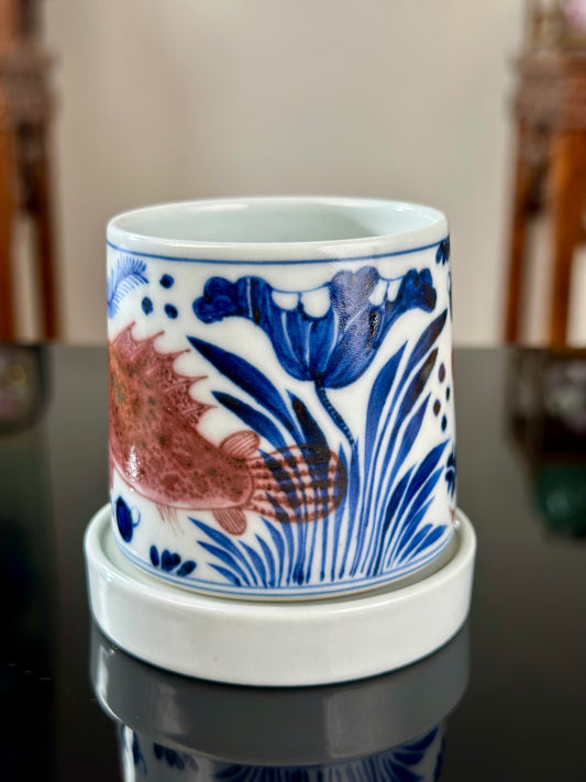 Handpainted Chinese Traditional Gui Fish Pattern Blue and White Underglaze Red Youlihong Porcelain Jingdezhen Rotating Teacup