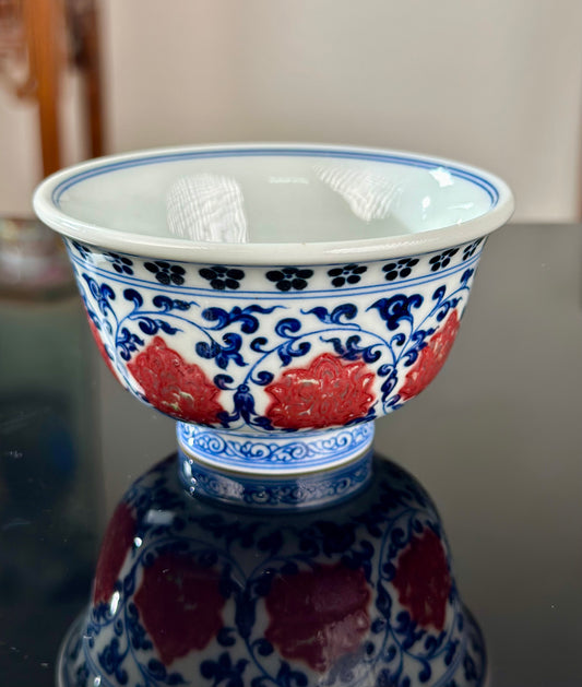 Handpainted Chinese Traditional Lotus and Twined Stem Pattern Blue and White Underglaze Red Youlihong Porcelain Jingdezhen Rotating Teacup