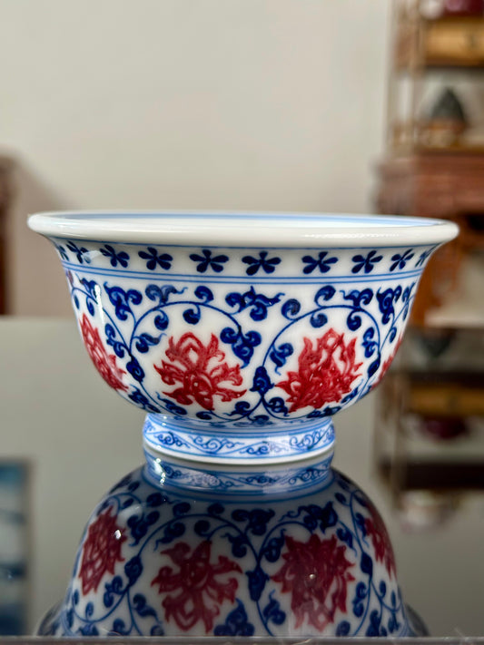 Handpainted Chinese Blue and White Underglaze Red Youlihong Porcelain Jingdezhen Traditional Lotus with Twined Stem Pattern Teacup