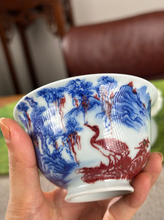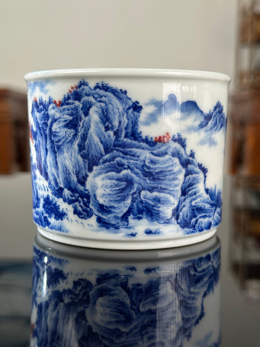 Handpainted Chinese Blue and White Underglaze Red Youlihong Porcelain Jingdezhen Mountain Landscape Pattern Teacup