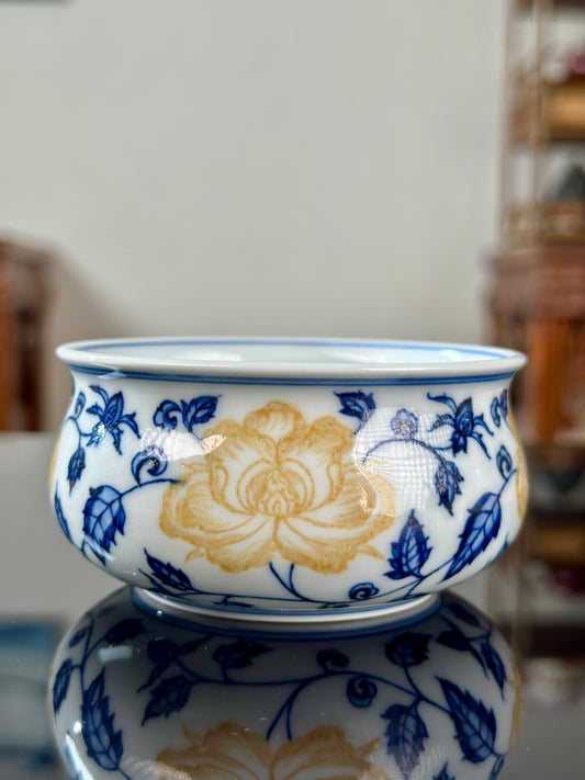 Handpainted Chinese Luxious Blue White Porcelain Underglaze Gold Youlijin Classic Peony Pattern Artwork Teacup