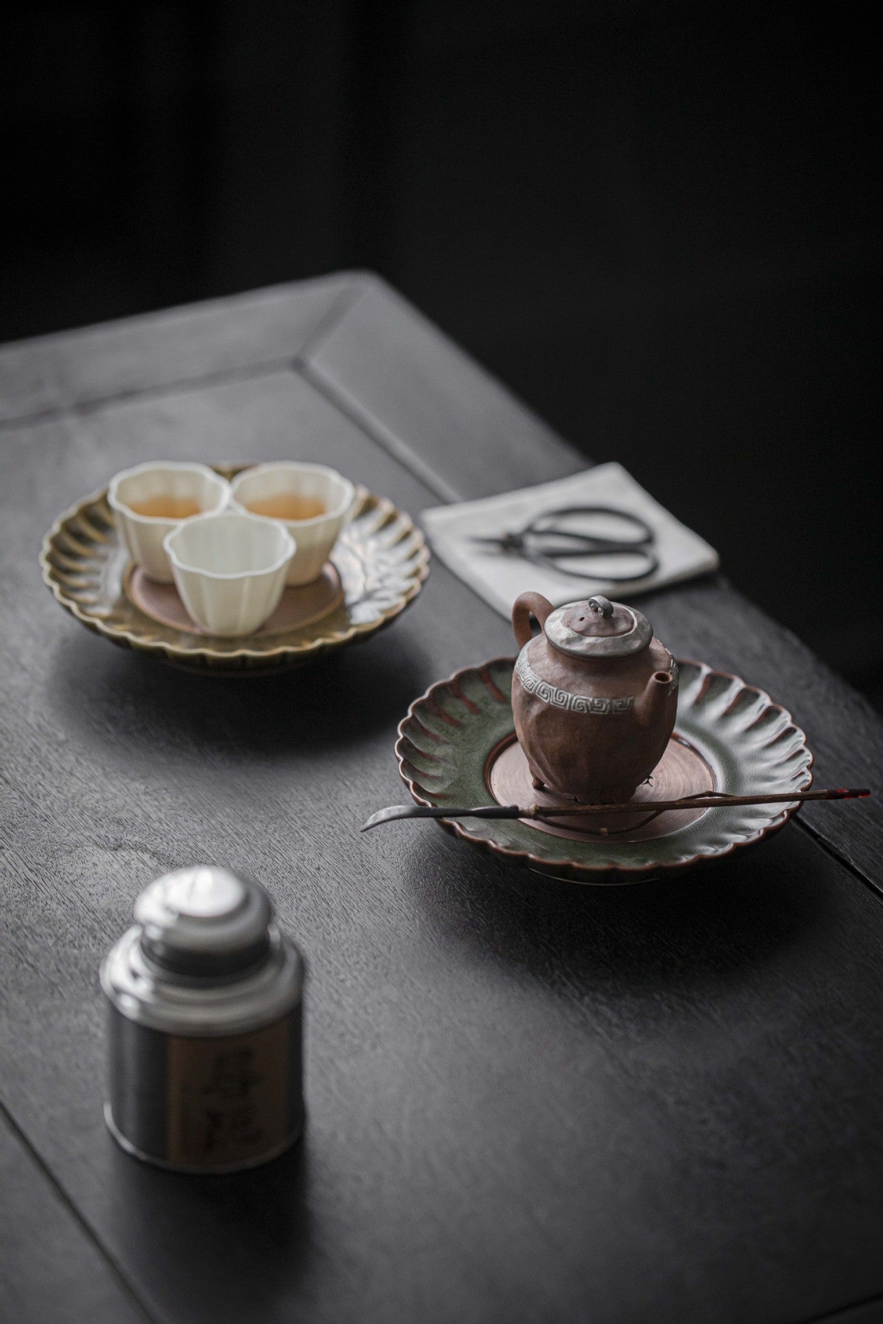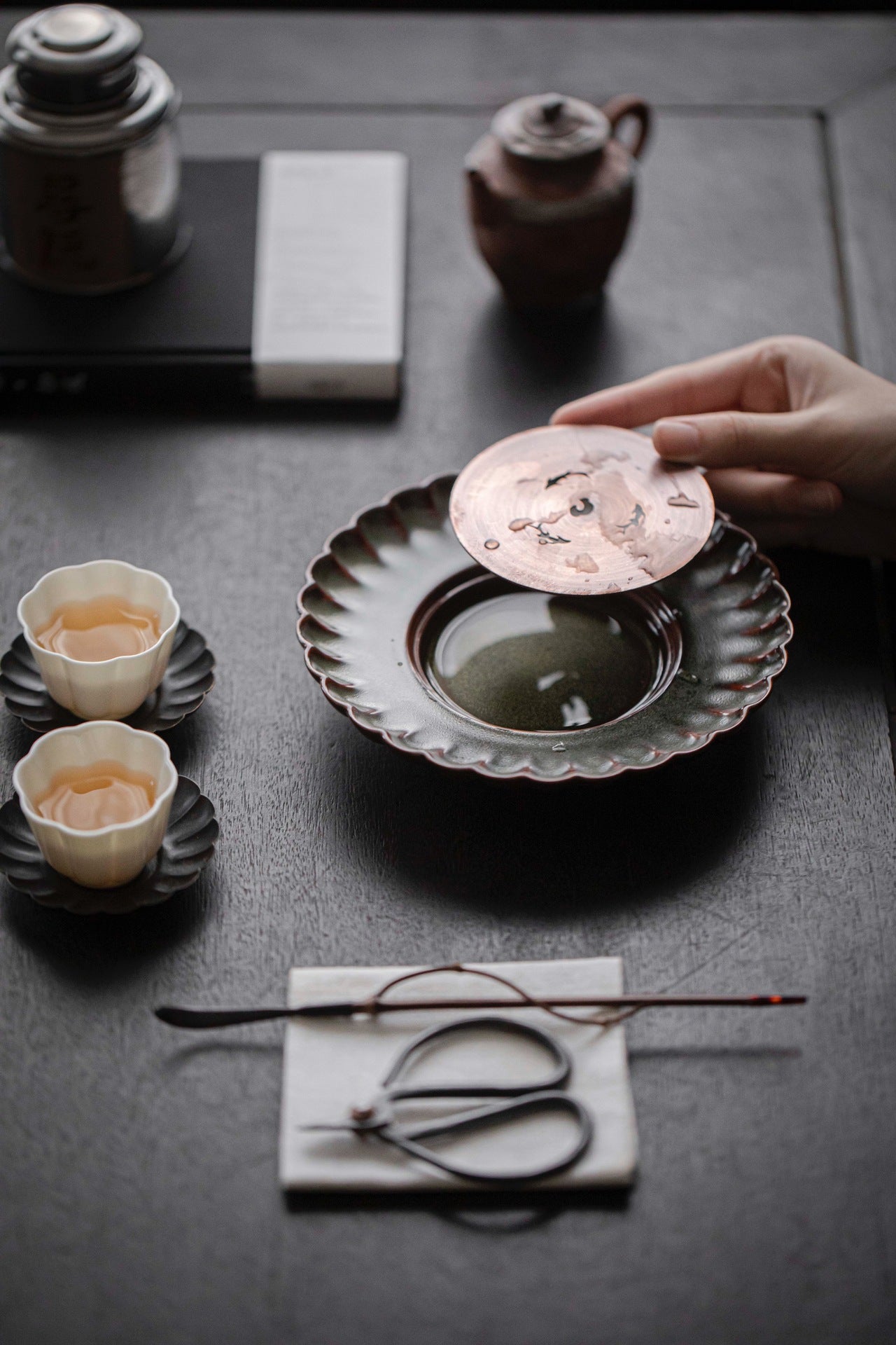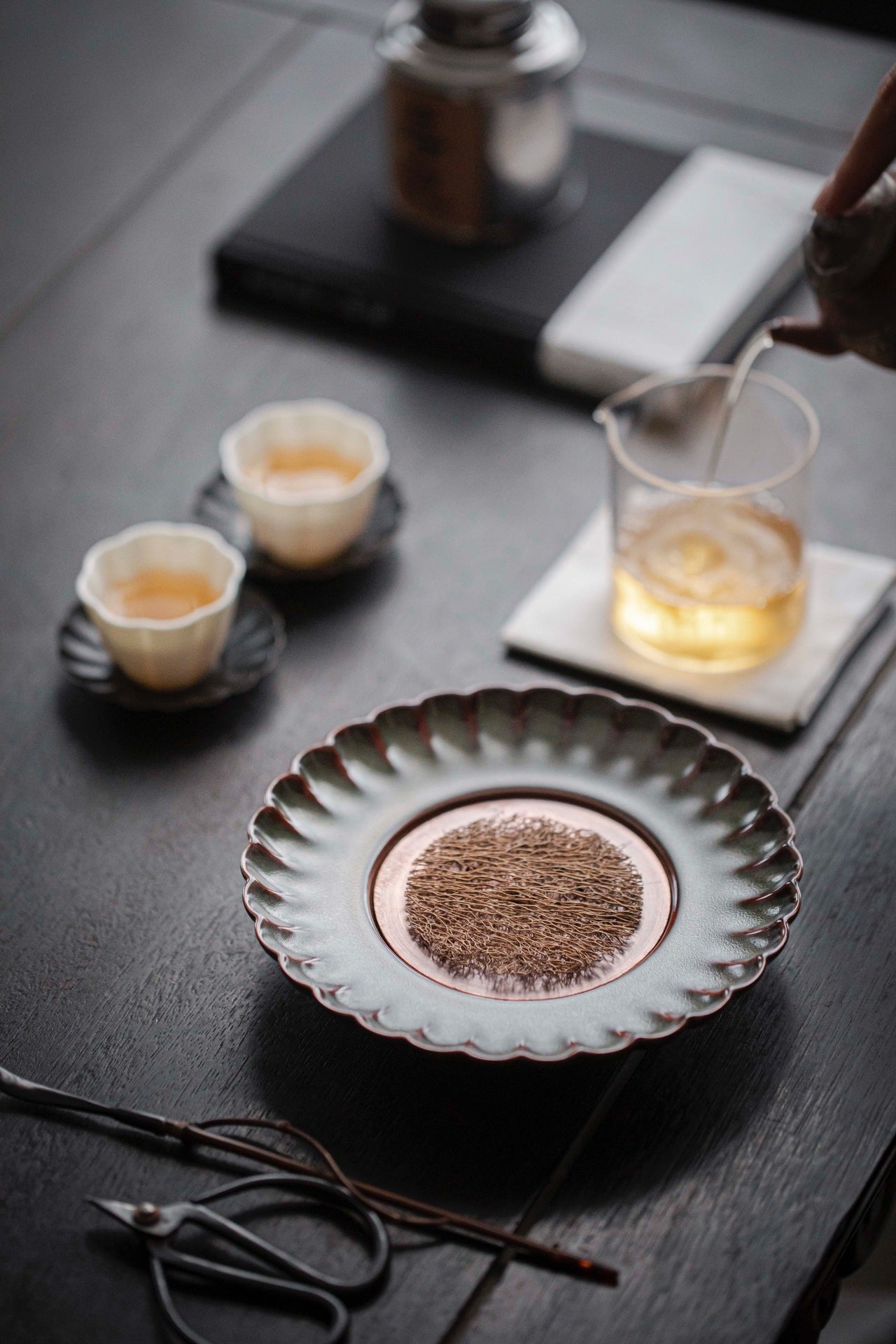 The entire tea tray consists of two parts, the middle part is brass and the bottom is made of ceramic.