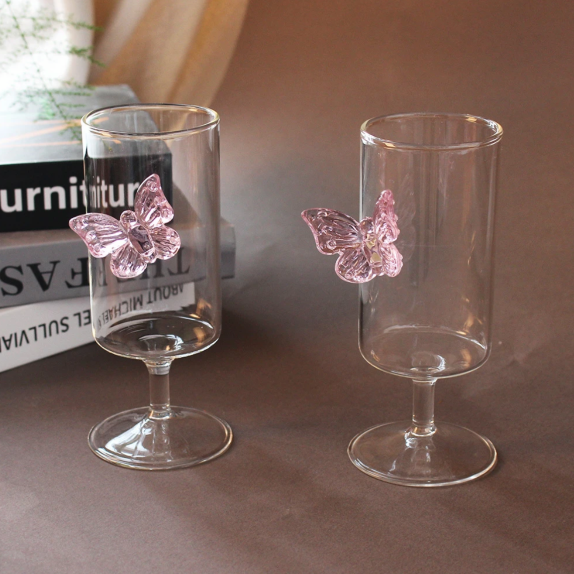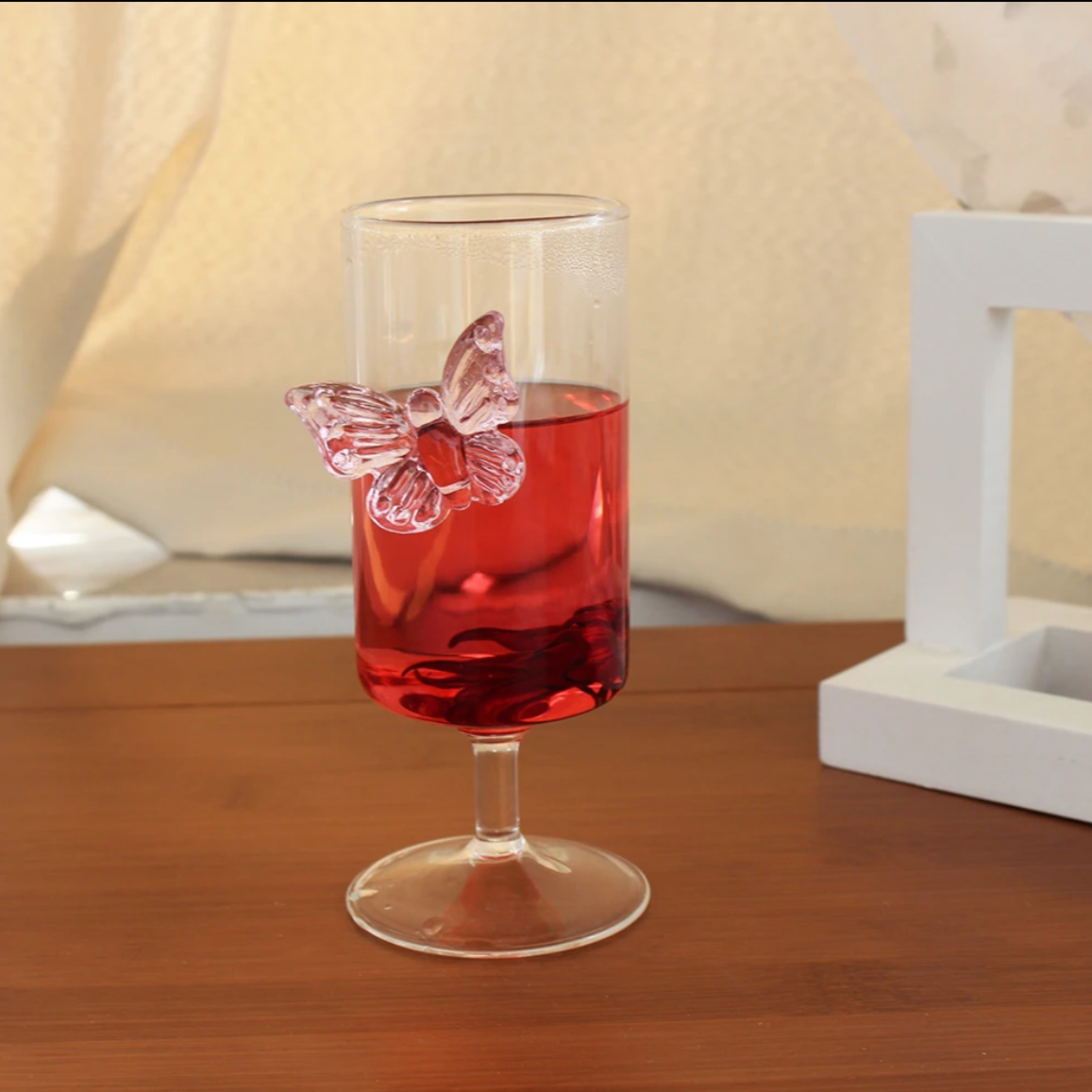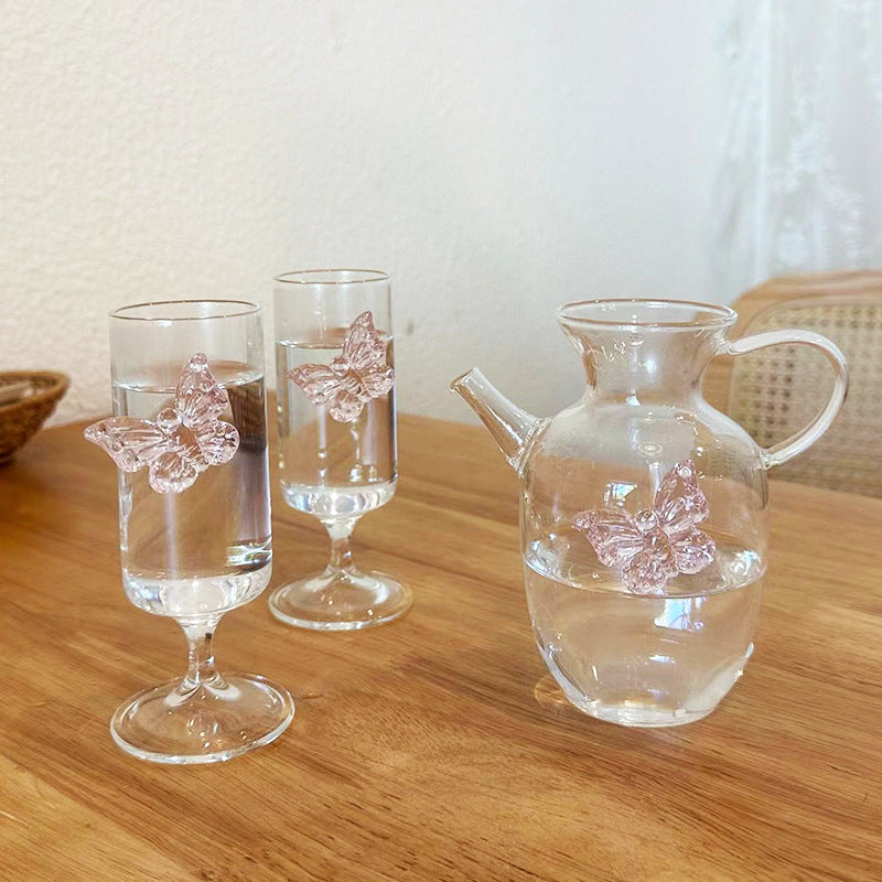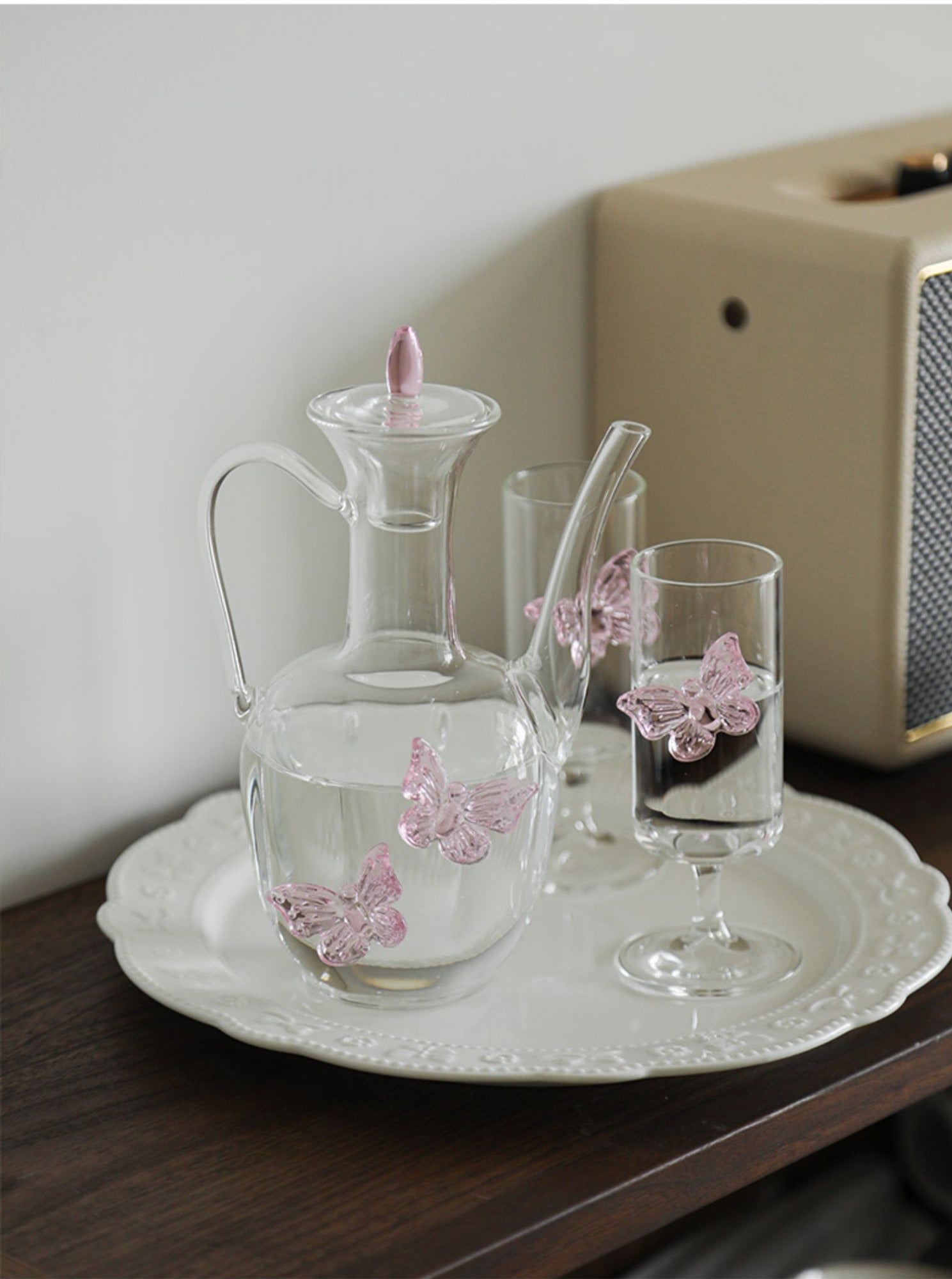 This pink set is perfect for cold brewing green tea in the summer, and you can imagine the charming three-dimensional pink glass butterflies lingering over the scene of tea leaves dancing in the teapot.