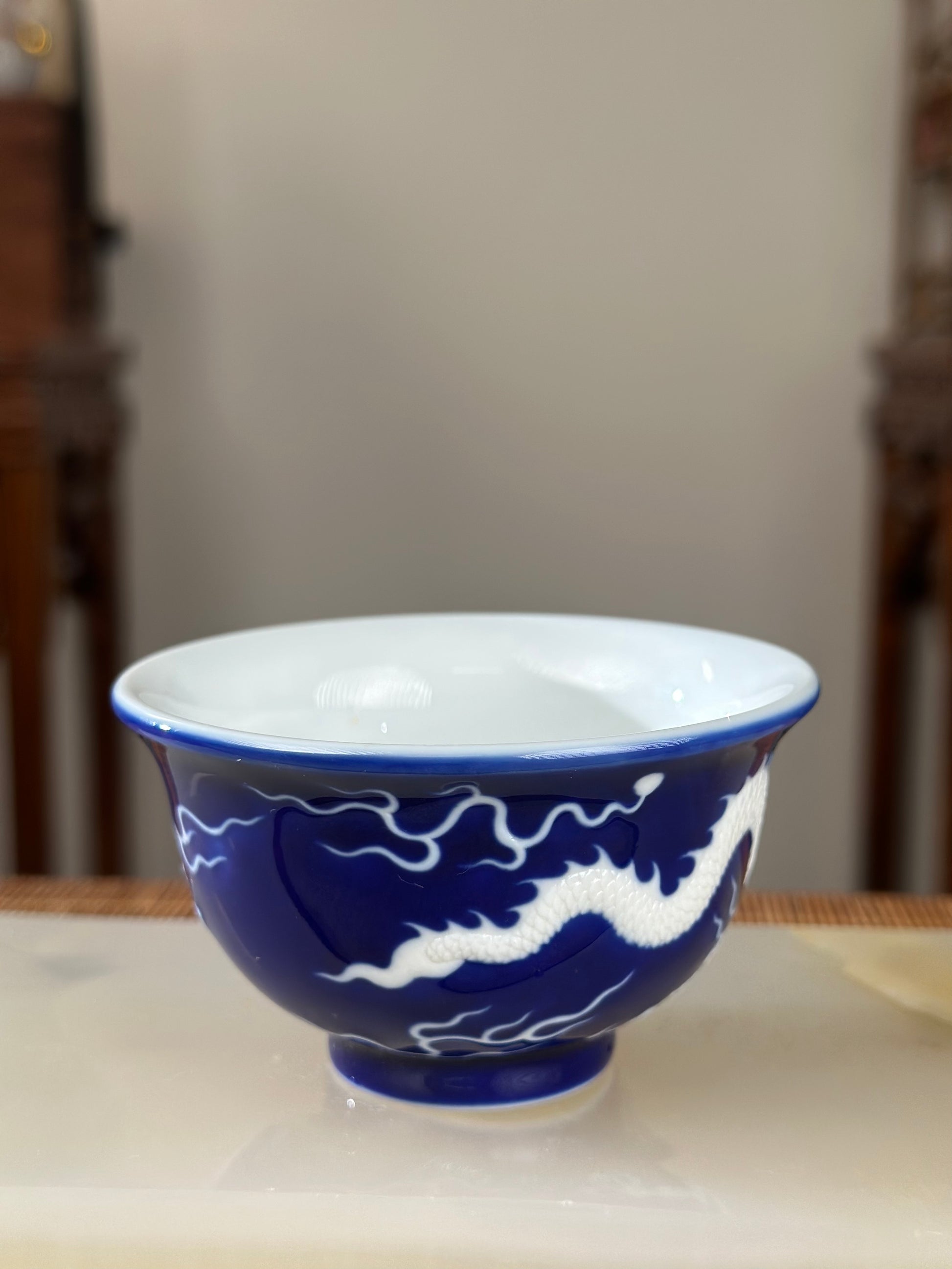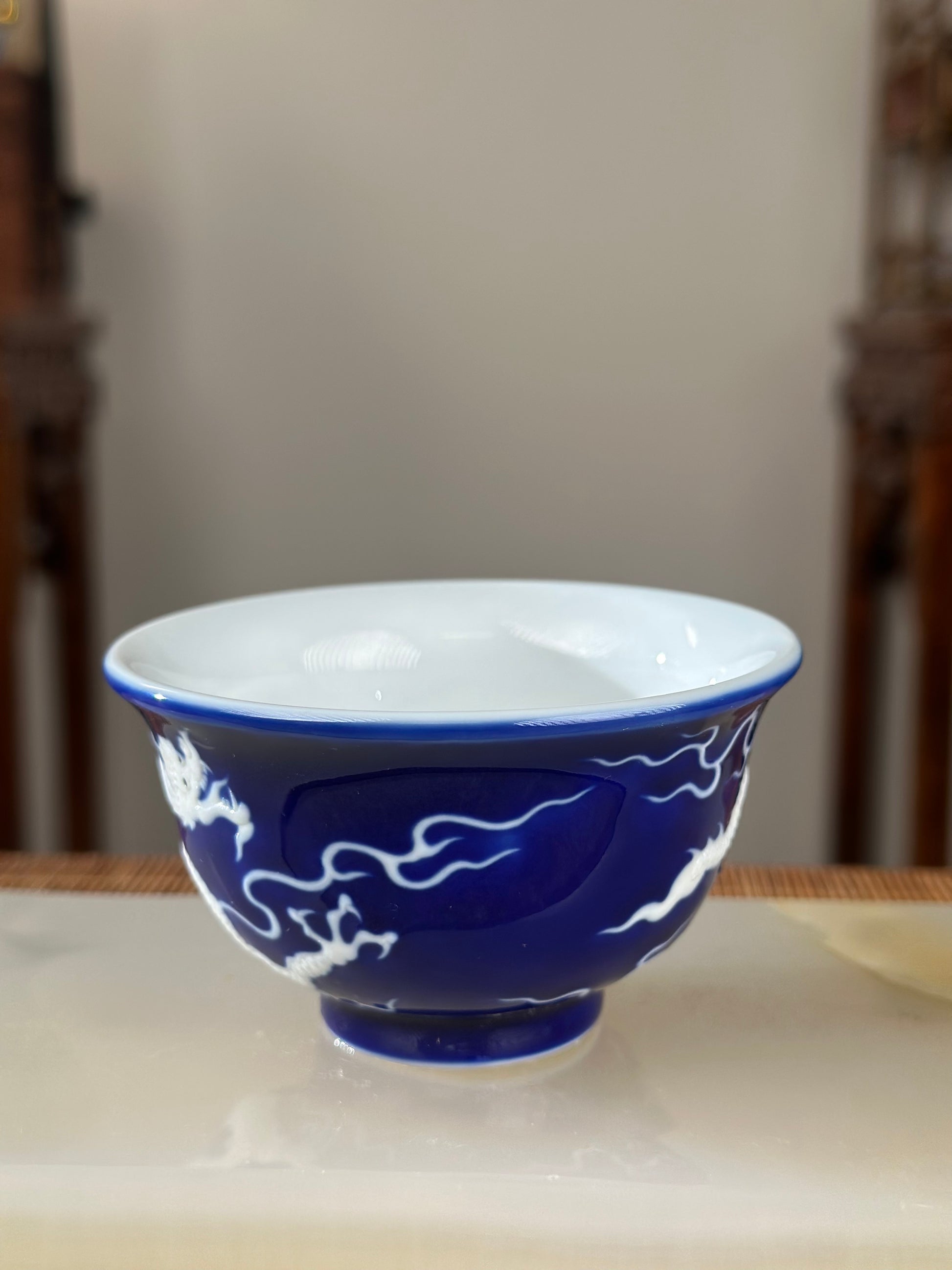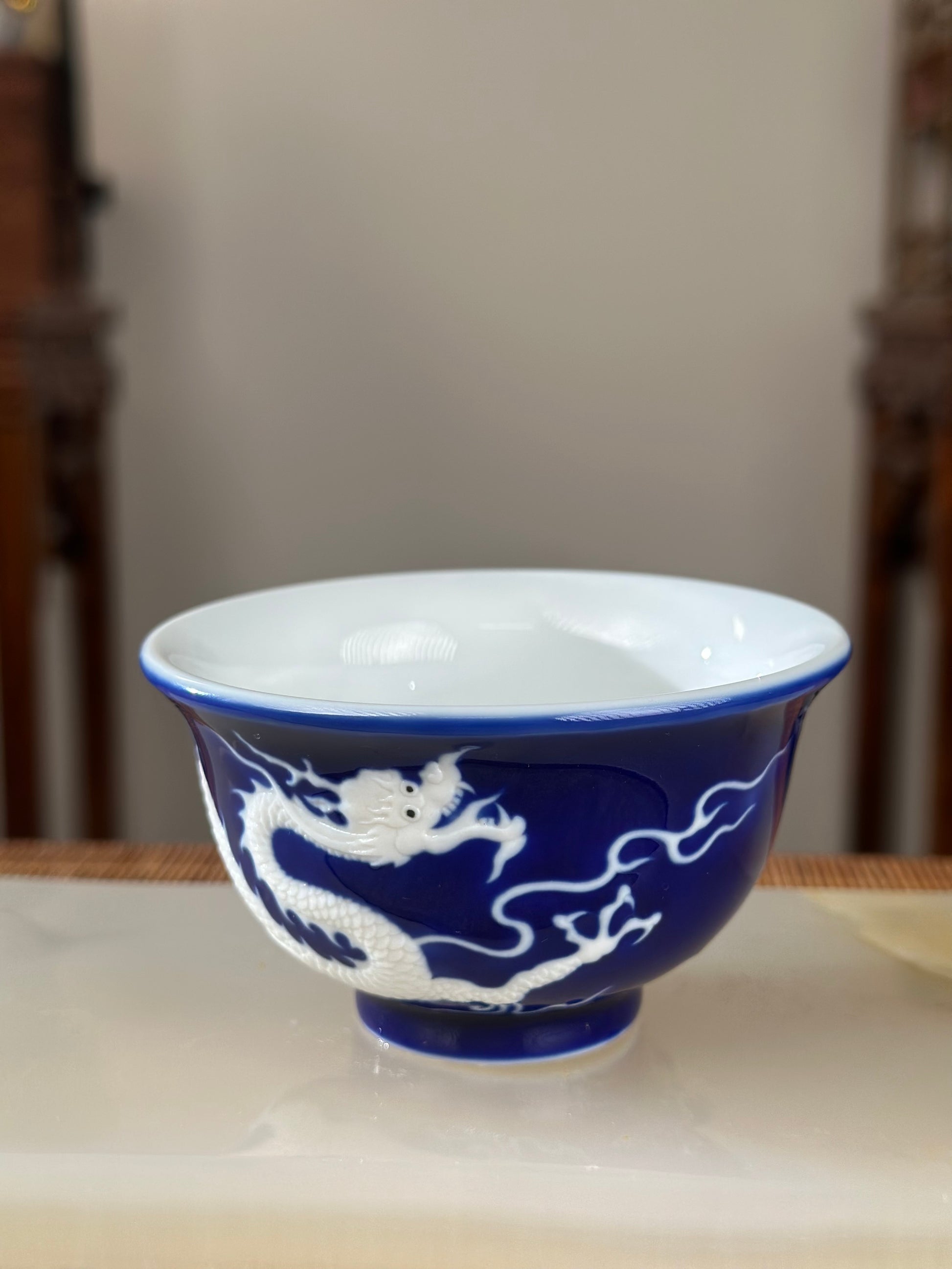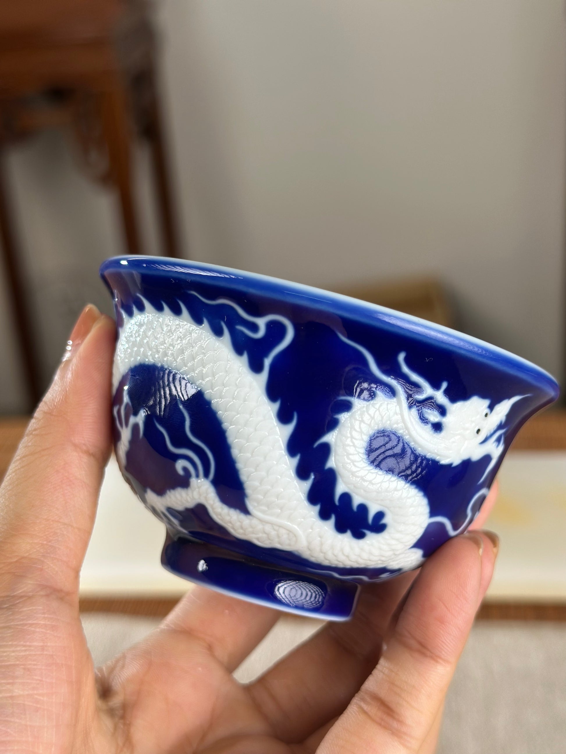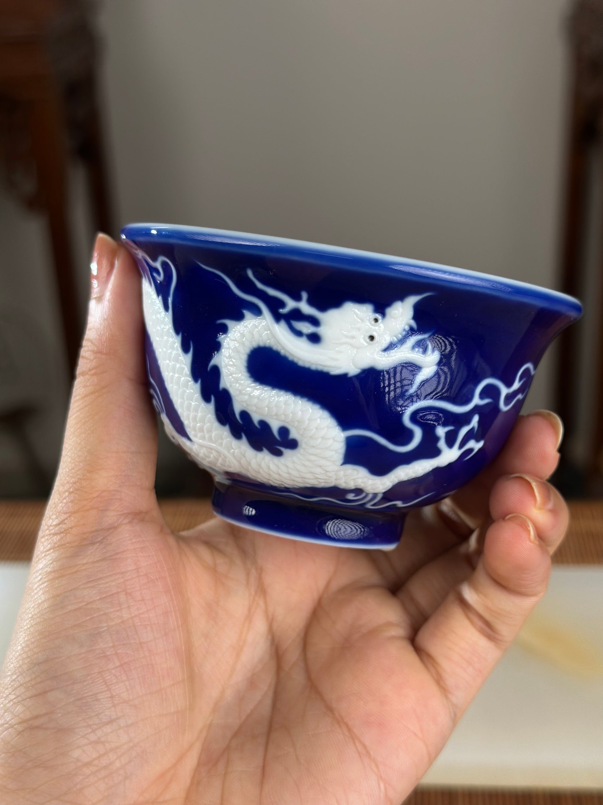 Hand Engraved Blue White Porcelain Dragon Teacup Artwork