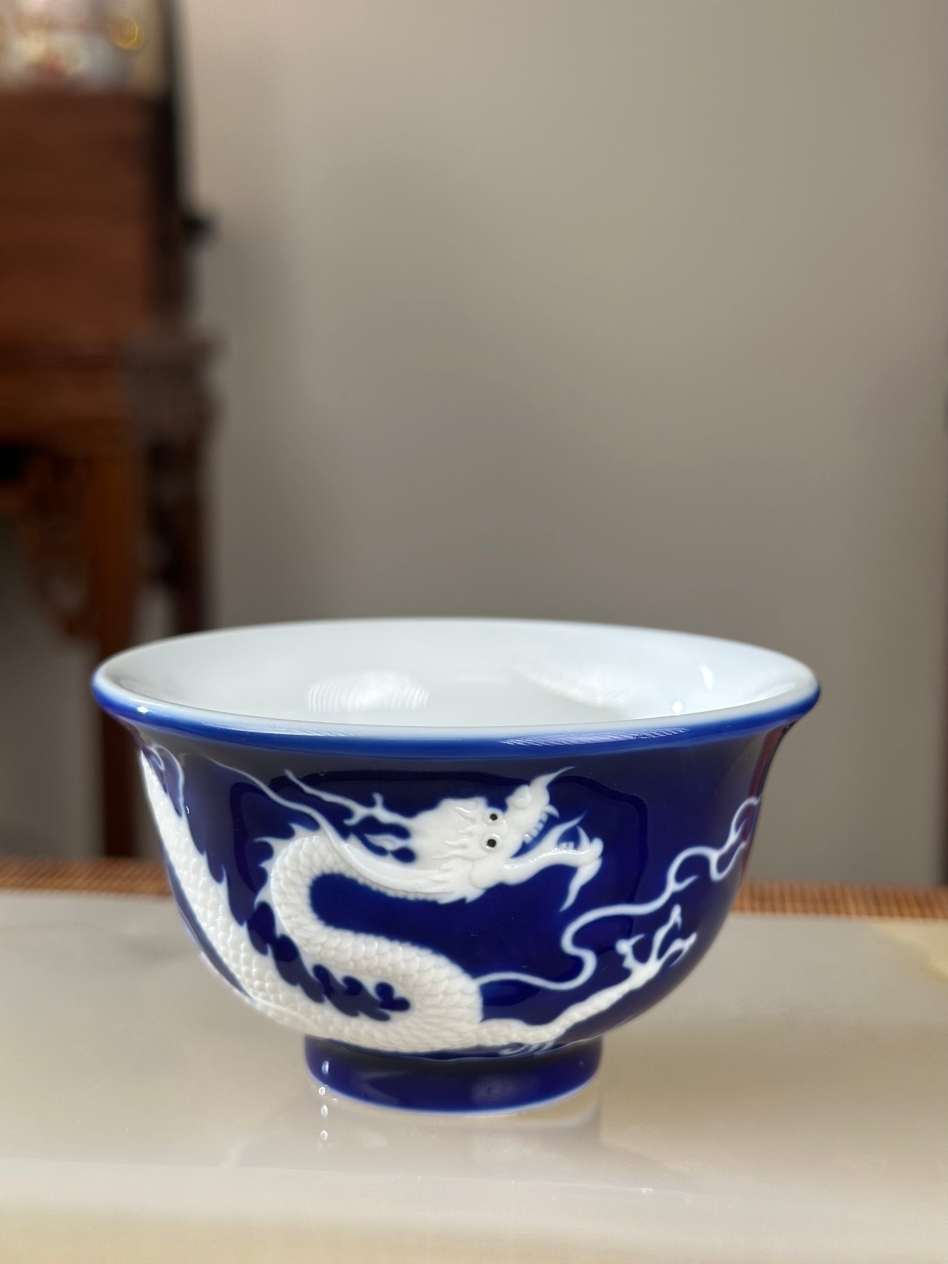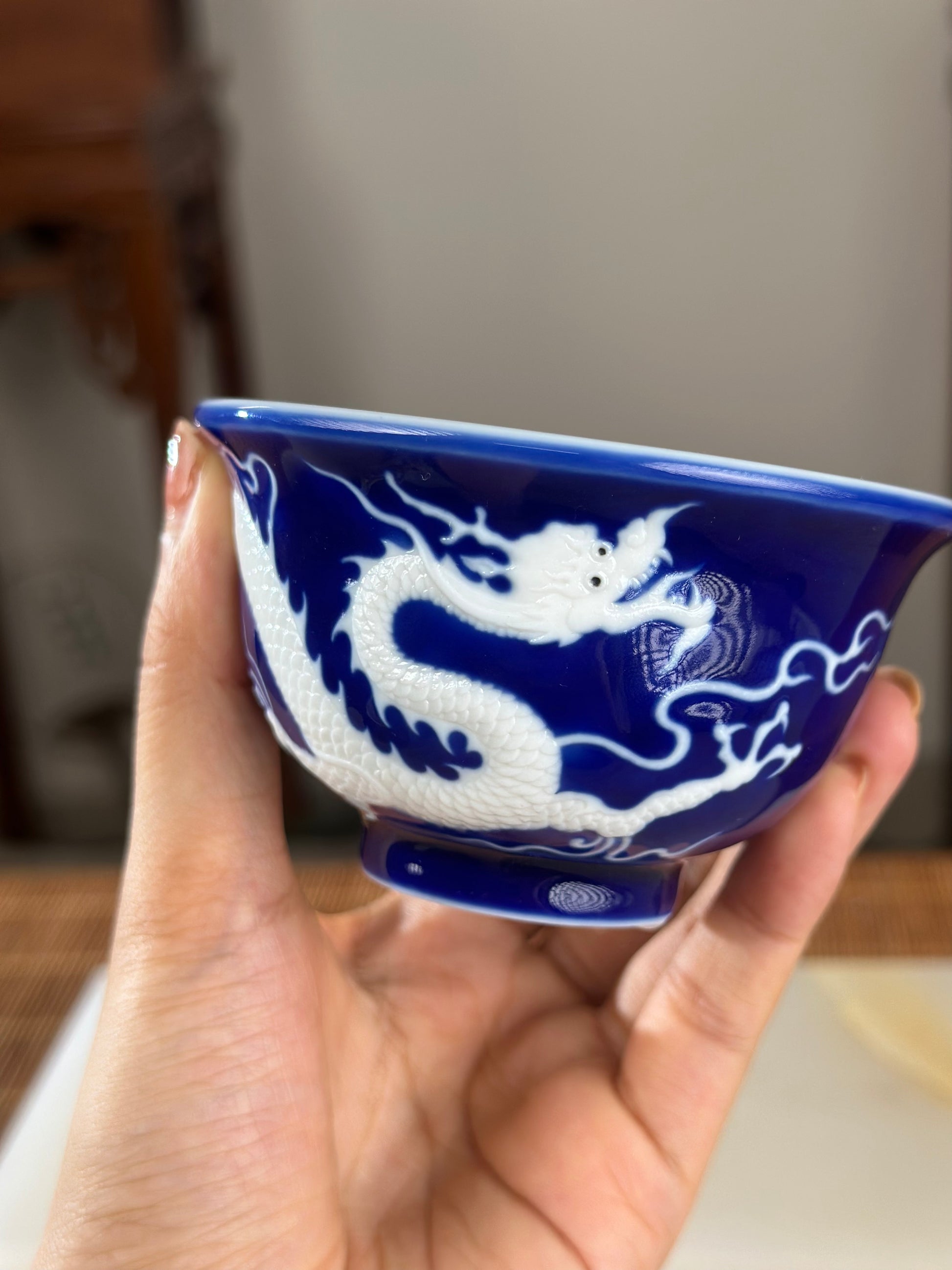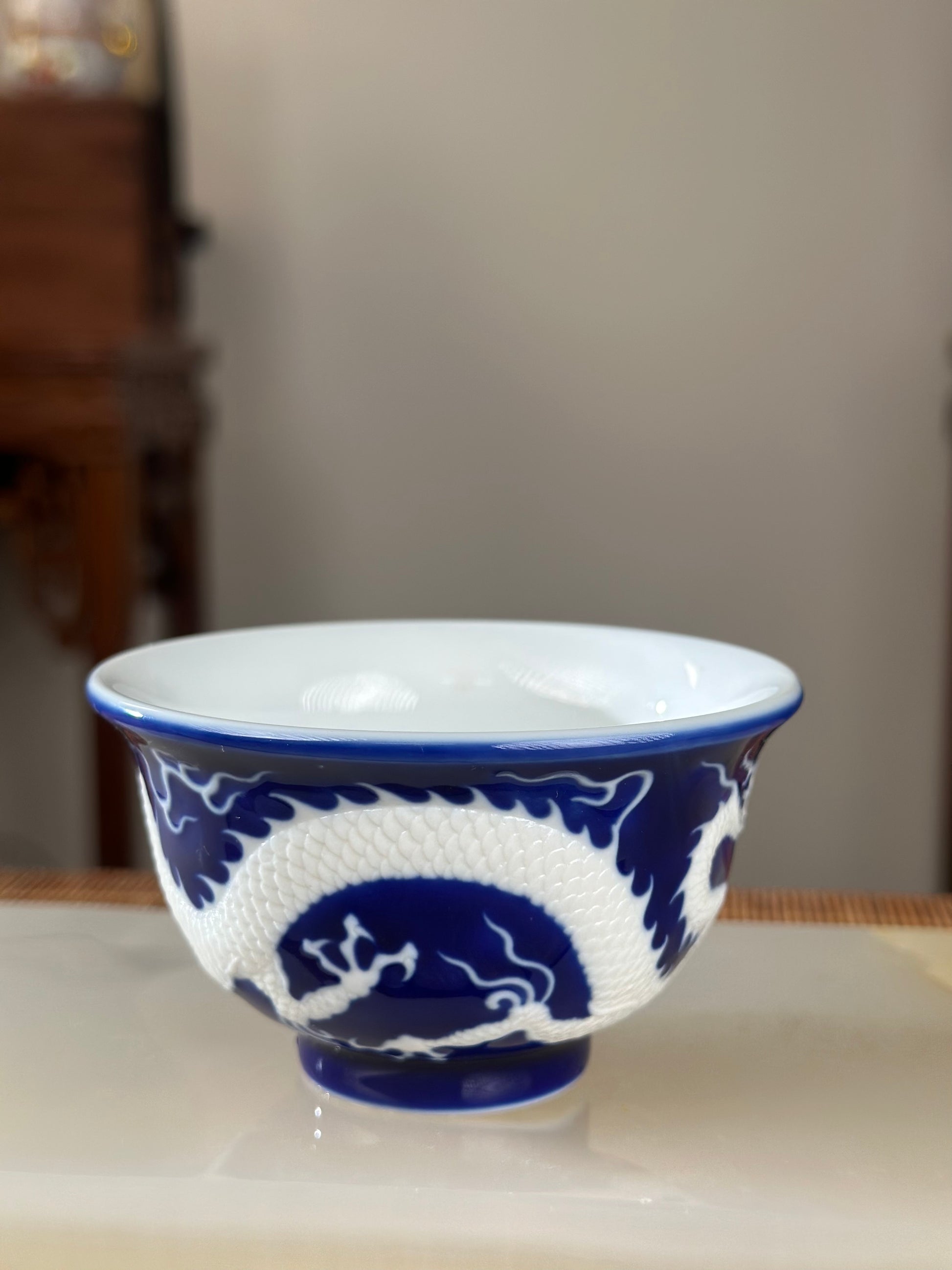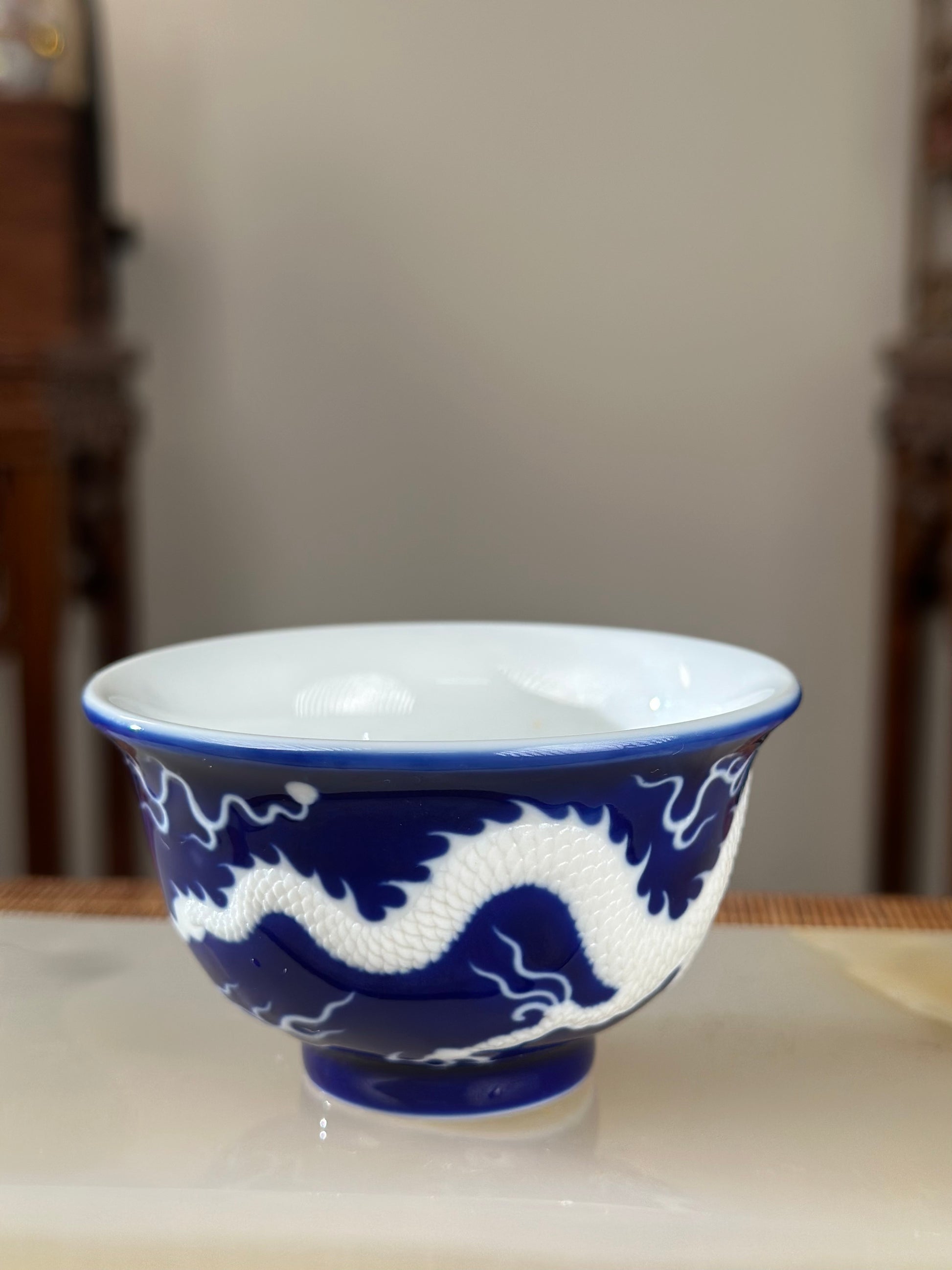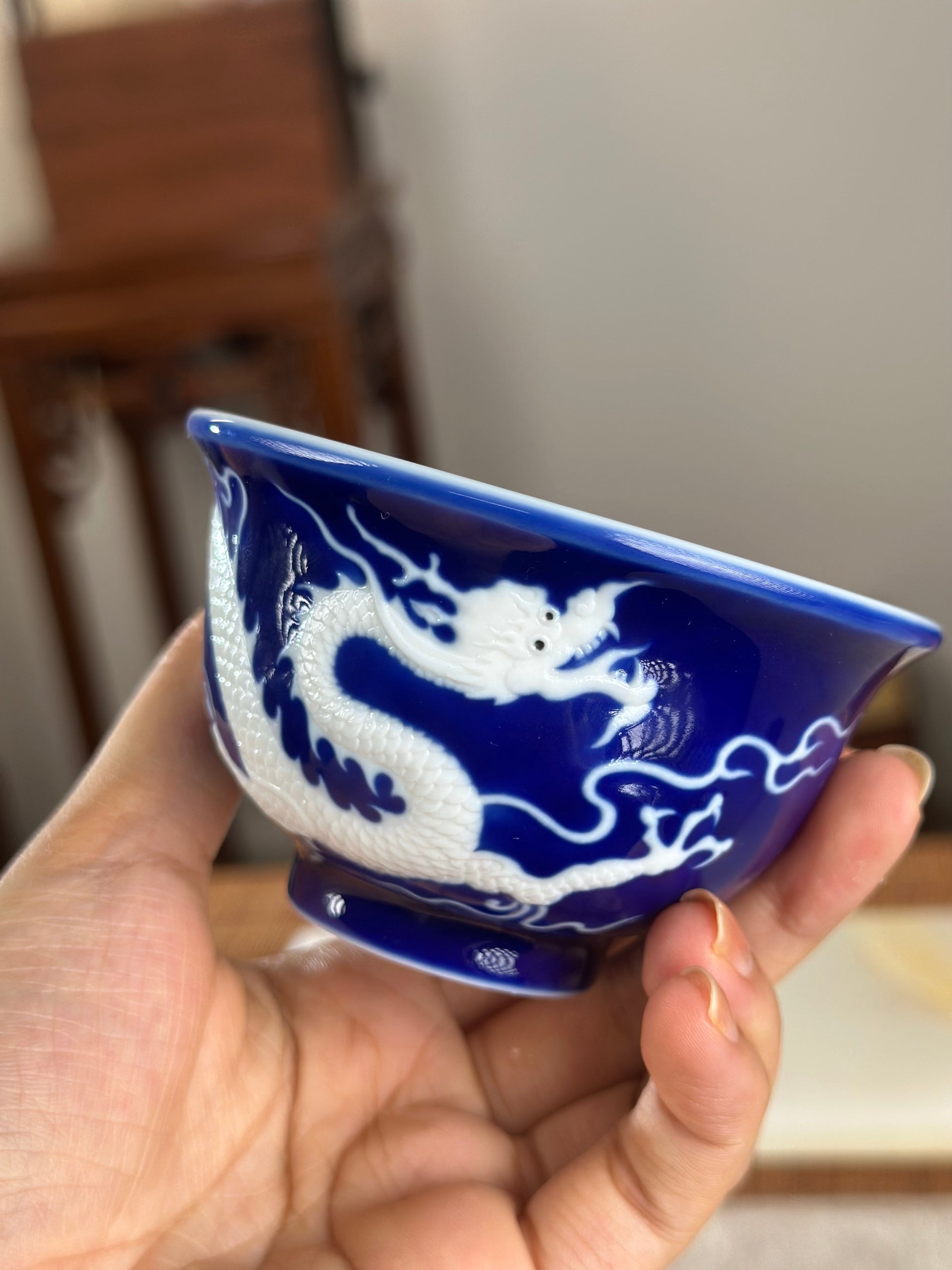 Hand Engraved Blue White Porcelain Dragon Teacup Artwork