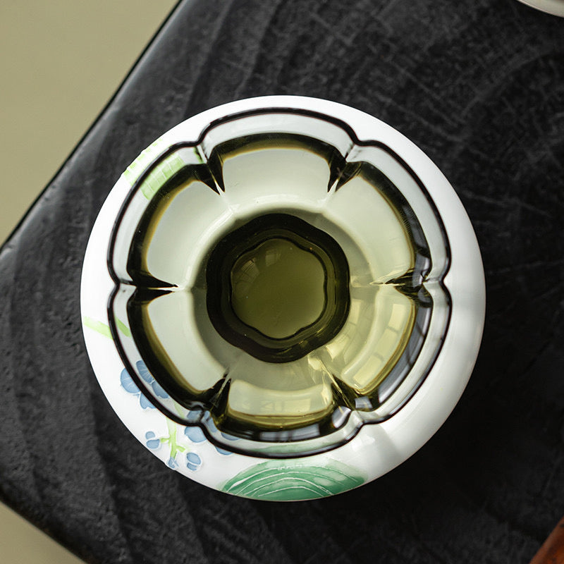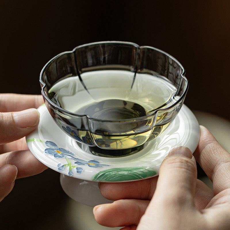 The glass teacup is made of borosilicate glass, which can support the temperature -20℃-150℃. The glass teacup can better show the color of the tea liquor and has a good visual effect; with the white porcelain teacup saucer is hand-painted with myosotis flowers, making the teacup set look very gentle.