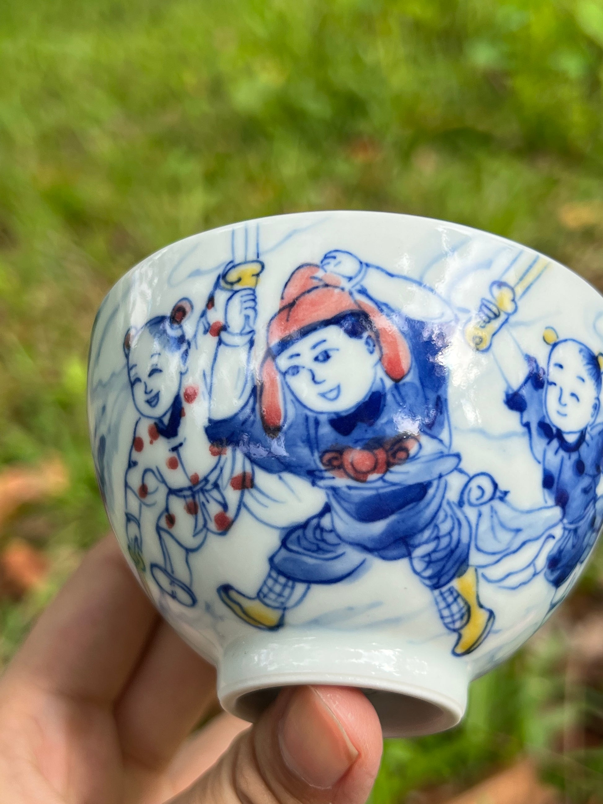 This Jingdezhen artwork teacup is hand-painted with a pattern of three children playing, the back of the cup is hand-painted with the calligraphy "The Magic Warrior 神兵小将". This teacup is made by Jingdezhen experienced ceramic painter, Yu Hongliang.