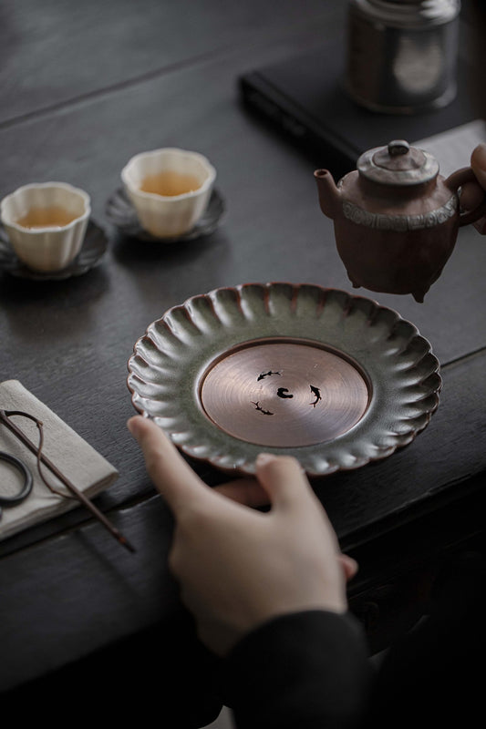 Antique Copper Style Tea Tray Tea Dry Ceramic Tea Boat Chinese Master Artwork Teapot Holder Tea Boat