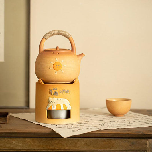 Japanese Style Cute Cat Painting Kettle Stove Set Handmade Crude Pottery Alcohol Stove Base