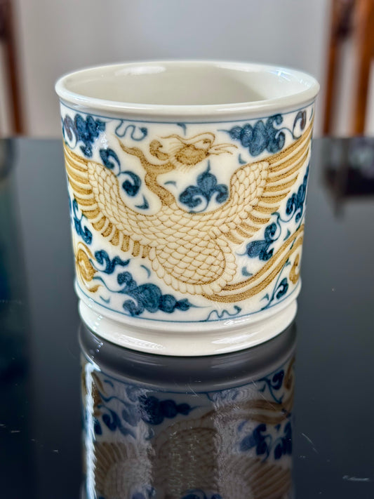 Handpainted Chinese Luxious Blue White Porcelain Underglaze Gold Youlijin Traditional Phoenix Pattern Masterpiece Gaiwan Teacup Set Artwork