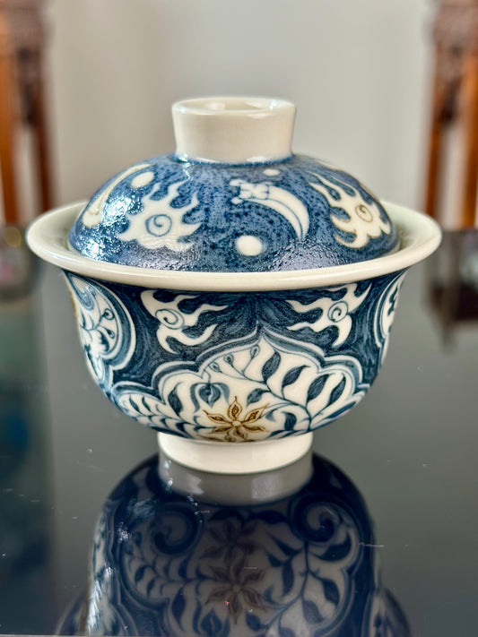 Handpainted Chinese Luxious Blue White Porcelain Underglaze Gold Youlijin Ruyi Pattern Gaiwan Set Artwork Teacup