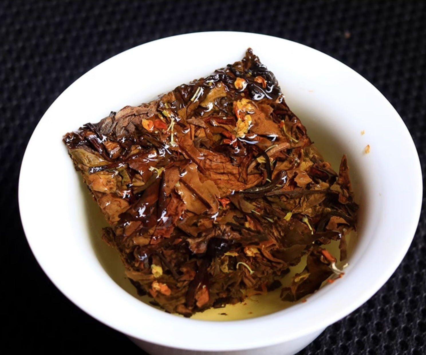 This osmanthus white tea is a perfect combination of 2015 Fujian large-leaf white tea and 2023 Guangxi golden osmanthus. White tea originates from Ningde, Fujian, a high mountain production area of white tea, and golden osmanthus is produced in Guangxi Province.