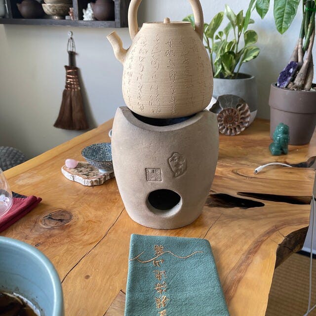 Chinese Chaozhou kettle, we also call it "Shaodiao", is made by a very experienced craftsman from Chaozhou, the kettle is engraved with some poems of Heart Sutra, if you want to perform Gongfu tea ceremony, this kettle would be a great pleasure for you to heat water by a very traditional way and it makes your water softer in the taste thanks to the breathable particularity of Chaozhou white mud.