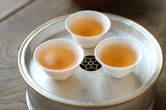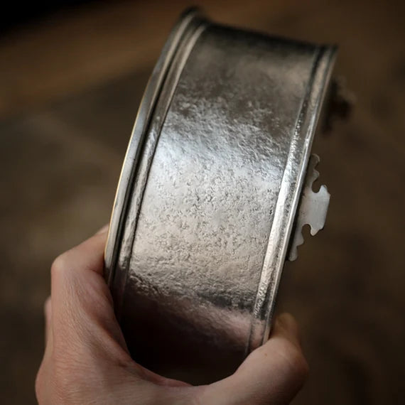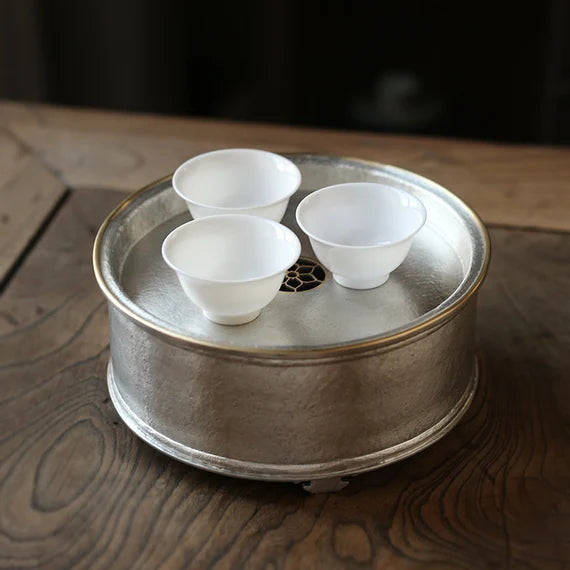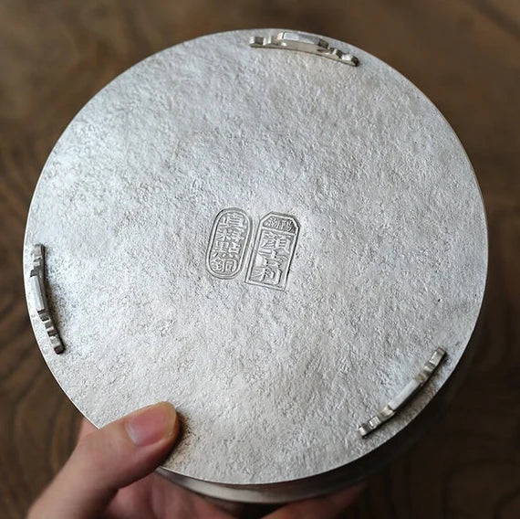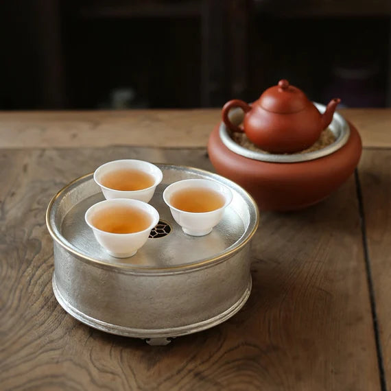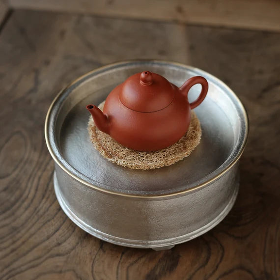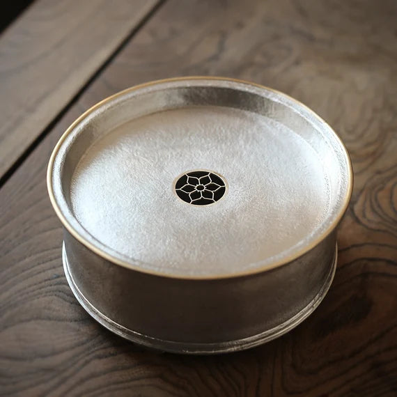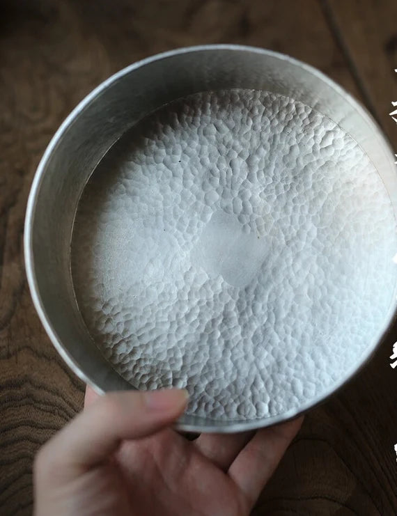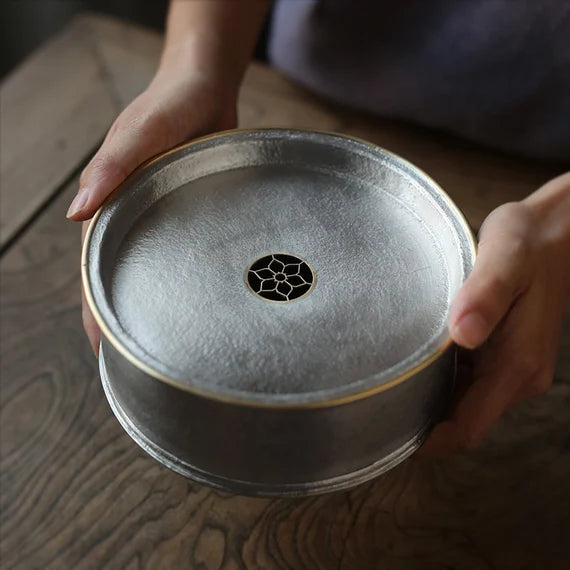 This classic Chaozhou tin tea tray is made by a very famous tin craftsman-Yan Jili(颜吉利), every his artwork is forged his name on the backside. This exquiste bright tin tray is made of pure tin almost 99.9% and its edge is made of Chinese brass, which adds an ambiance of classe. if you are searching for a tea tray for your Gongfu tea set, this will be an excellent choice. Simple design but very elegant looking.