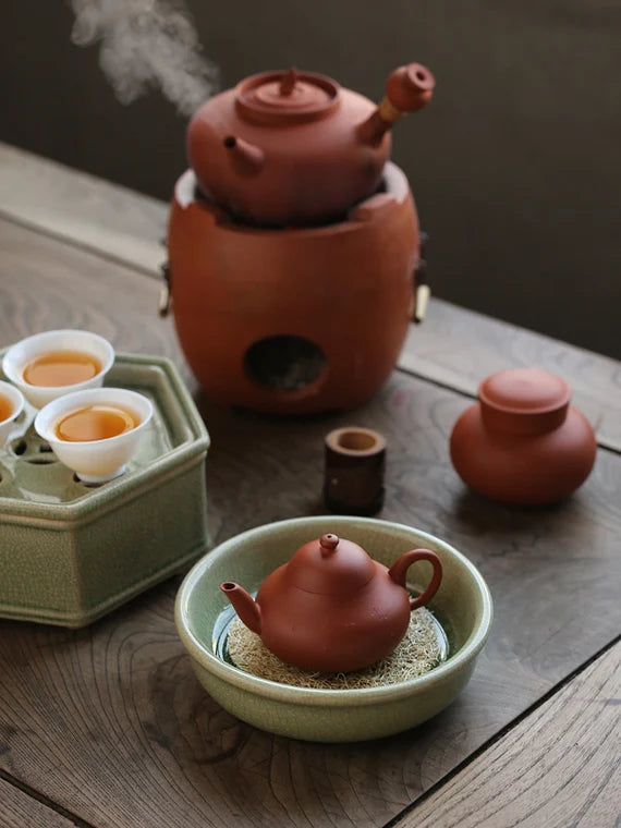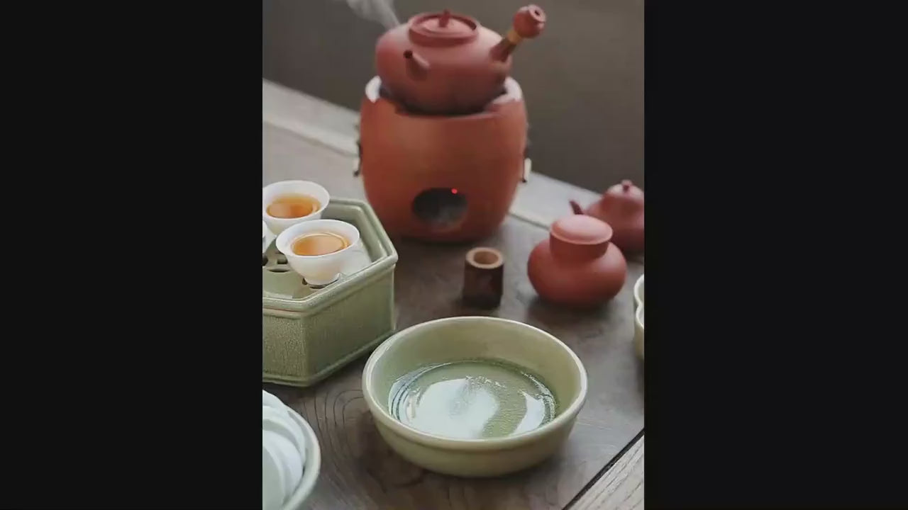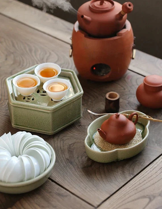 this antique style tray shows a very elegant antique gold wire of Zhang klin and crackled glazing beauty, in addition, the form of the ceramic tray is imitating the Chaozhou Gongfu tray style. The teapot holder embodies two Chinese traditional ceramic pieces of art and mixes them with harmony.