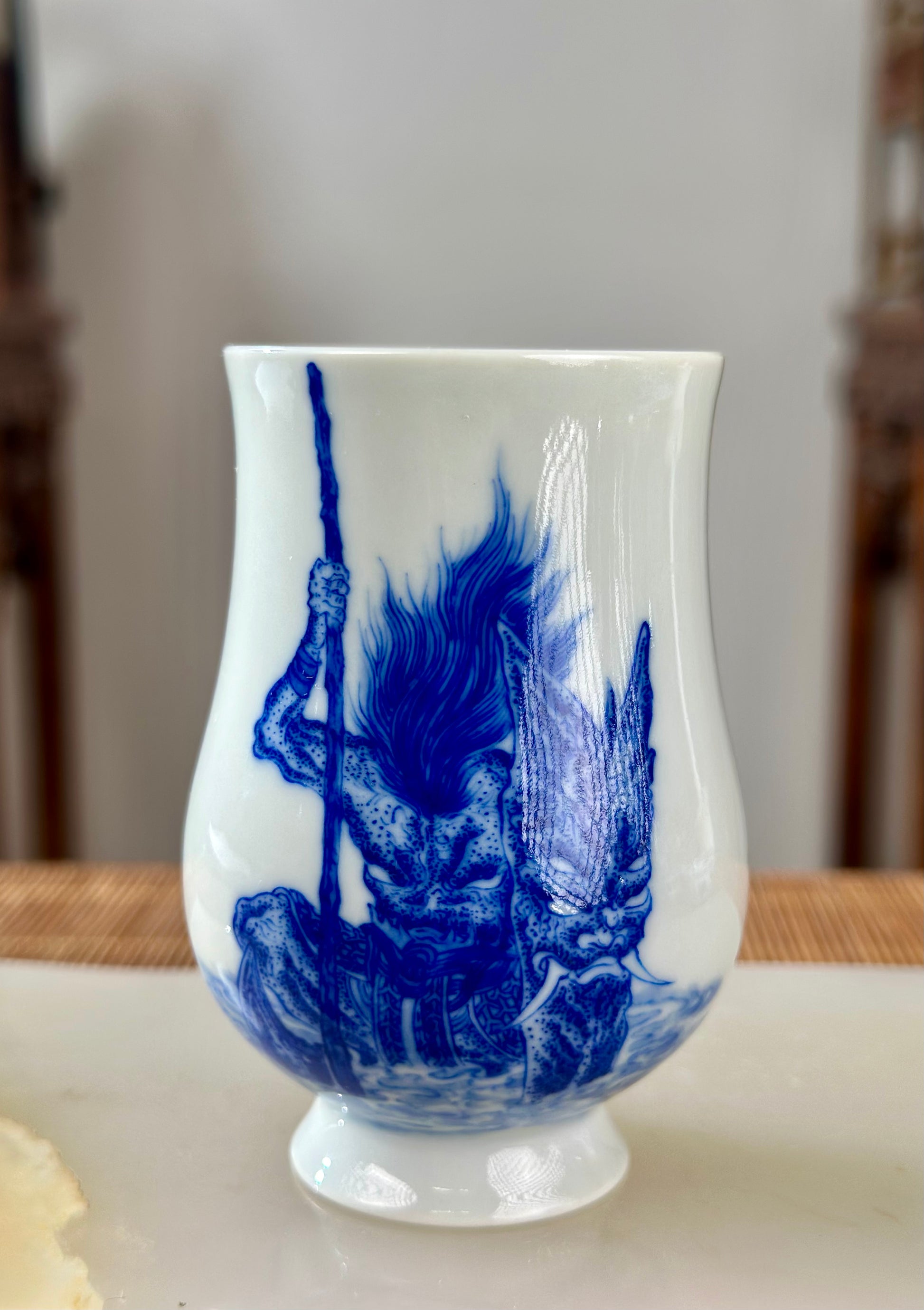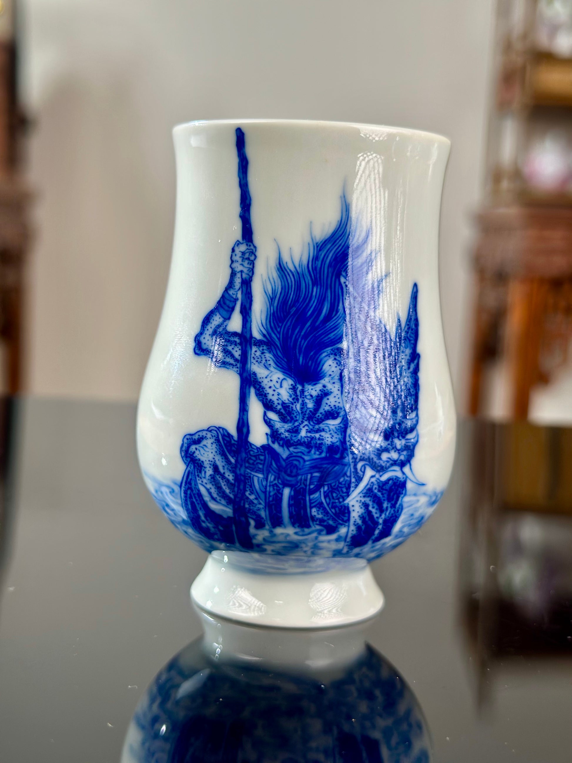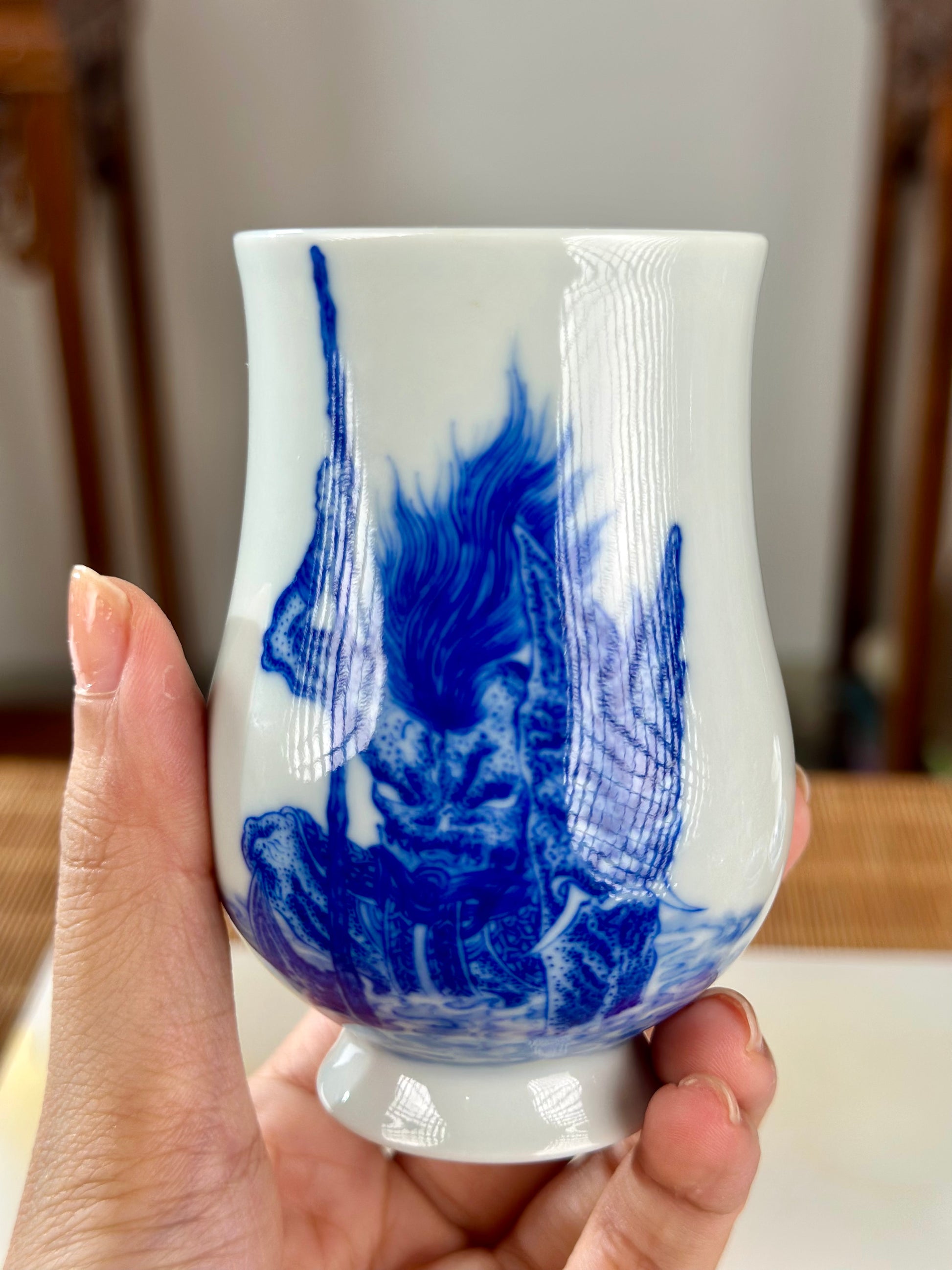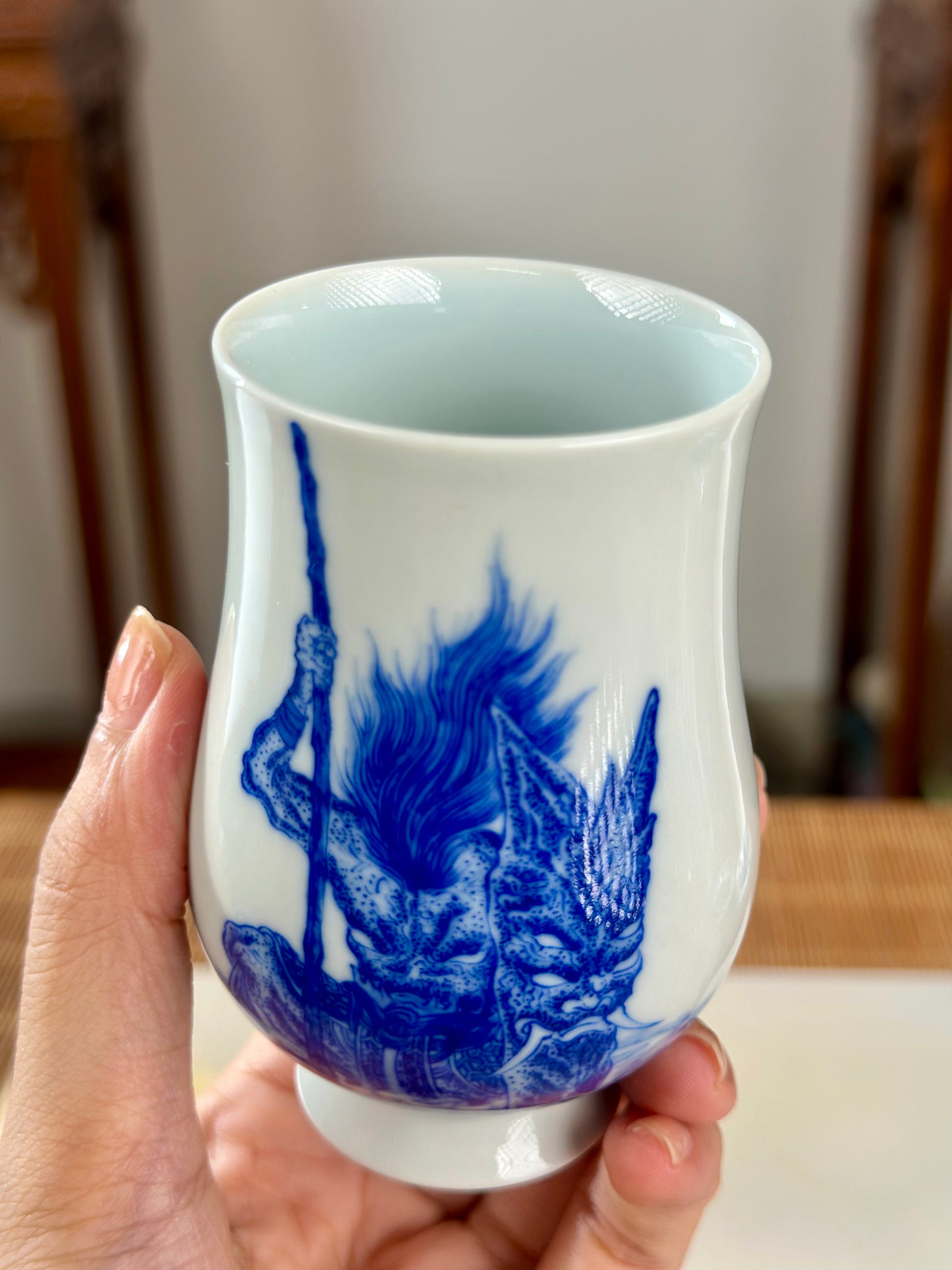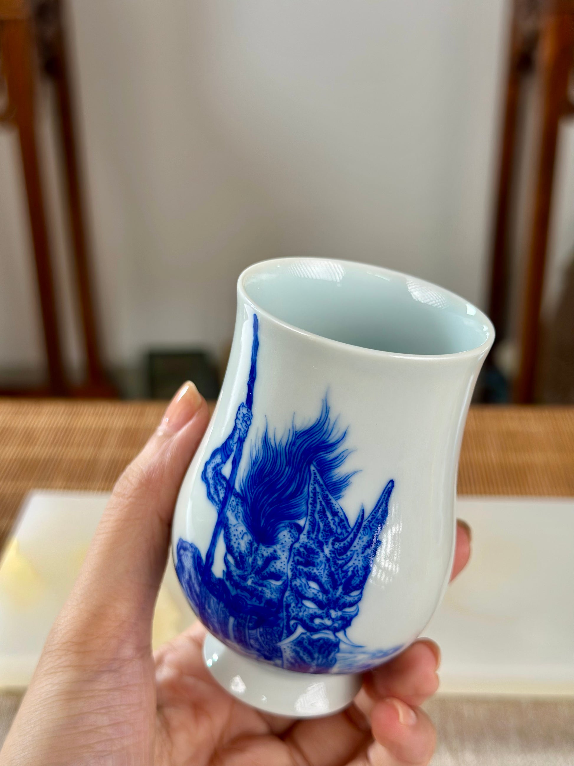 Hand Painted Chinese Blue And White Porcelain Classic Mythical Potrait Xingtian Teacup Jingdezhen Master Ceramic Artwork