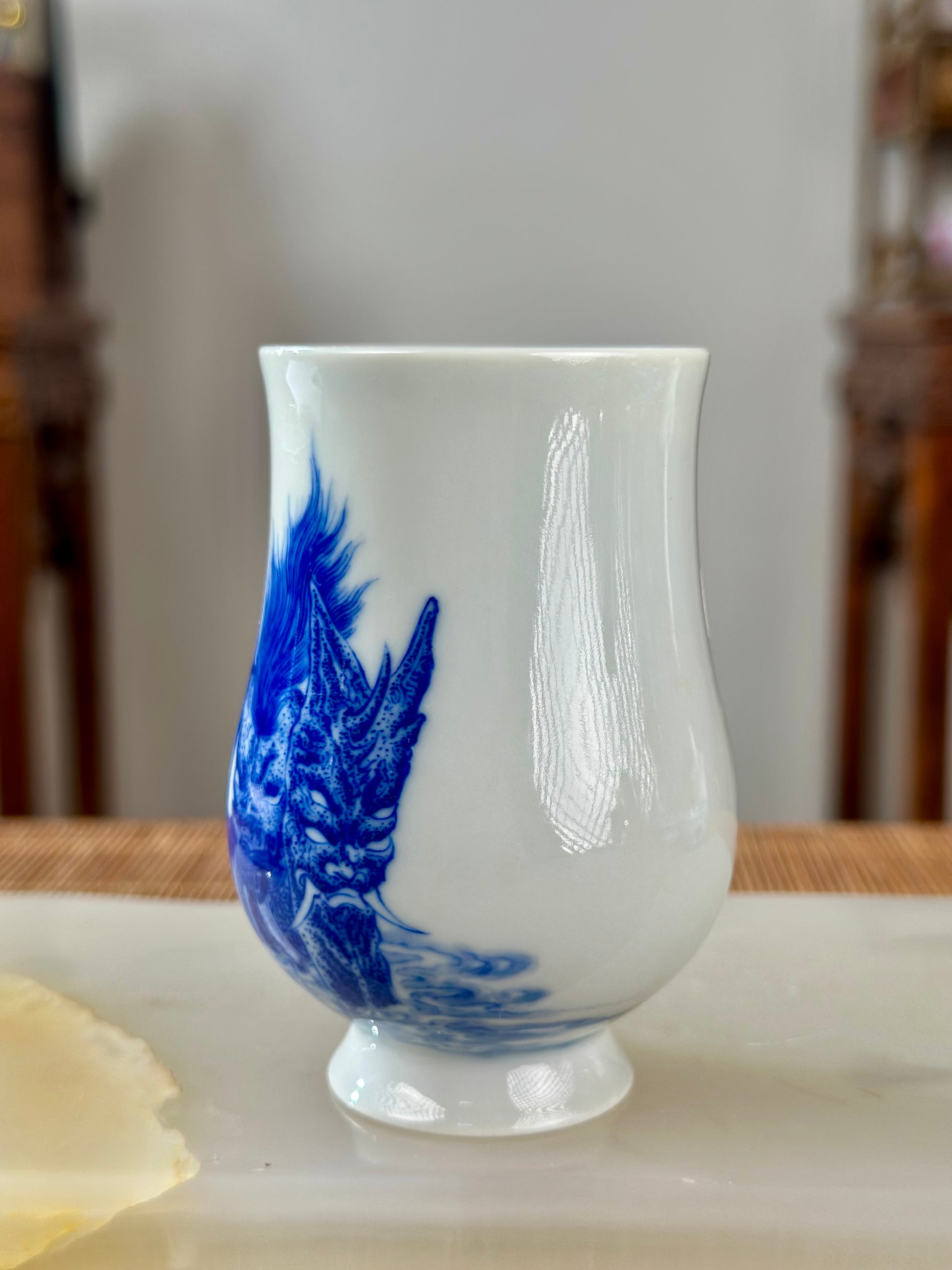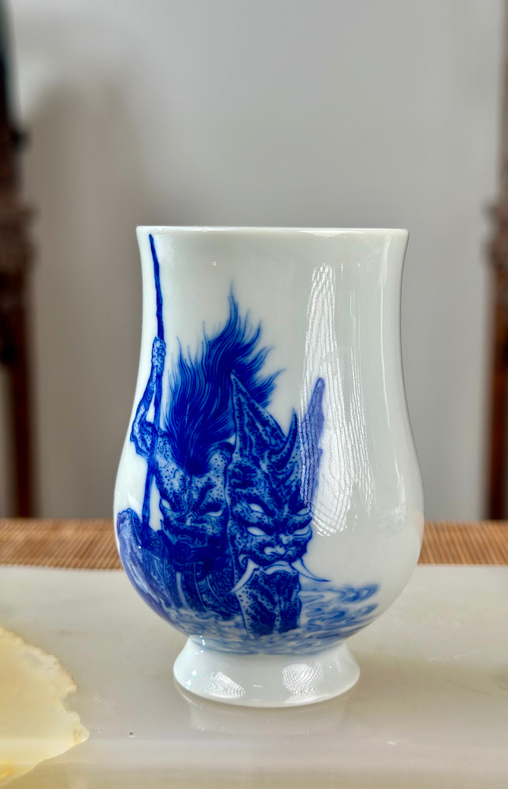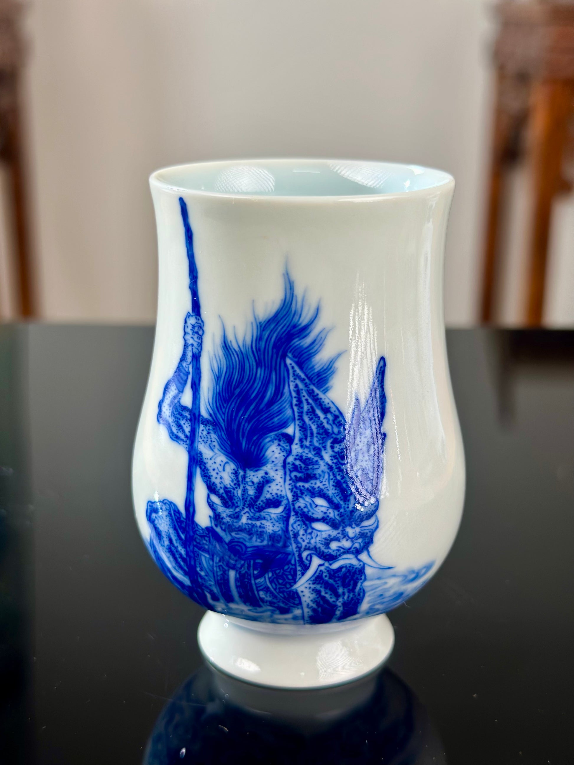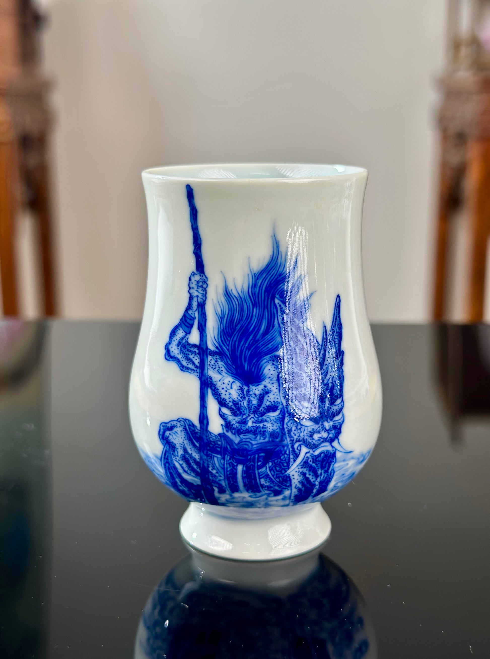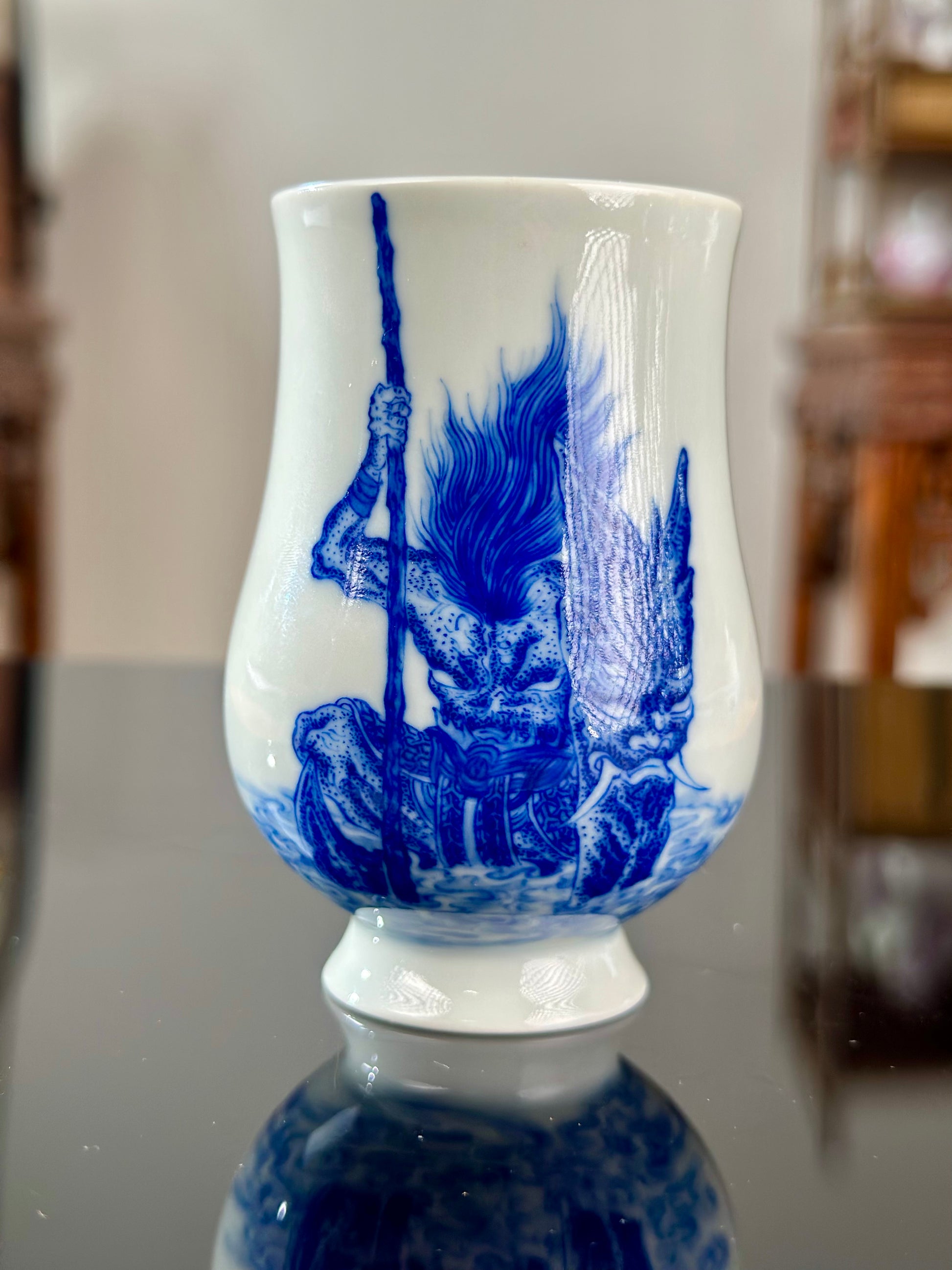 Hand Painted Chinese Blue And White Porcelain Classic Mythical Potrait Xingtian Teacup Jingdezhen Master Ceramic Artwork