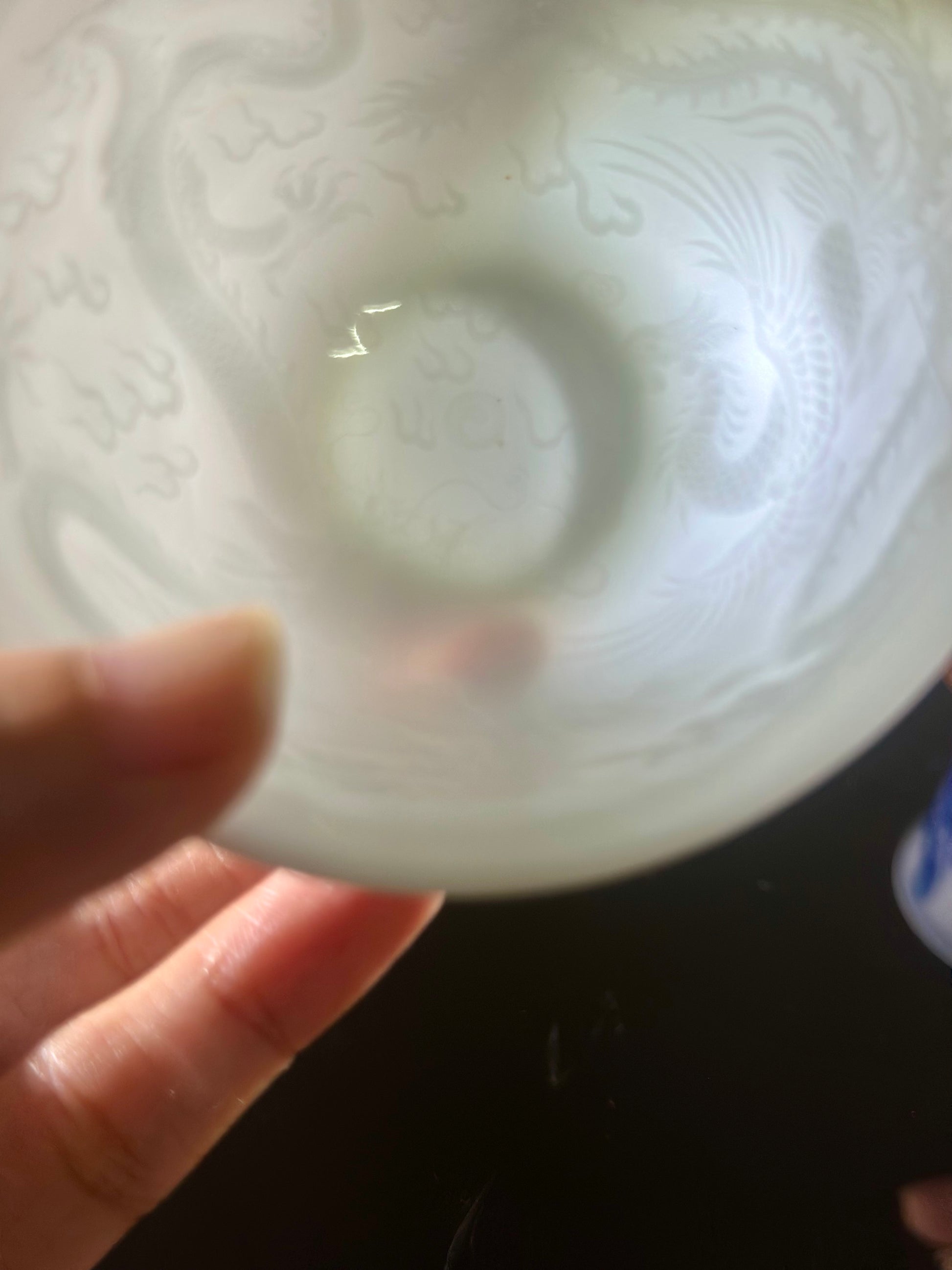 Is the inner engraved? At first glance, you might think it's a carved pattern, but it's not. The technique originated in the Song Dynasty. It was a decorative technique first popularized by the Ding kiln. It uses a semi-circular ceramic mold, inscribed with delicate patterns.