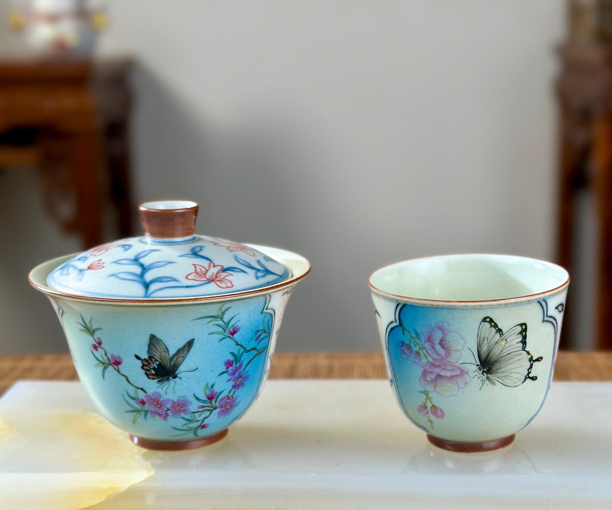 This Jingdezhen gaiwan is painted with a Chinese traditional Butterly in Love with Flowers. Imitating antique painting style. The structure is shaped like a classical Chinese window, and you can appreciate the beautiful view through it.