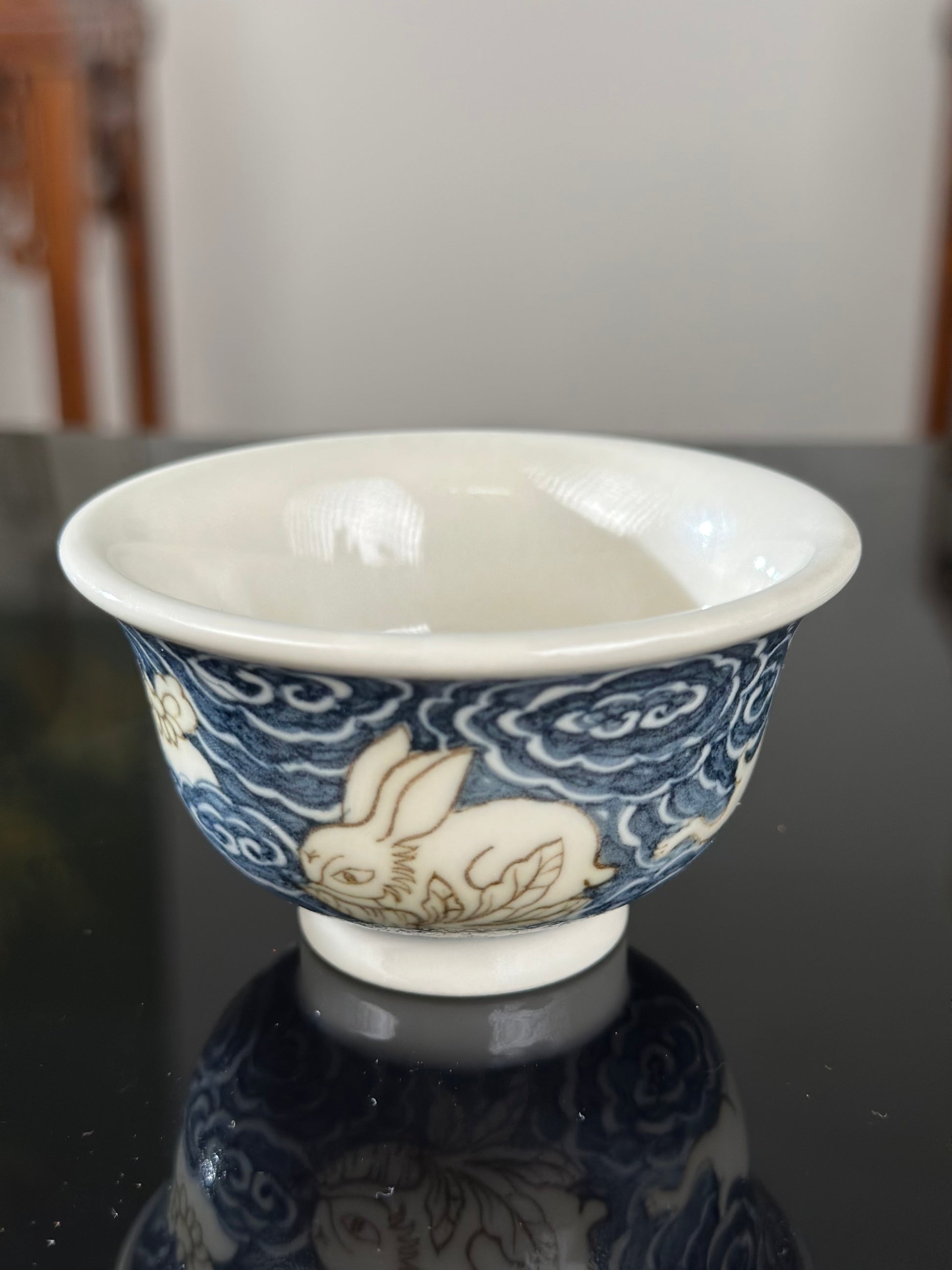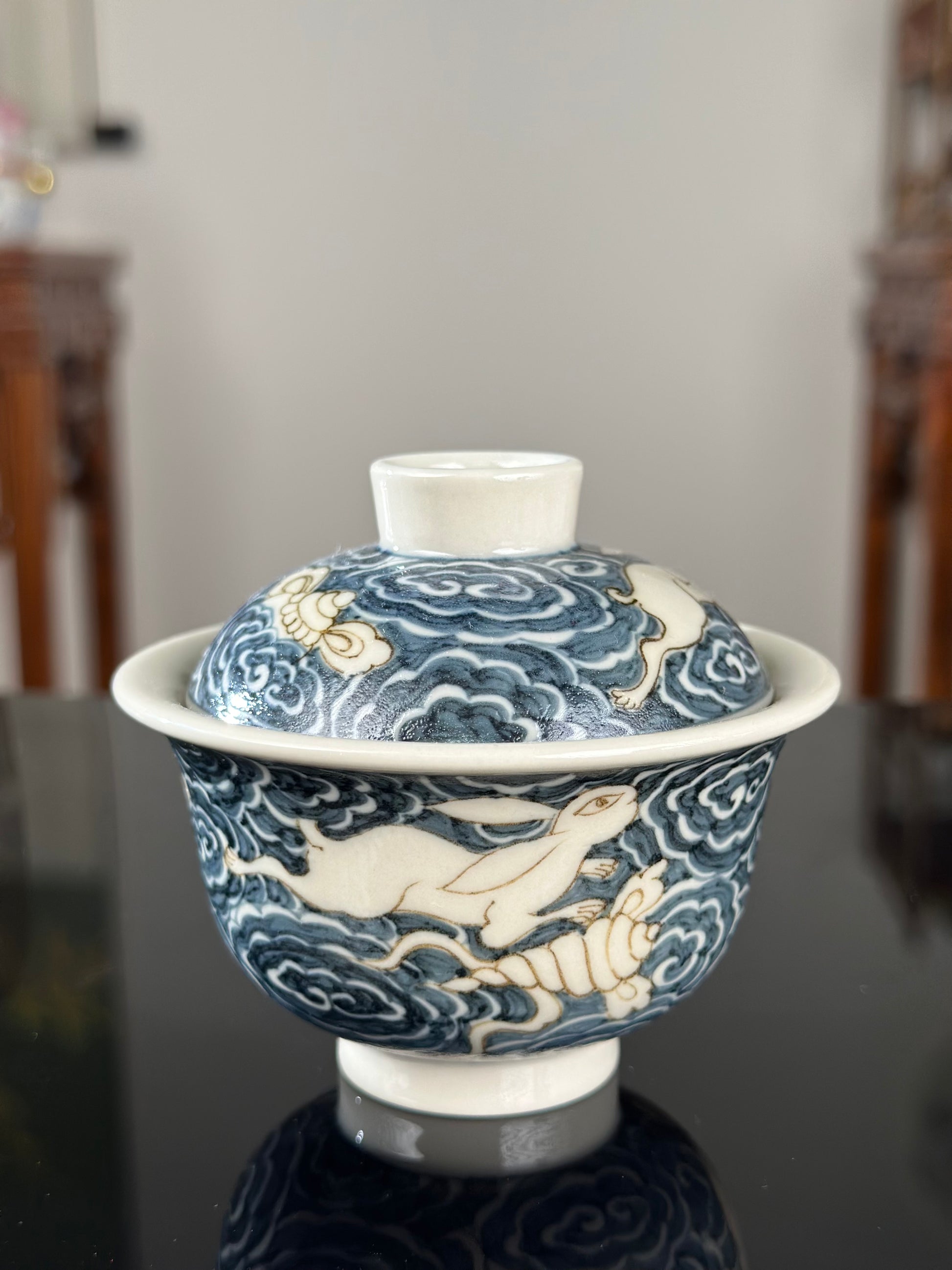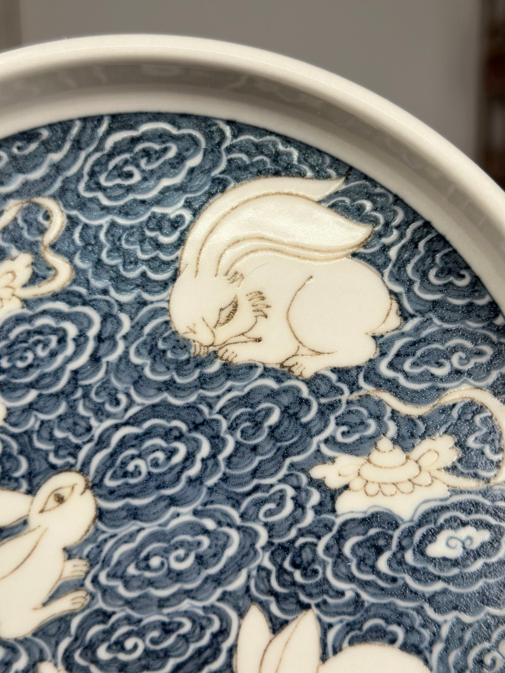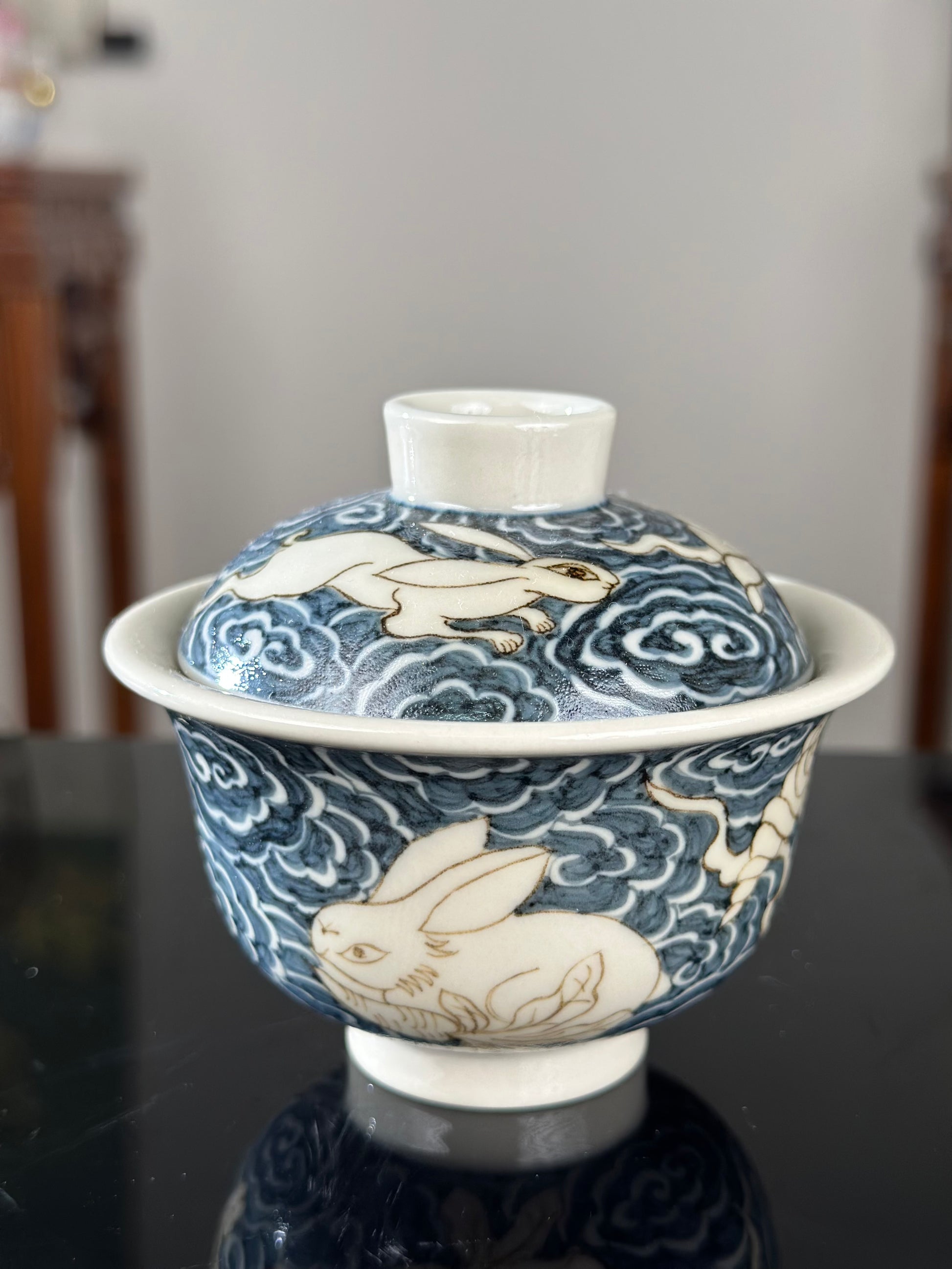 This extraordinary Underglaze Gold set is painted with a Chinese classical rabbit and treasure, ocean waves pattern. The "Assorted Treasures Rabbit" typically refers to a rabbit image that appears alongside various treasures in traditional auspicious patterns. This pattern typically symbolizes good fortune, wealth, longevity, and a multitude of children and grandchildren. The rabbit itself symbolizes gentleness, loveliness, and longevity in culture, and the combination of "Assorted Treasures" further enhances its symbolic meaning of wealth and prosperity.