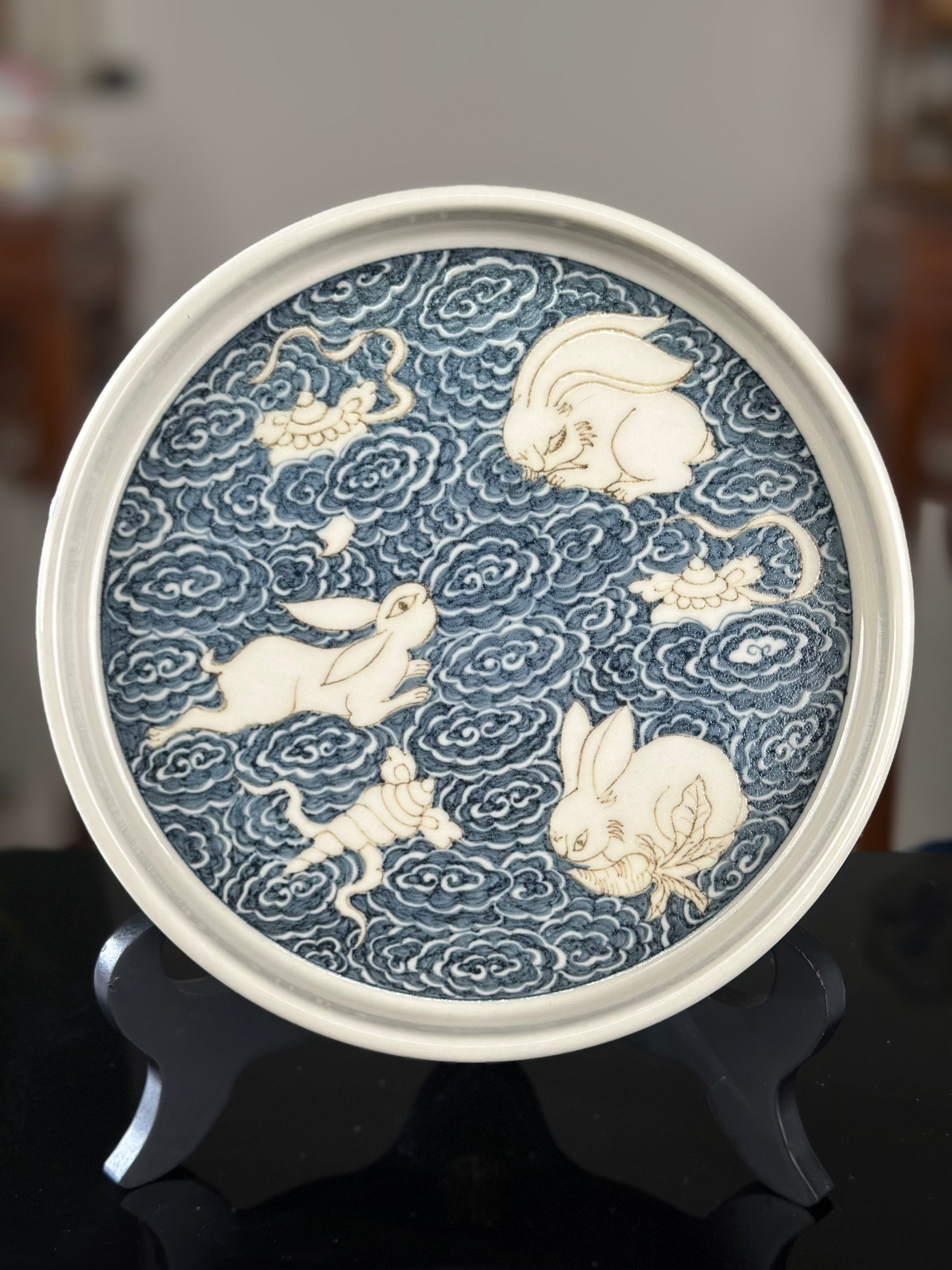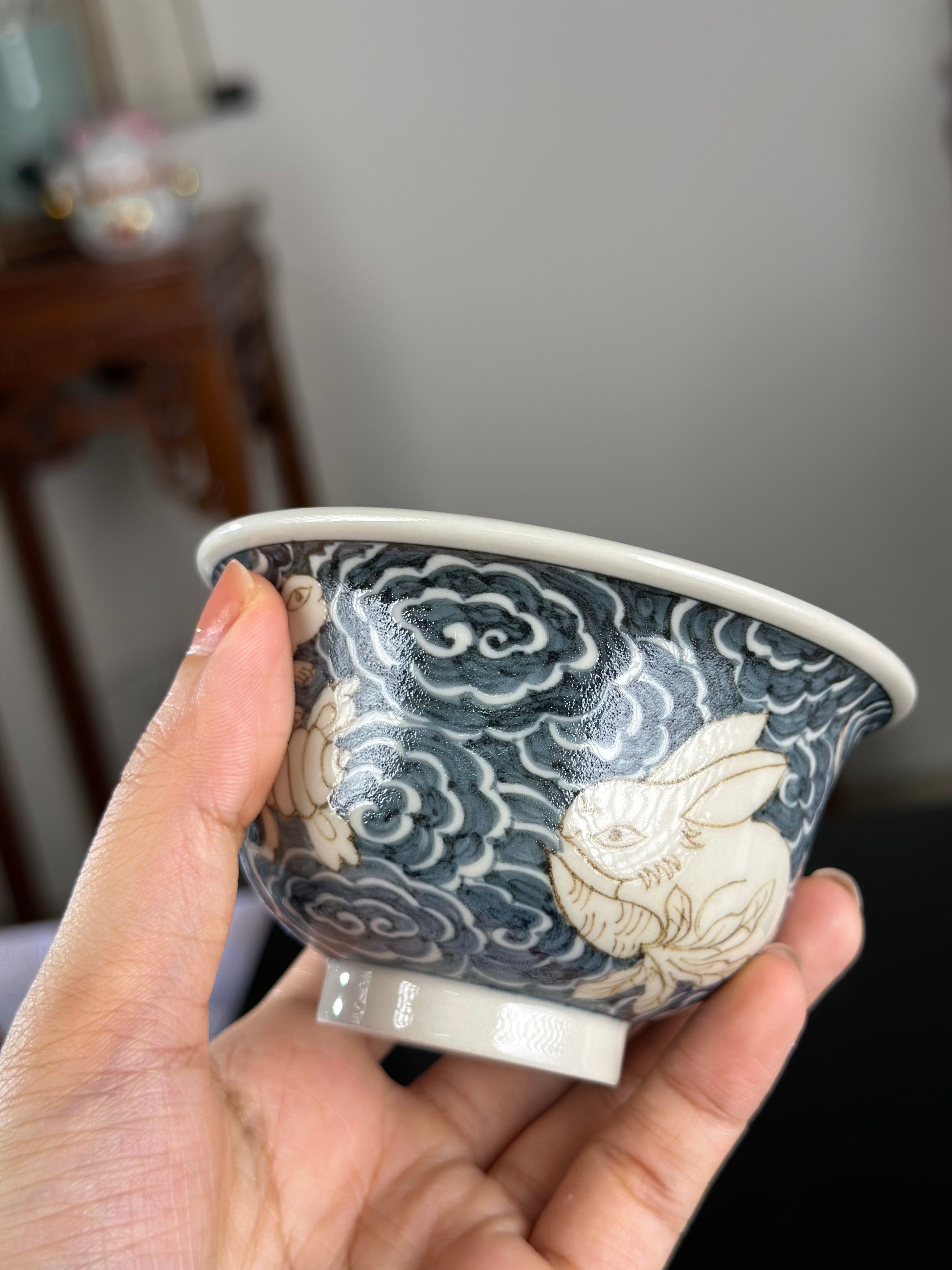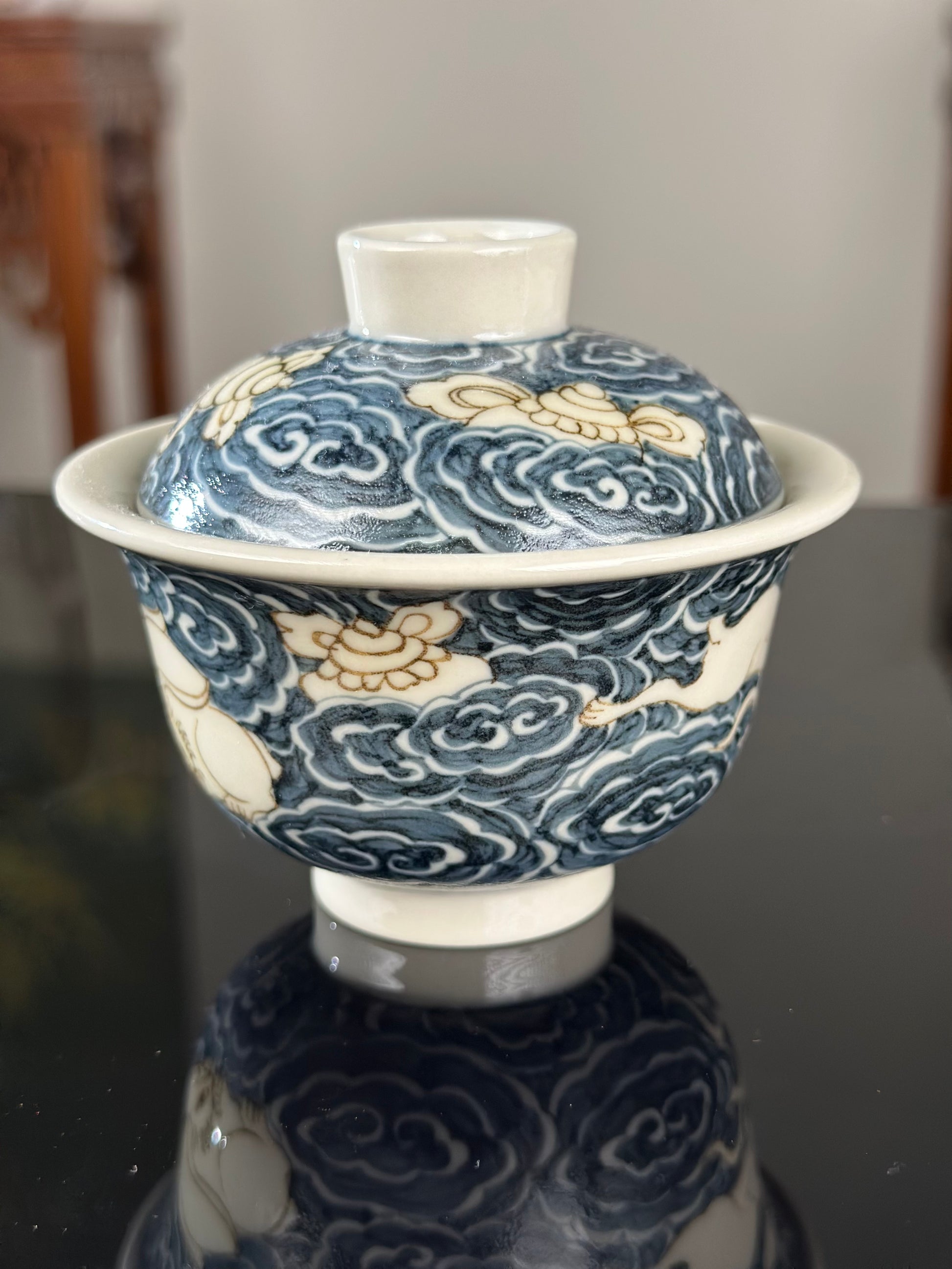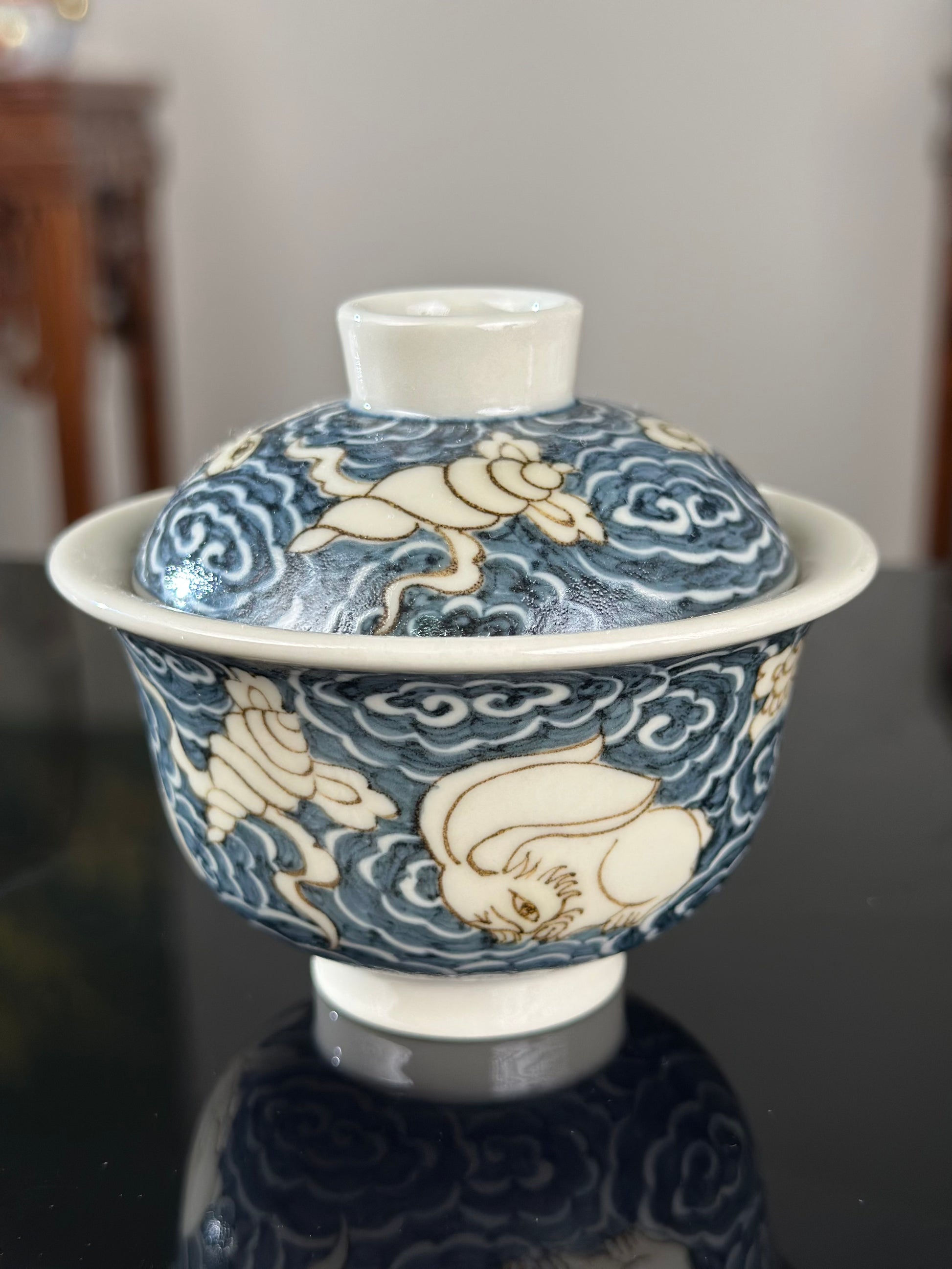 This extraordinary Underglaze Gold set is painted with a Chinese classical rabbit and treasure, ocean waves pattern. The "Assorted Treasures Rabbit" typically refers to a rabbit image that appears alongside various treasures in traditional auspicious patterns. This pattern typically symbolizes good fortune, wealth, longevity, and a multitude of children and grandchildren. The rabbit itself symbolizes gentleness, loveliness, and longevity in culture, and the combination of "Assorted Treasures" further enhances its symbolic meaning of wealth and prosperity.