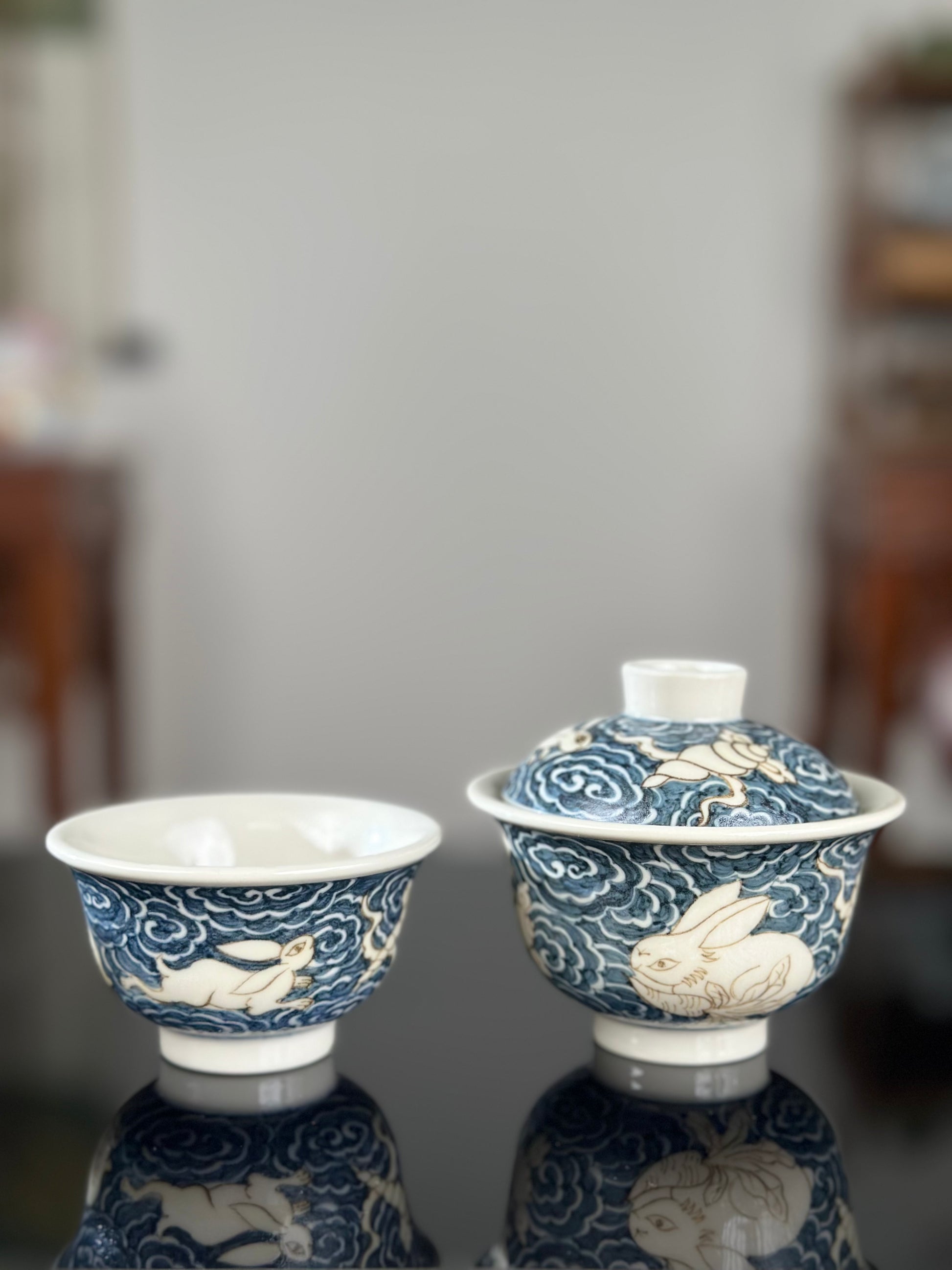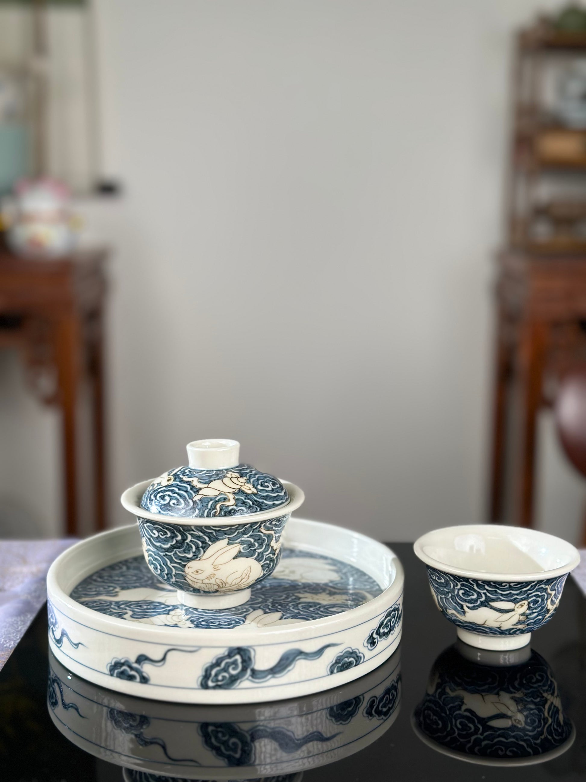Handpainted Chinese High End Blue White Porcelain Underglaze Gold Youlijin Rabbit Pattern Teacup Gaiwan Tray Set