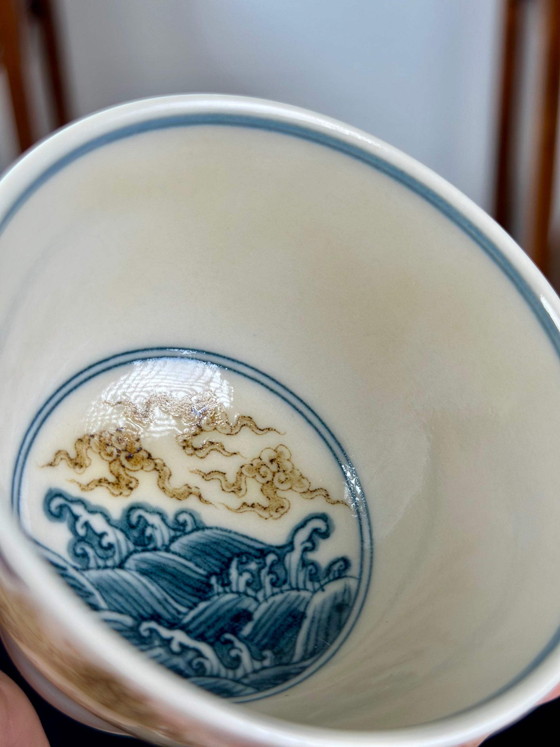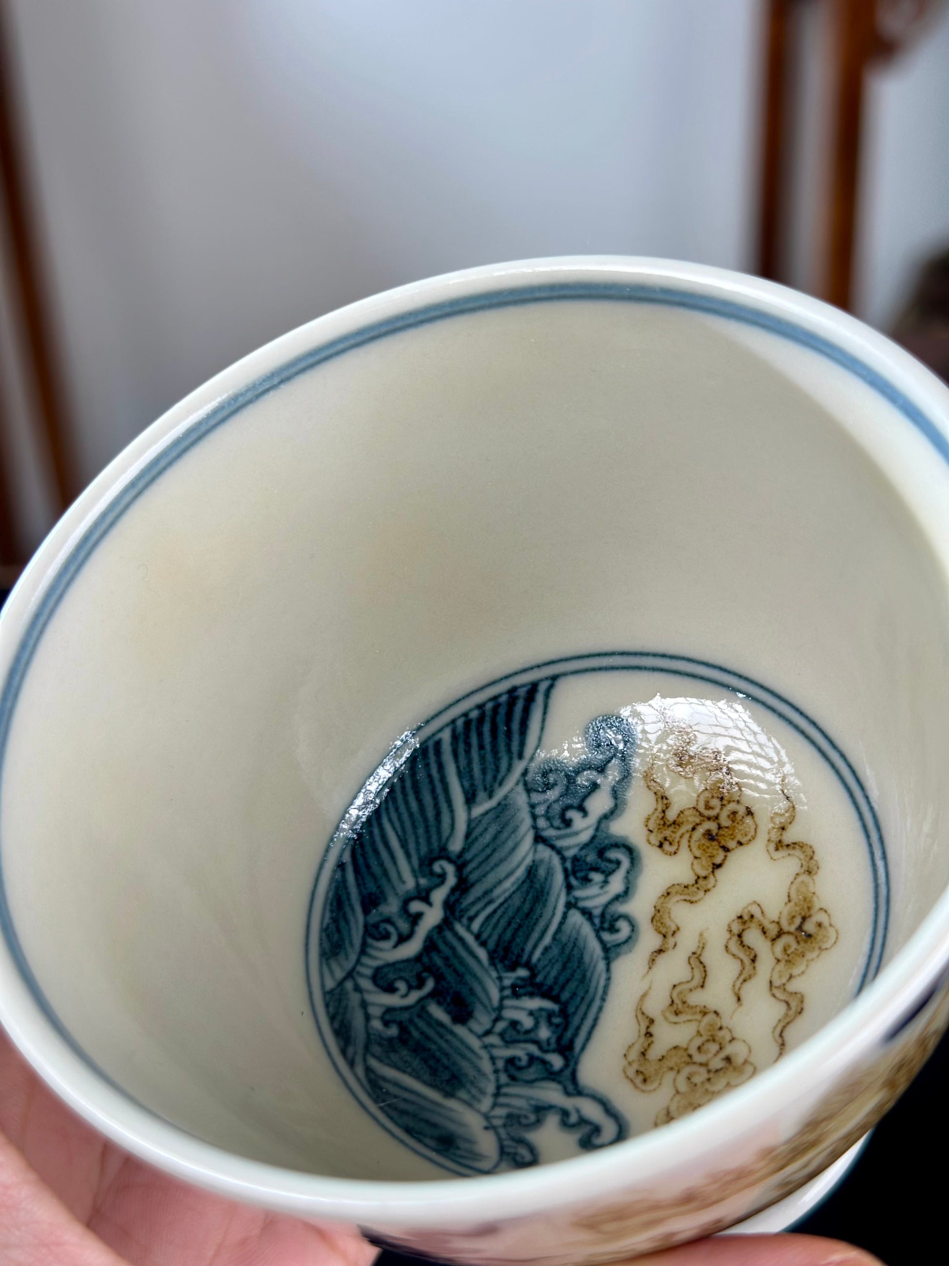 Handpainted Chinese Luxious Blue White Porcelain Underglaze Gold Youlijin Classic Xuande Double Dragon Pattern Artwork Teacup