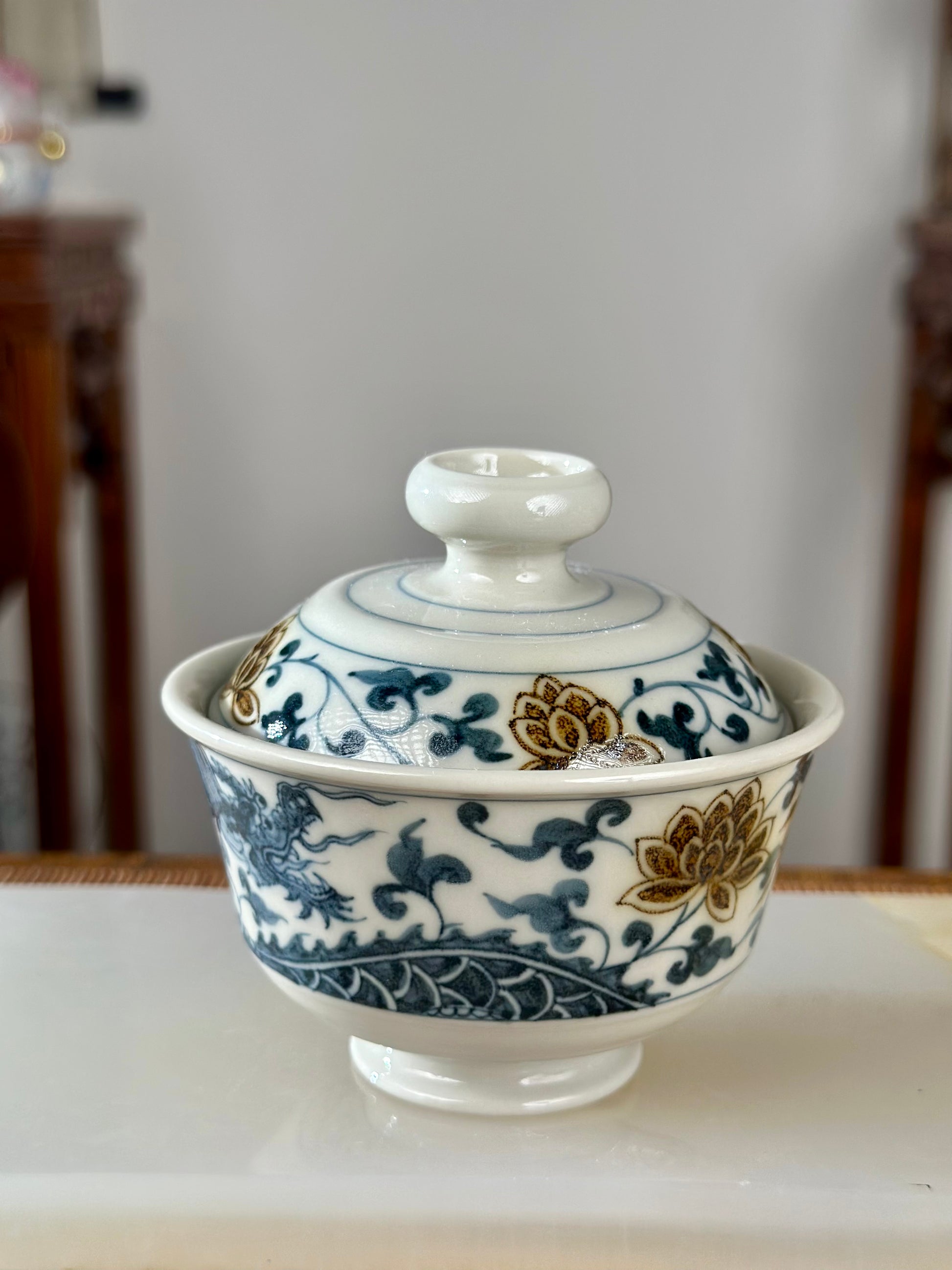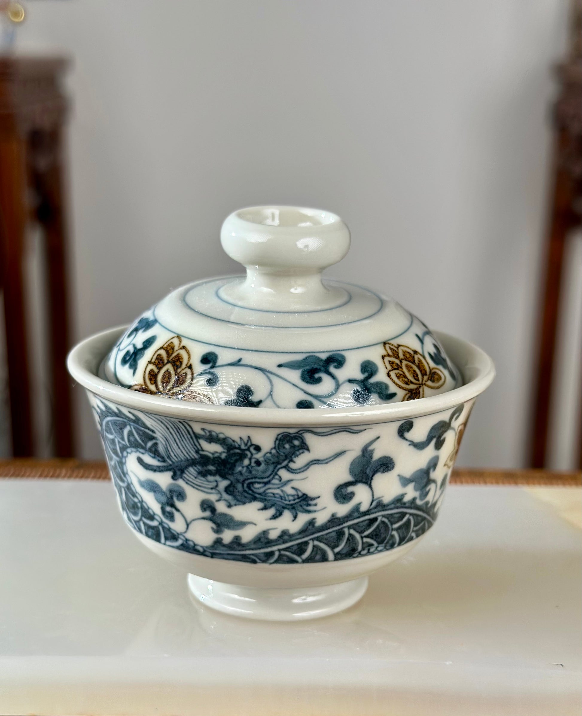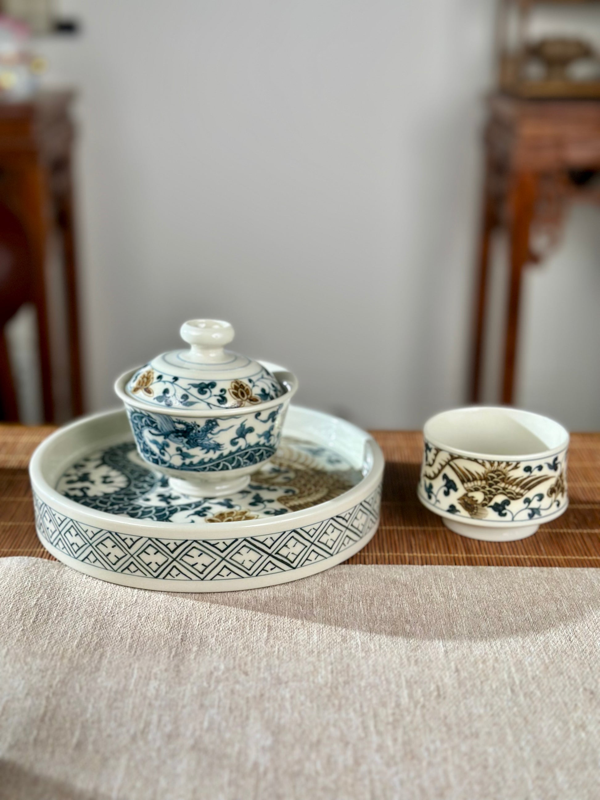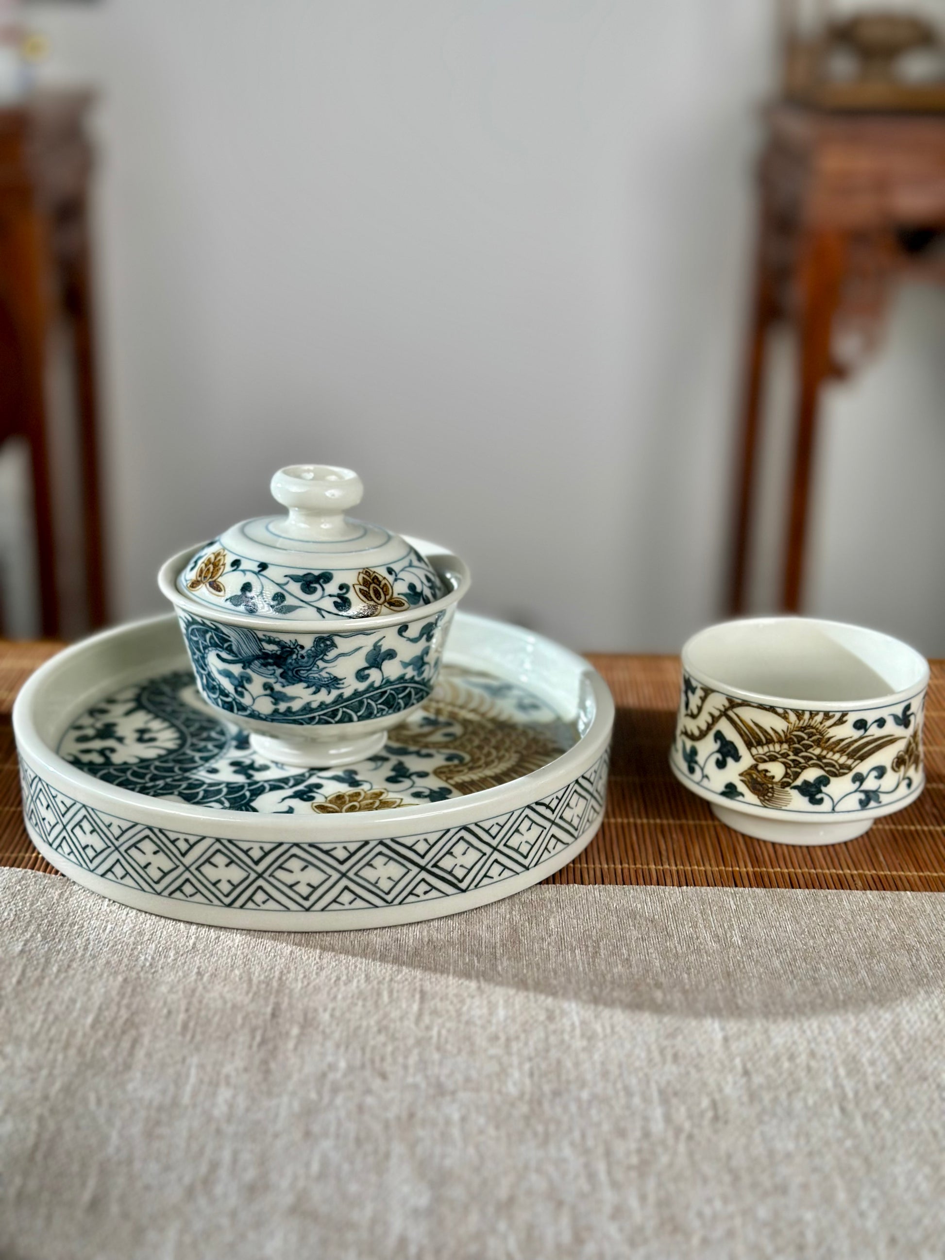 Handpainted Chinese Luxious Blue White Porcelain Underglaze Gold Youlijin Dragon Phoenix Gaiwan Set Artwork Teacup Tea Tray