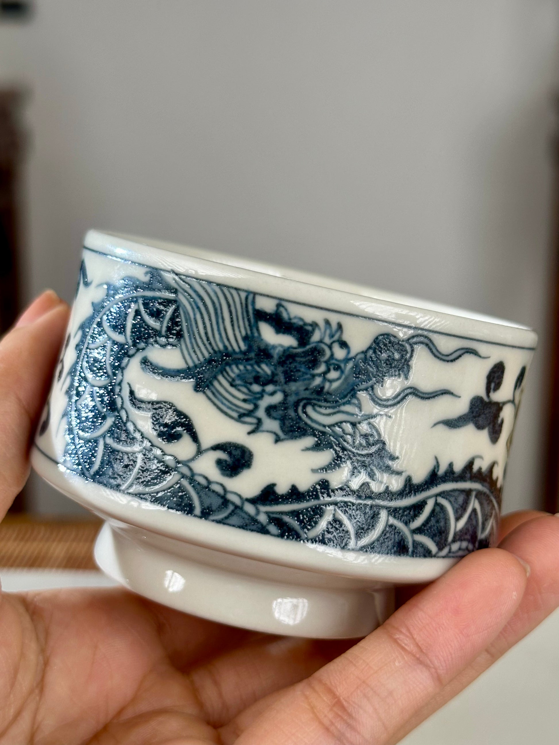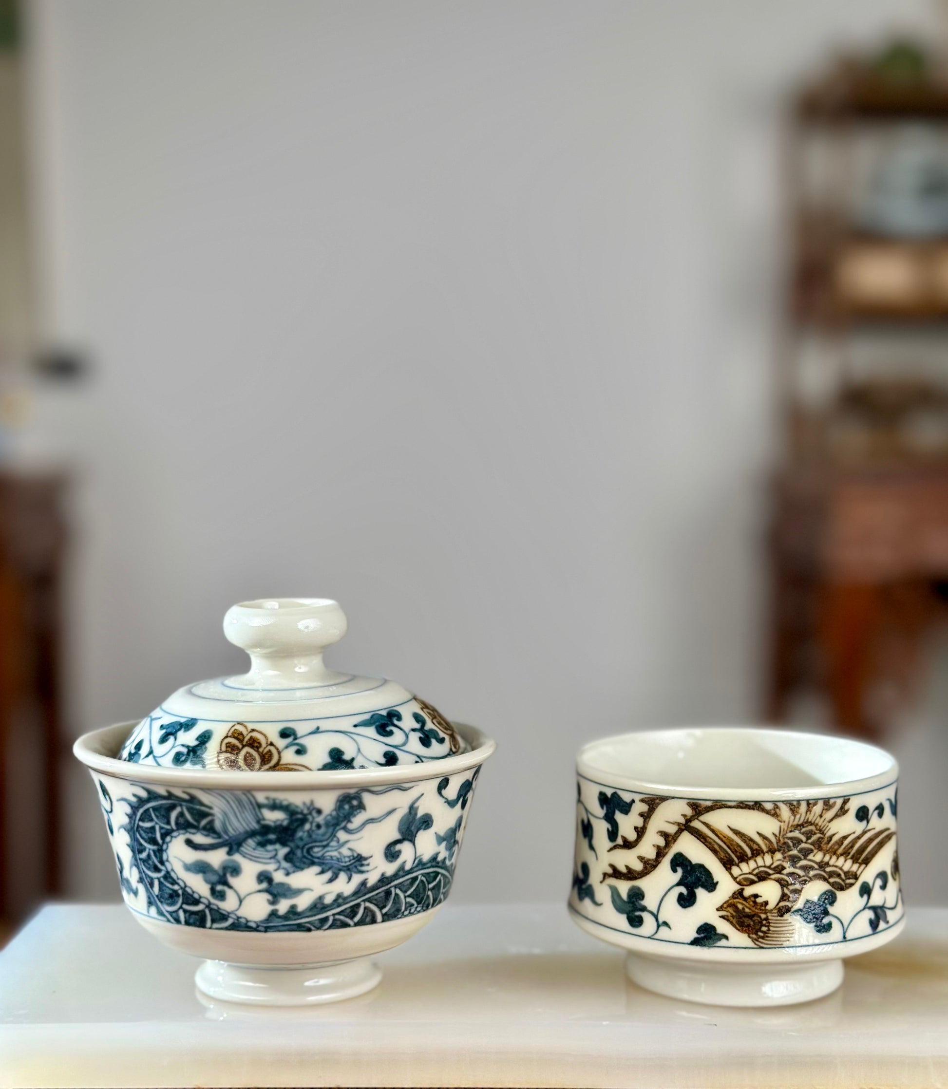 This extraordinary set is applied with two Chinese craftsmanship Blue White Porcelain and Underglaze Gold, painted with Chinese traditional auspicious pattern Dragon and Phoenix.