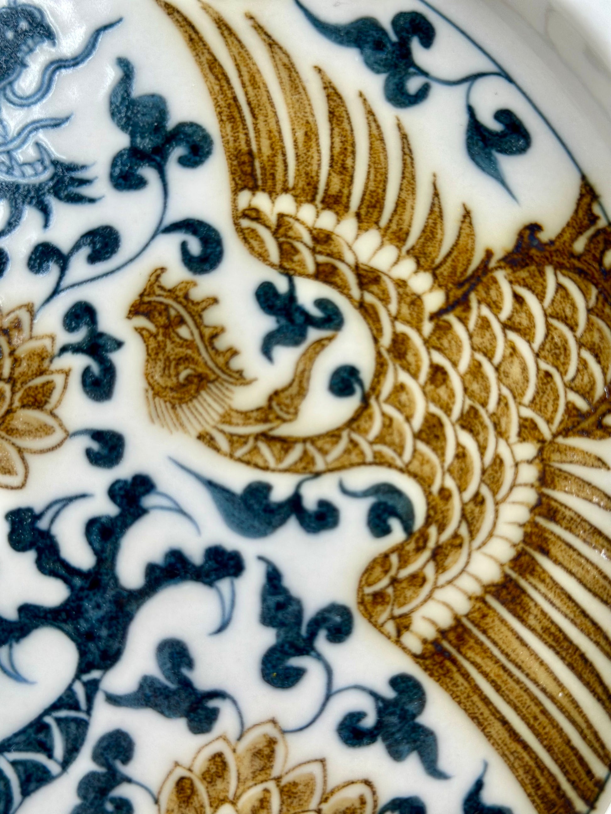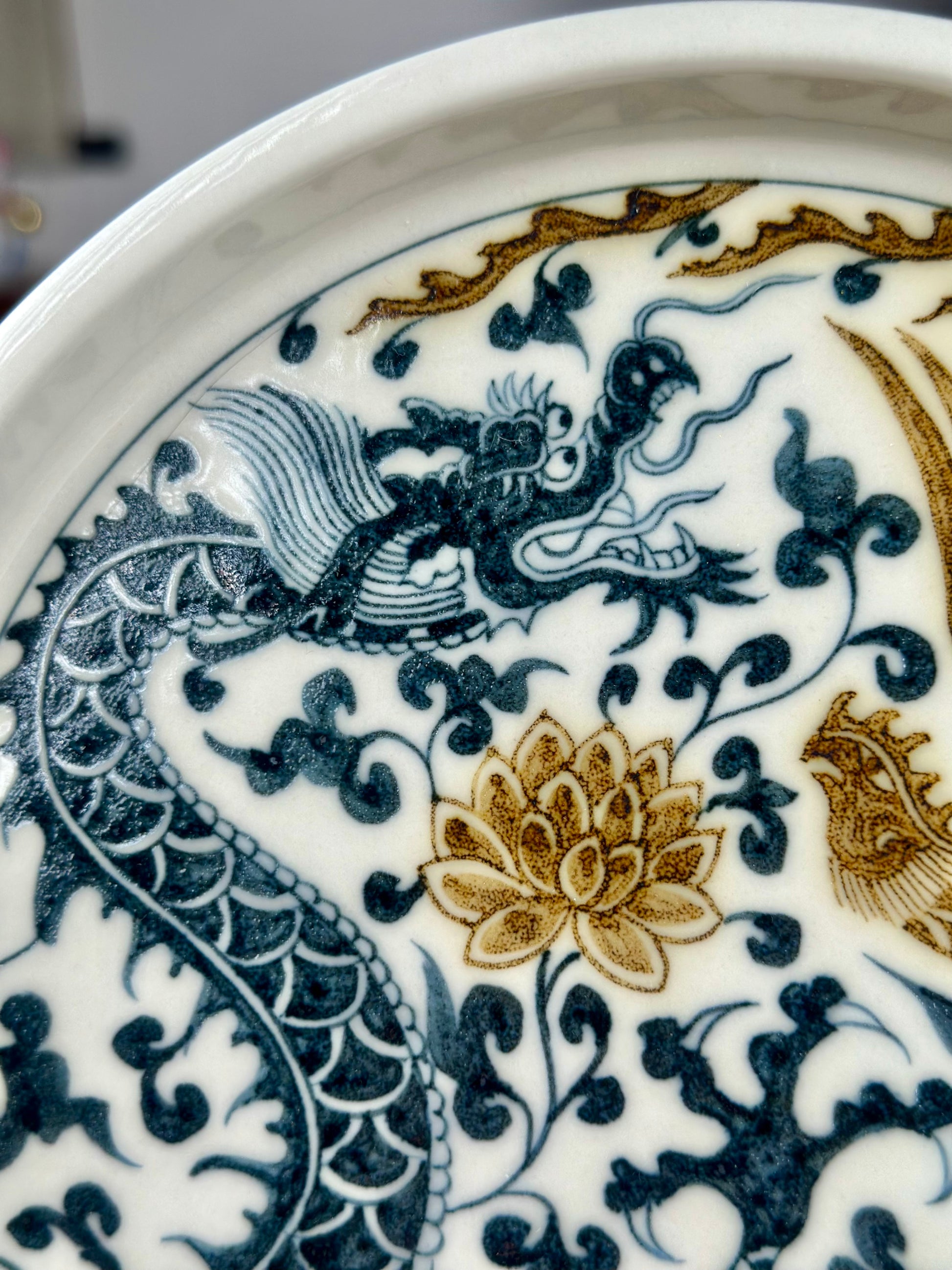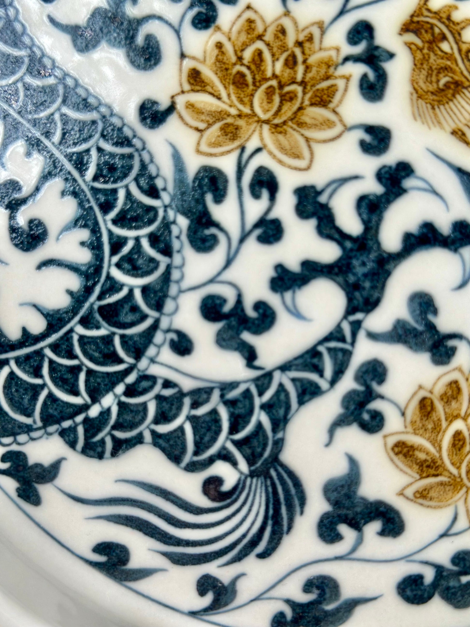 Underglaze gold is a special material used in the underglaze color process. It is mainly composed of precious metals such as gold and copper, and has the characteristics of low manganese and high iron. This process is a breakthrough made by contemporary kilns in Jingdezhen in the field of underglaze color. Currently, only a few kilns have mastered this technology, and the formula and process are usually regarded as the core secrets of each kiln. The characteristics of underglaze gold are that there are bubbles of varying sizes on the glaze surface, and gold is hidden under the glaze, showing the effect of eating the body and swallowing the glaze. When you touch it with your hand, you will feel bumpy, just like carving.