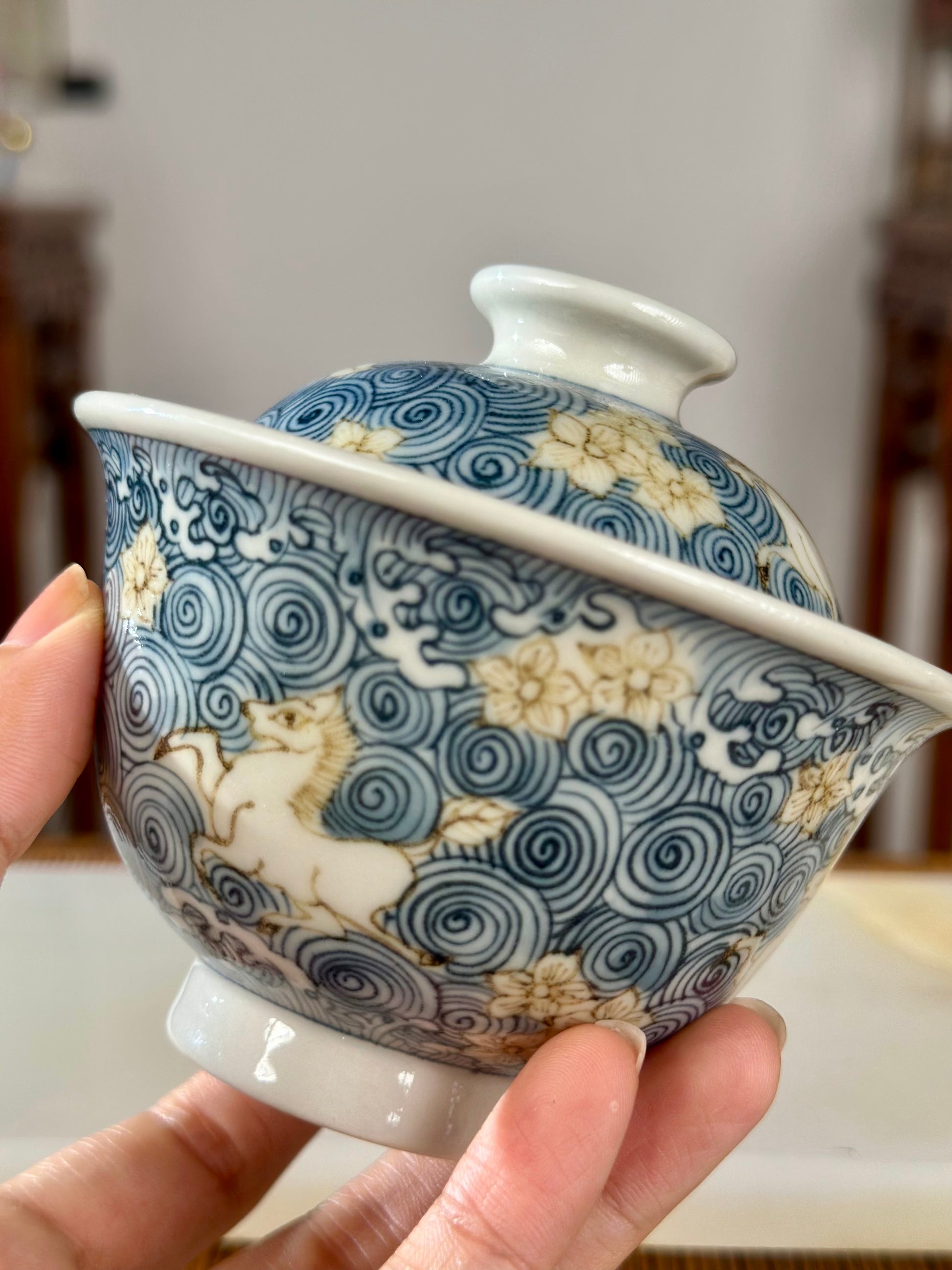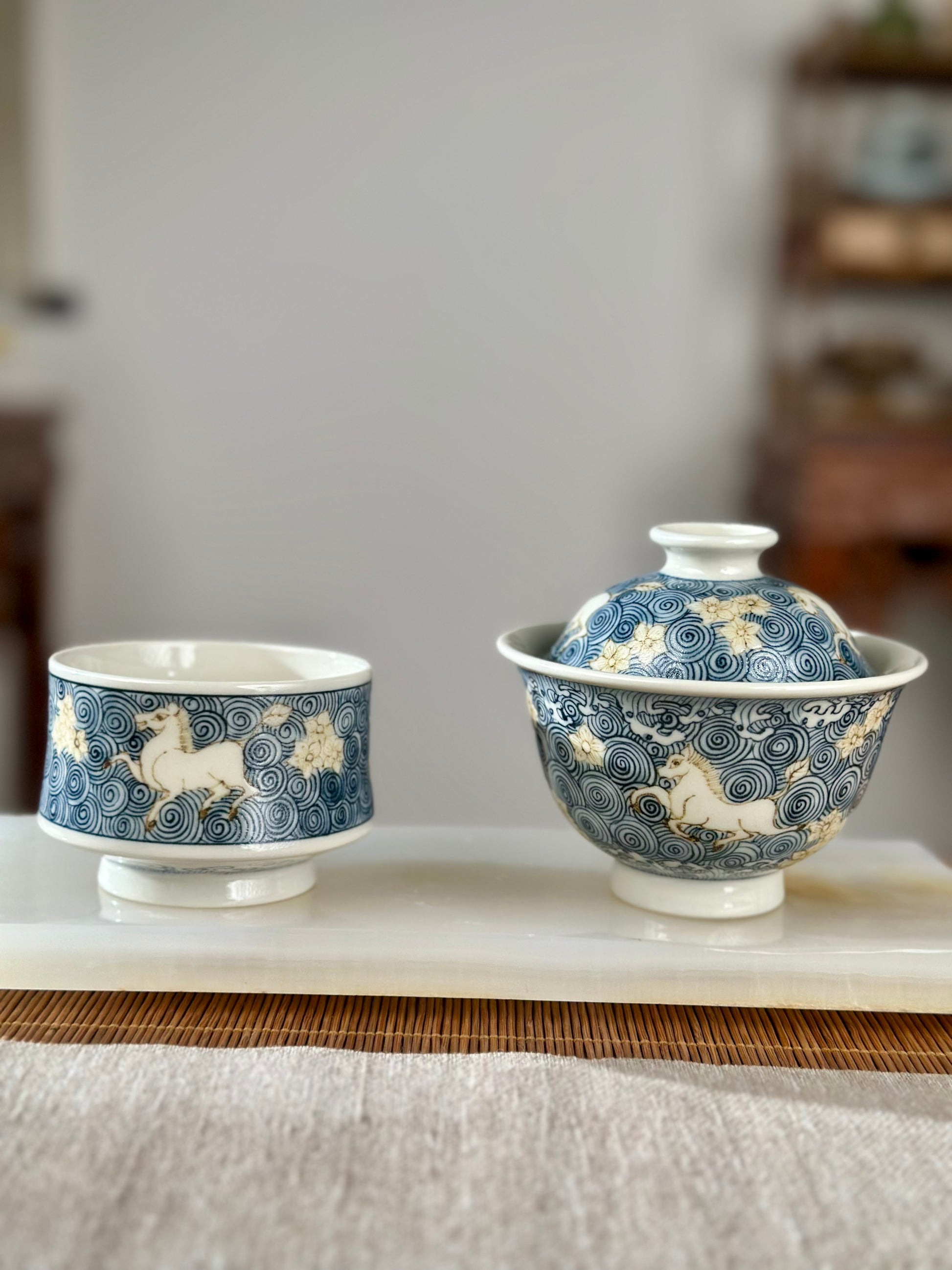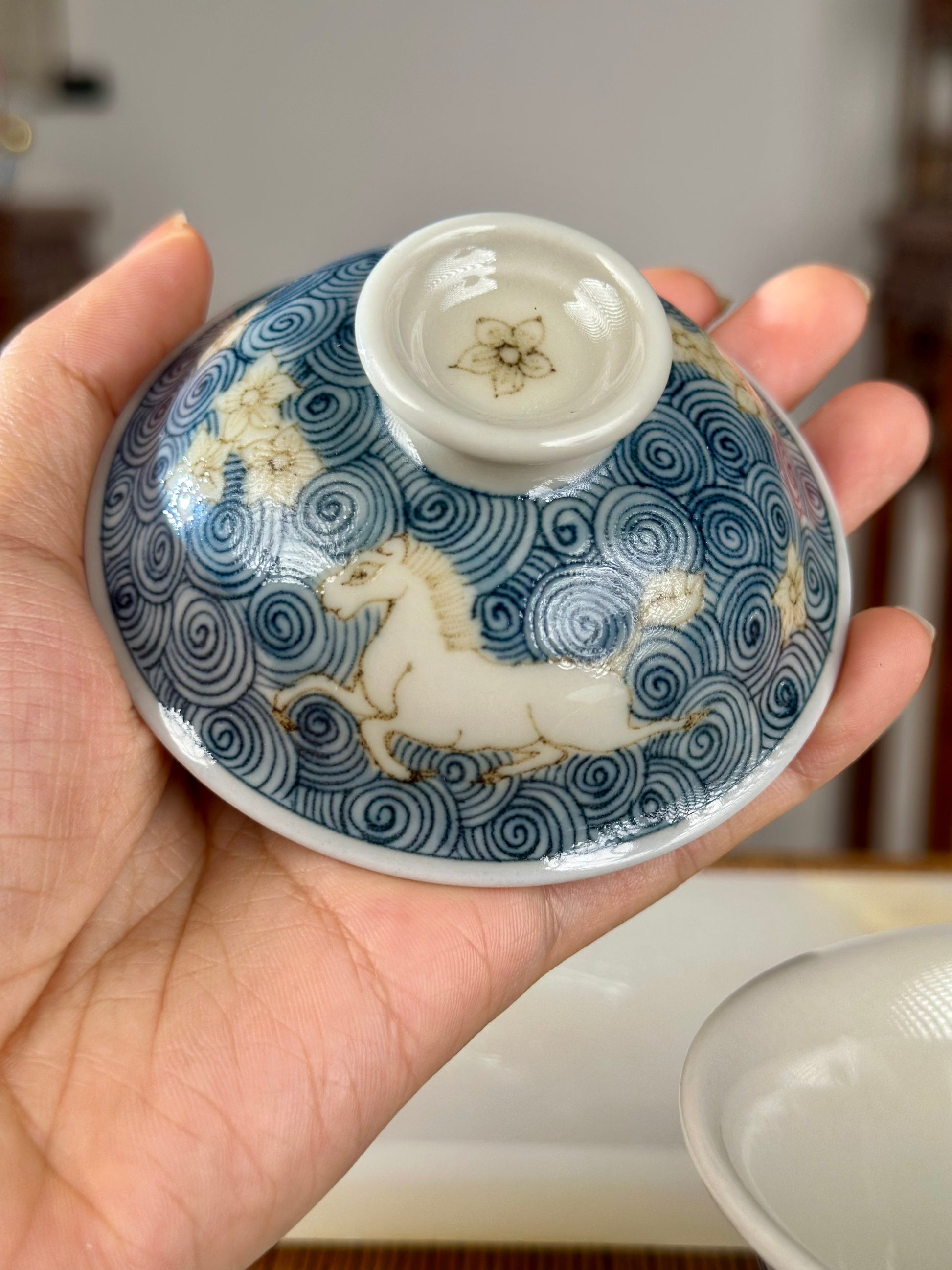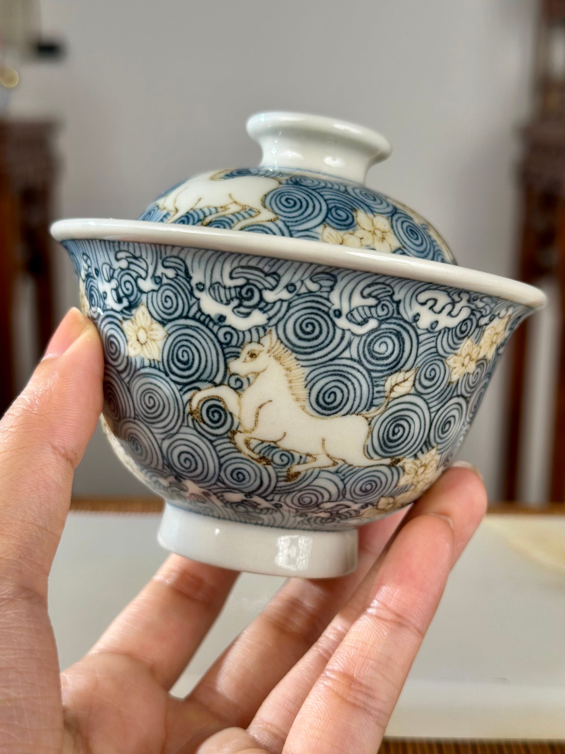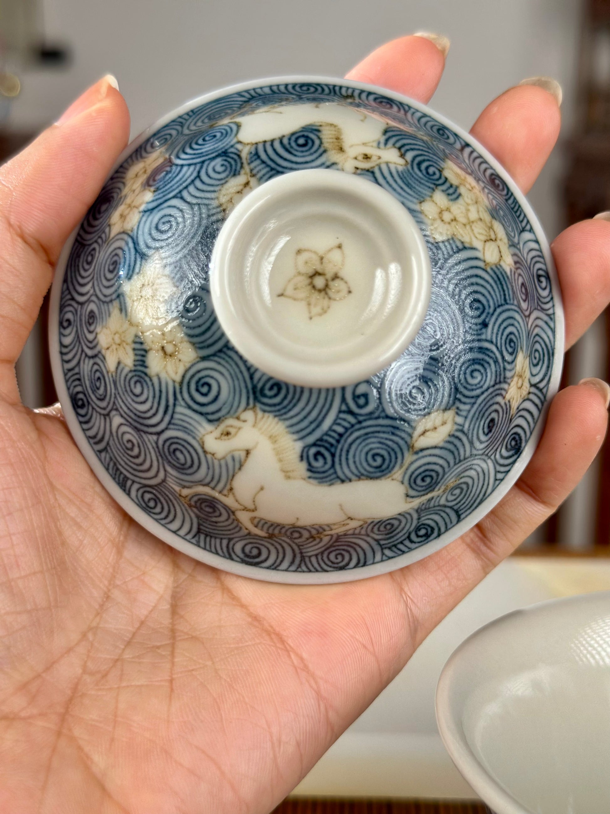 Handpainted Chinese Luxious Blue White Porcelain Underglaze Gold Youlijin Horse Flower Ocean Wave Pattern Gaiwan Set Artwork Teacup
