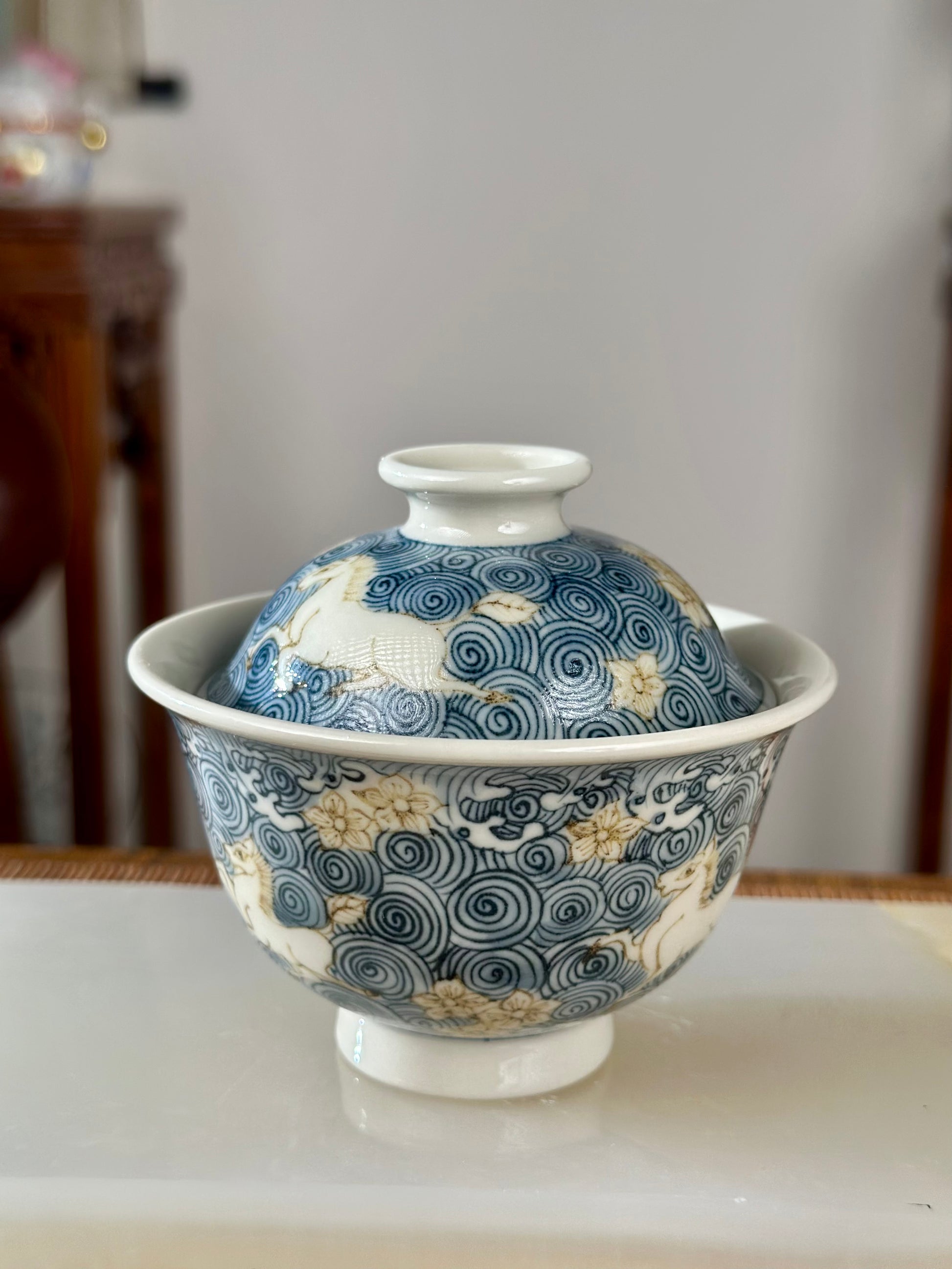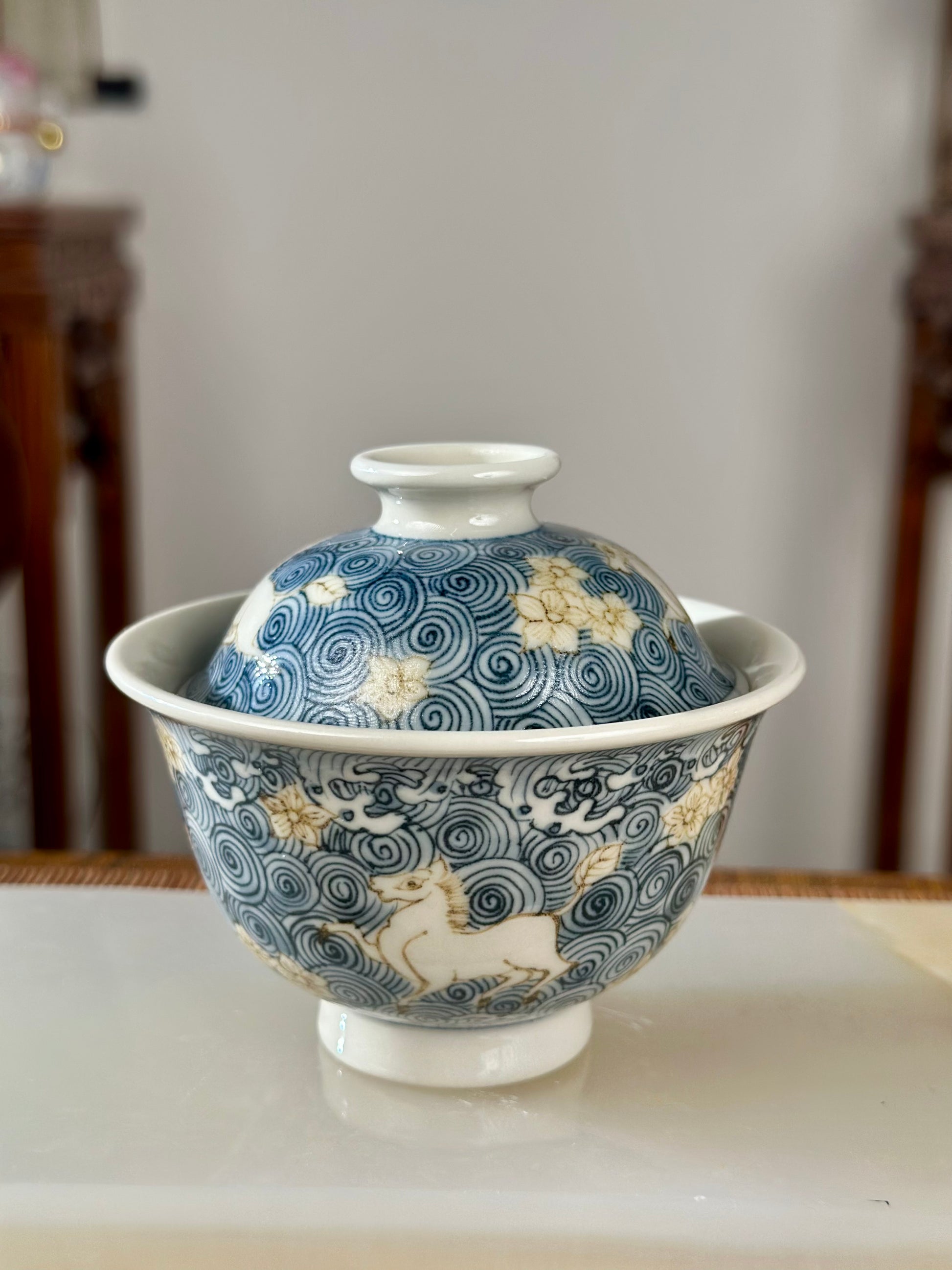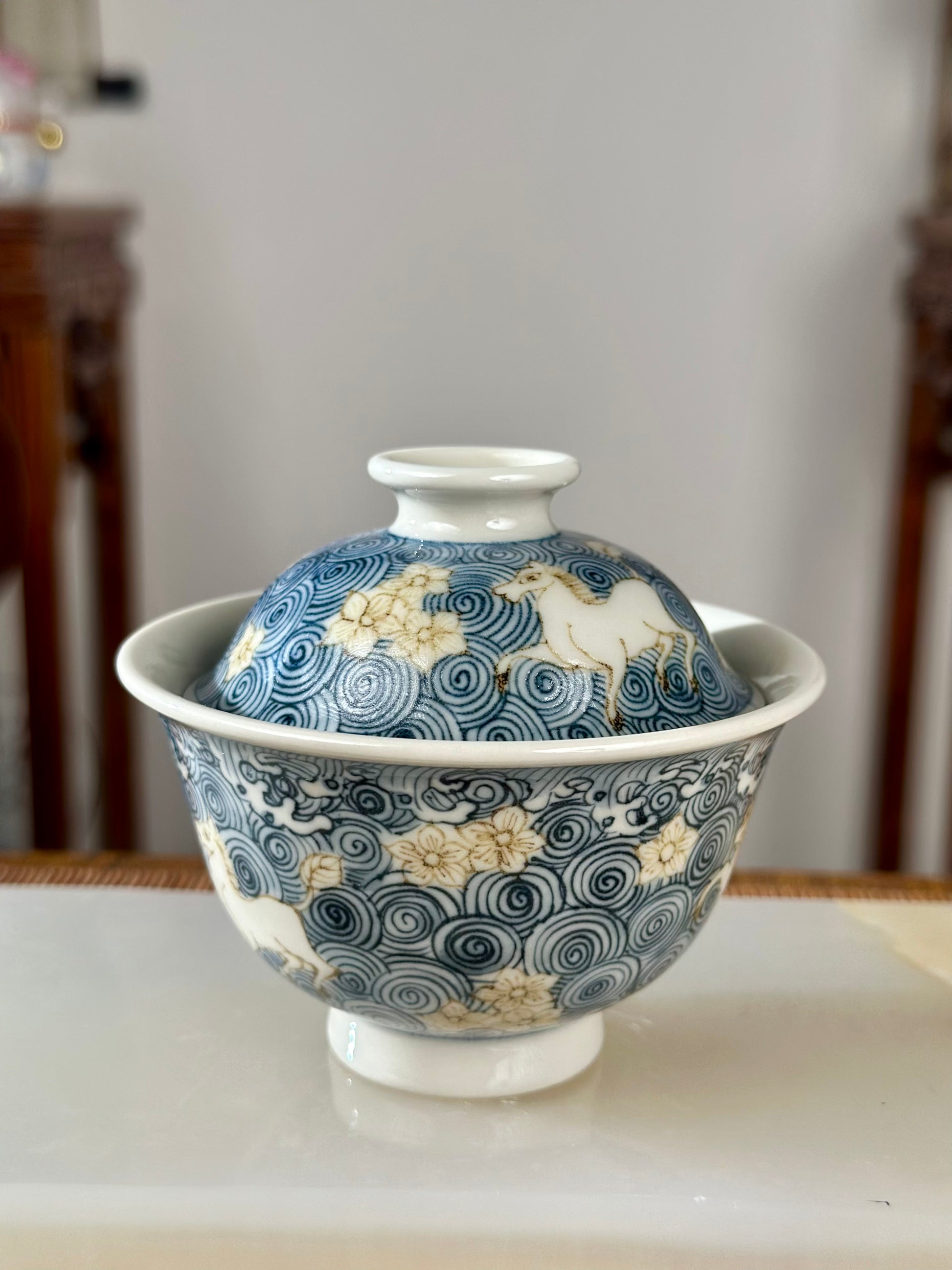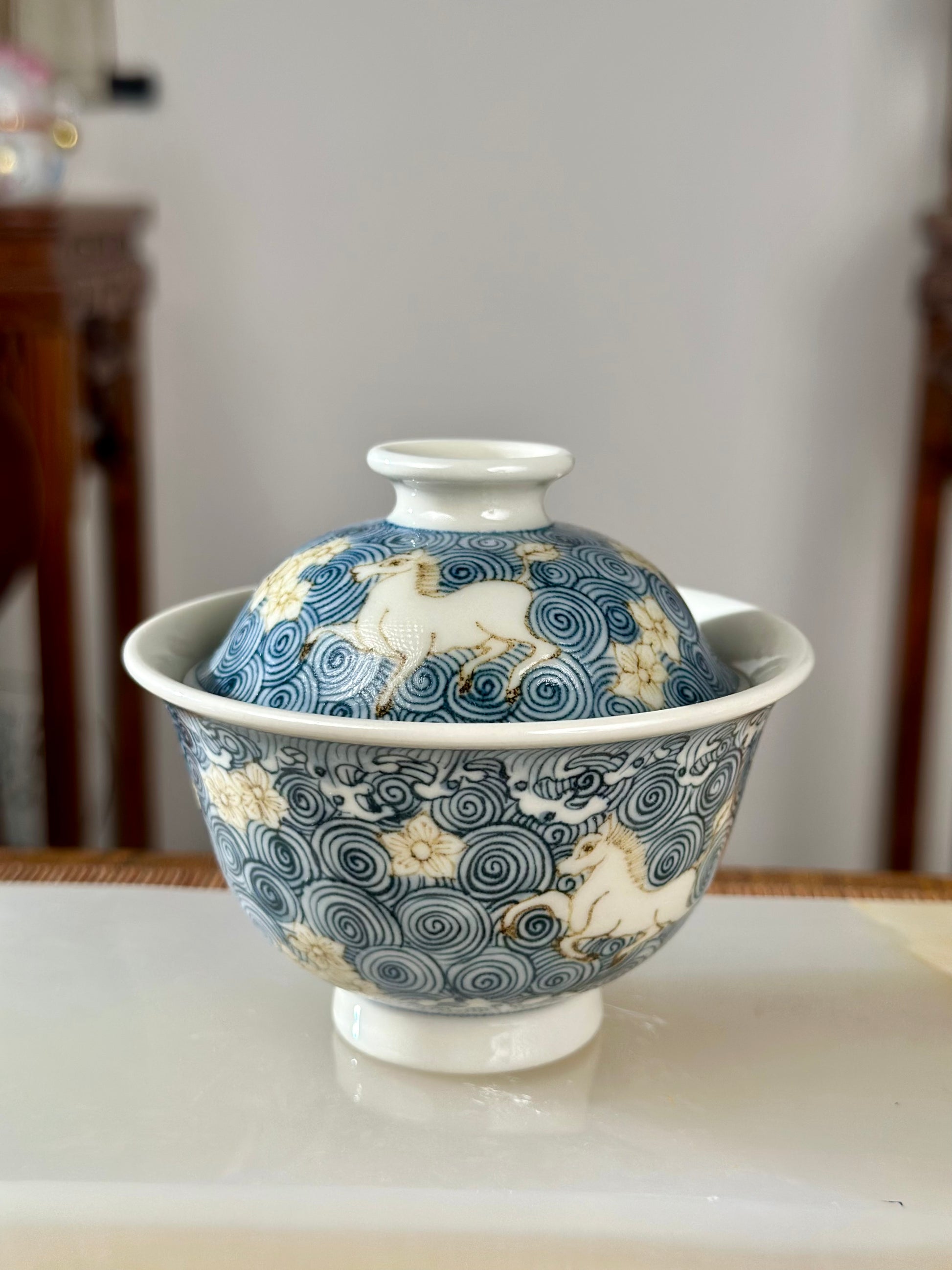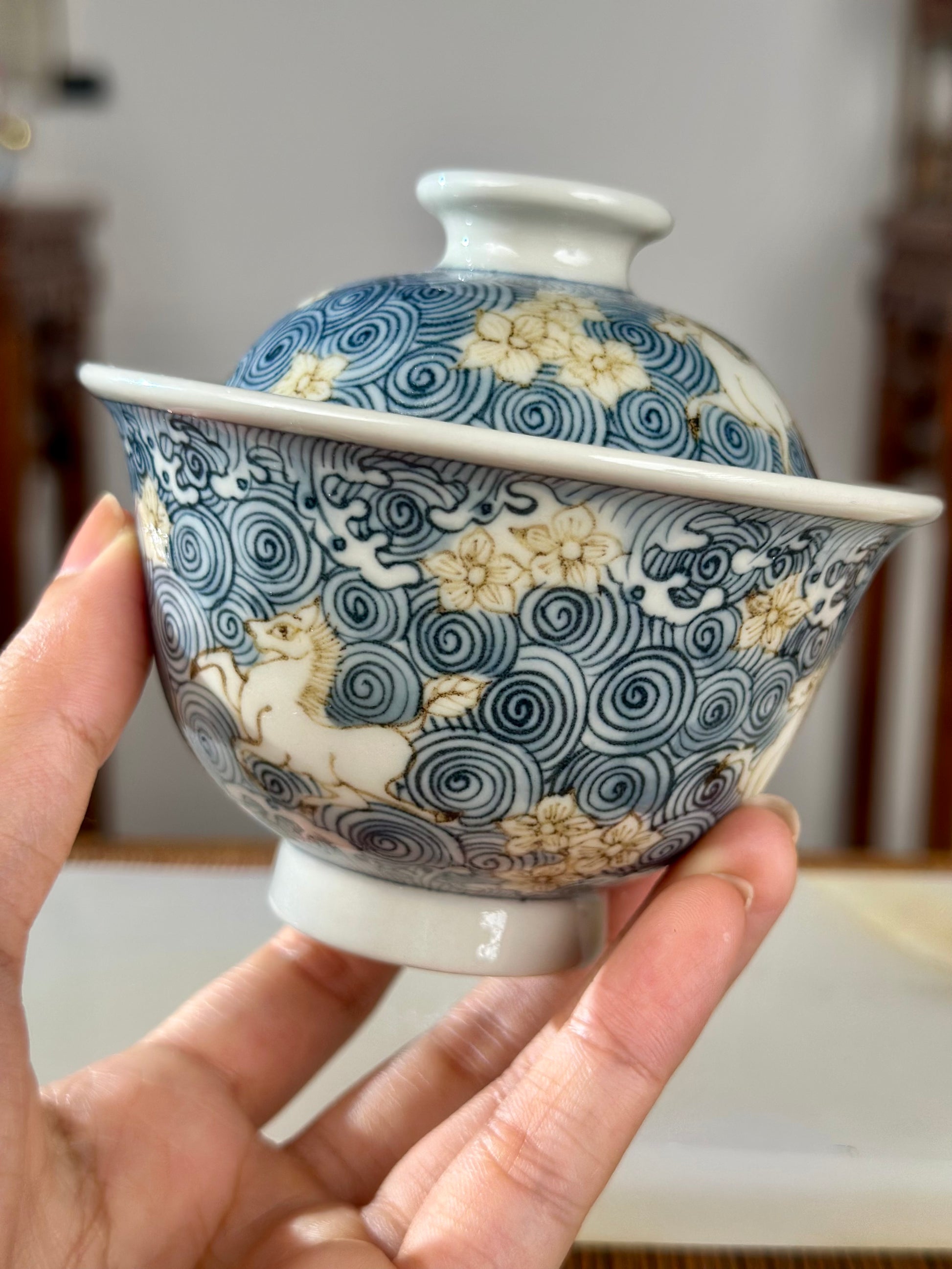 Handpainted Chinese Luxious Blue White Porcelain Underglaze Gold Youlijin Horse Flower Ocean Wave Pattern Gaiwan Set Artwork Teacup