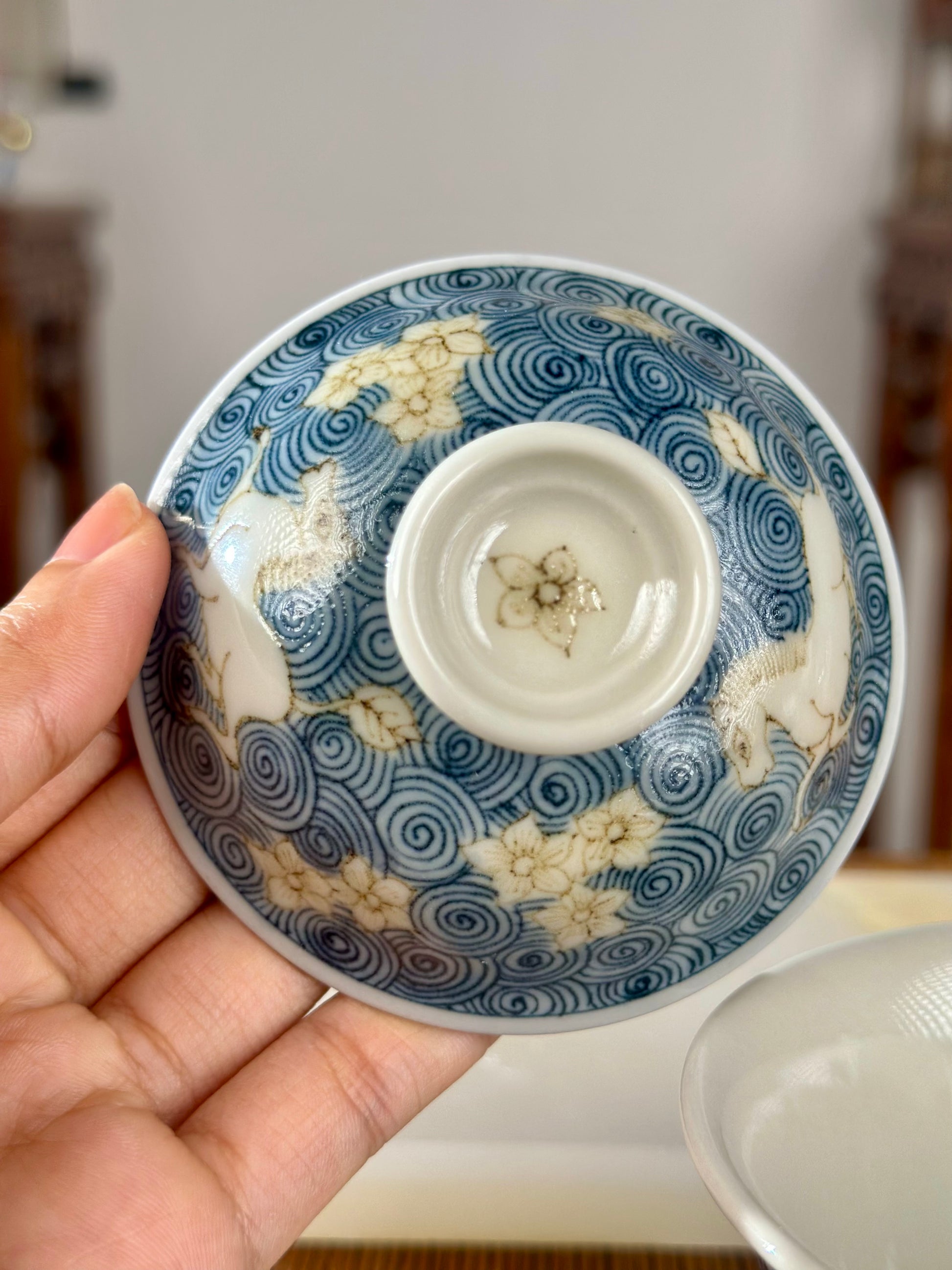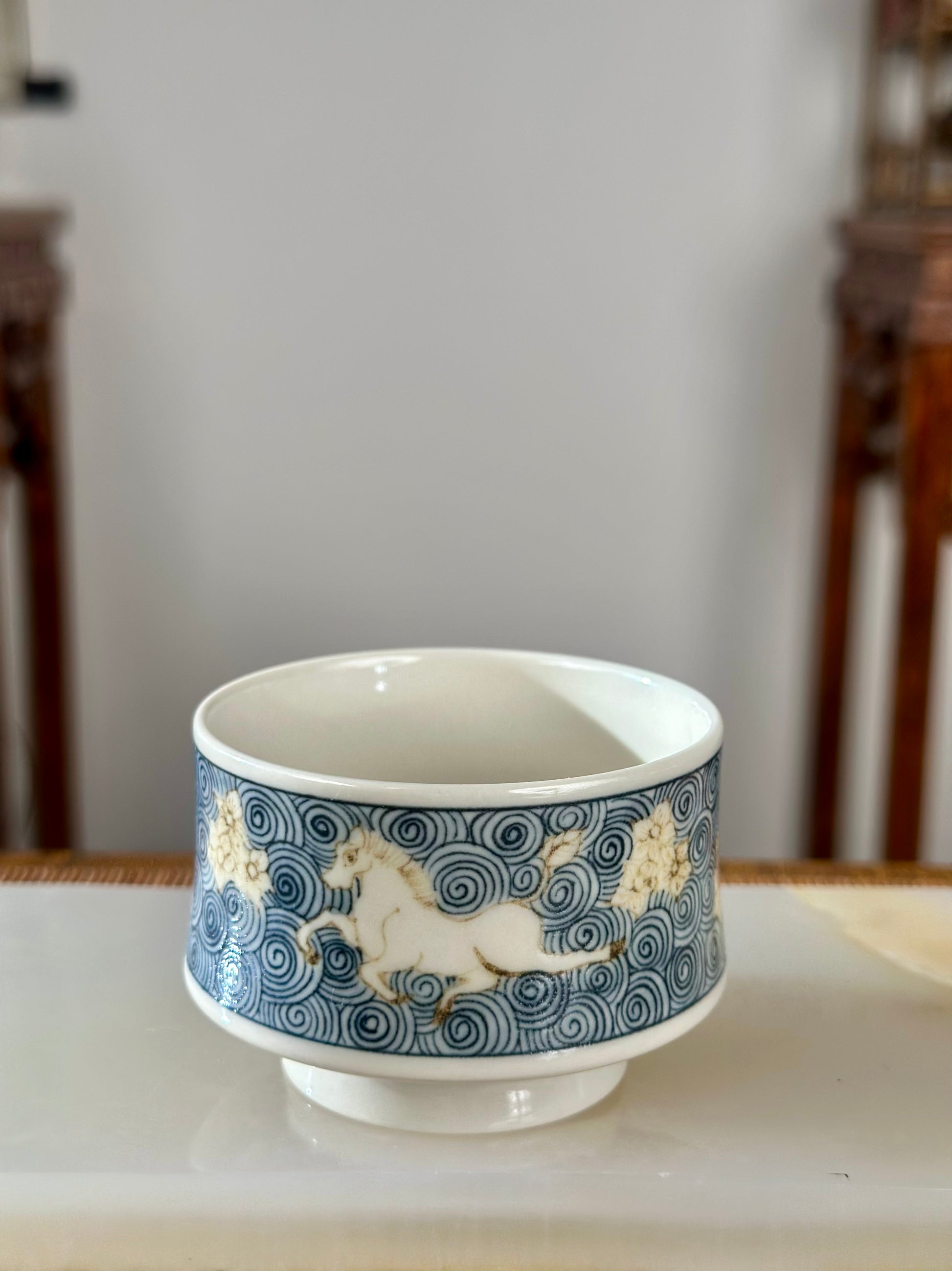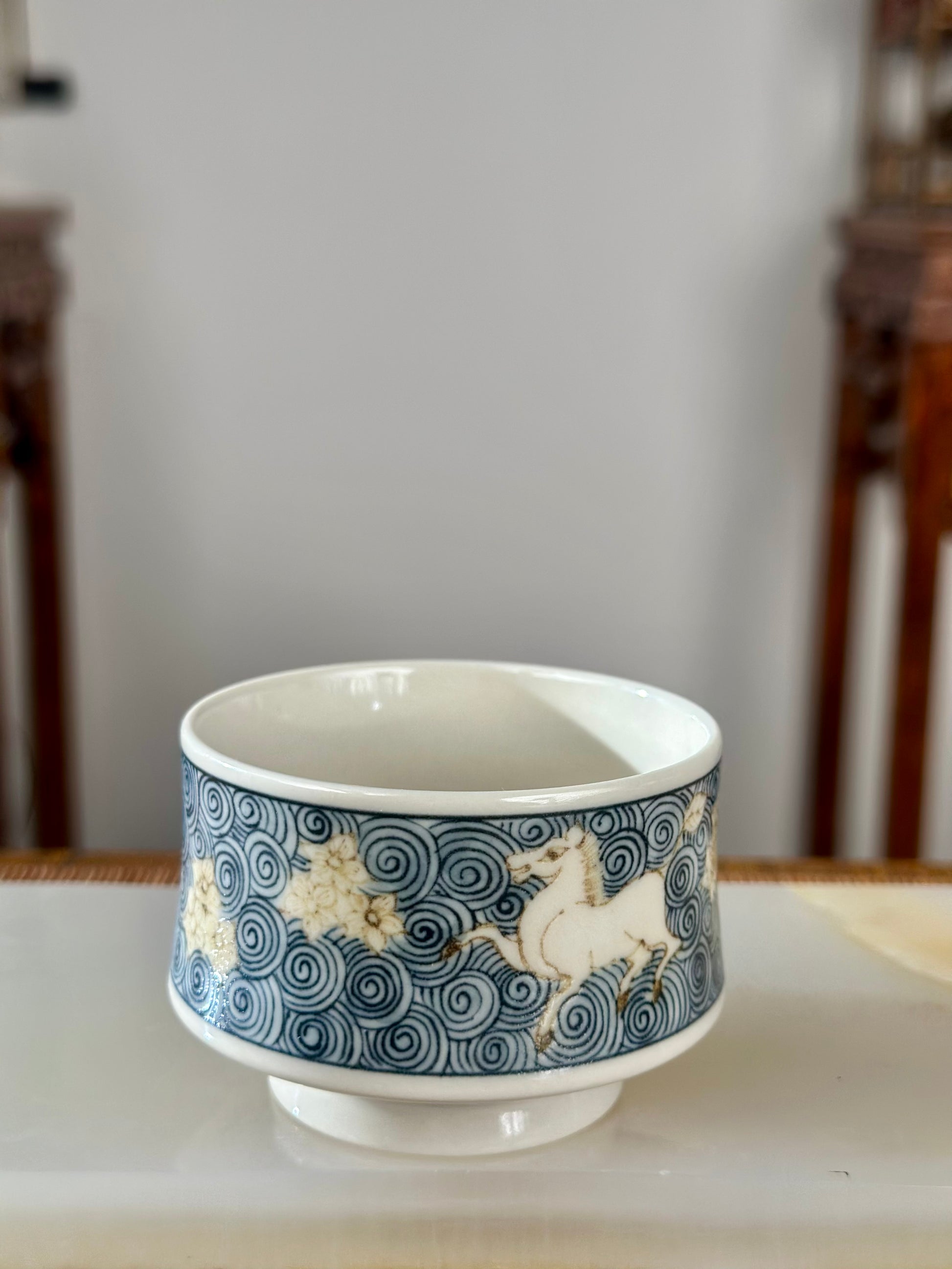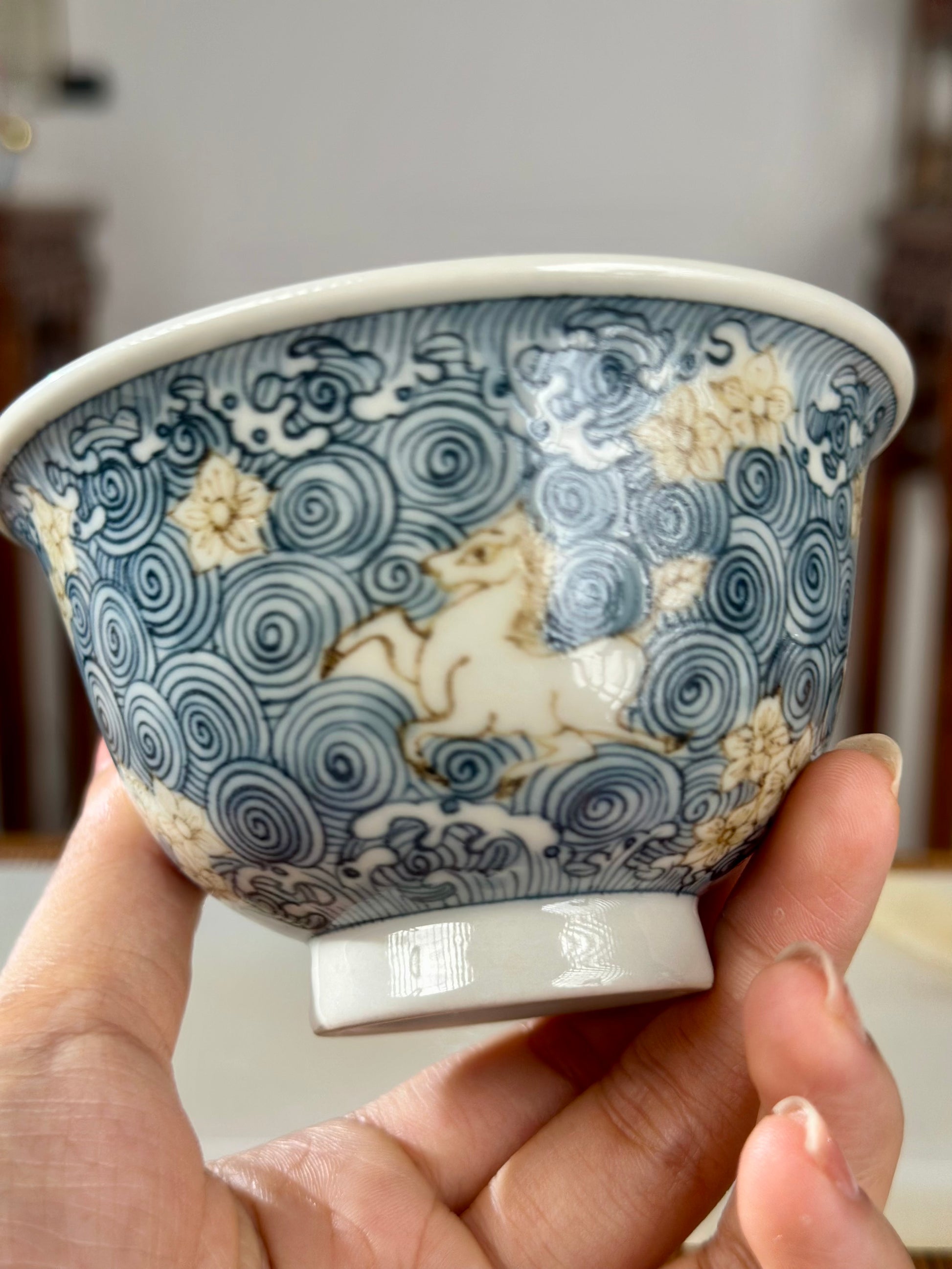This extraordinary set is applied with two Chinese craftsmanship Blue White Porcelain and Underglaze Gold, painted with a Chinese auspicious pattern called "Horse, Flowers, Ocean waves", signifies fortune will come soon.