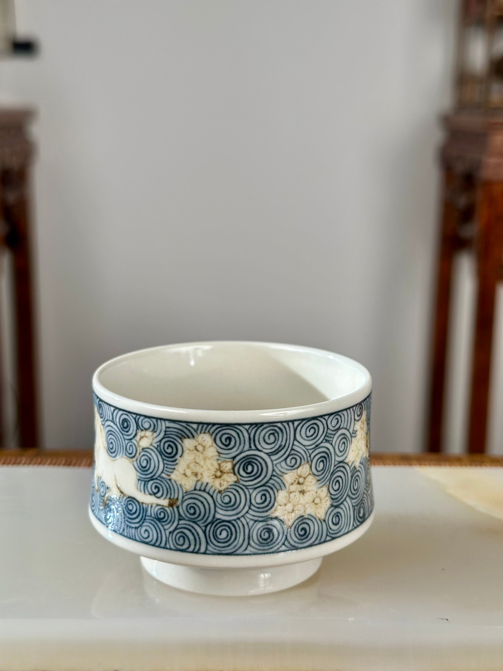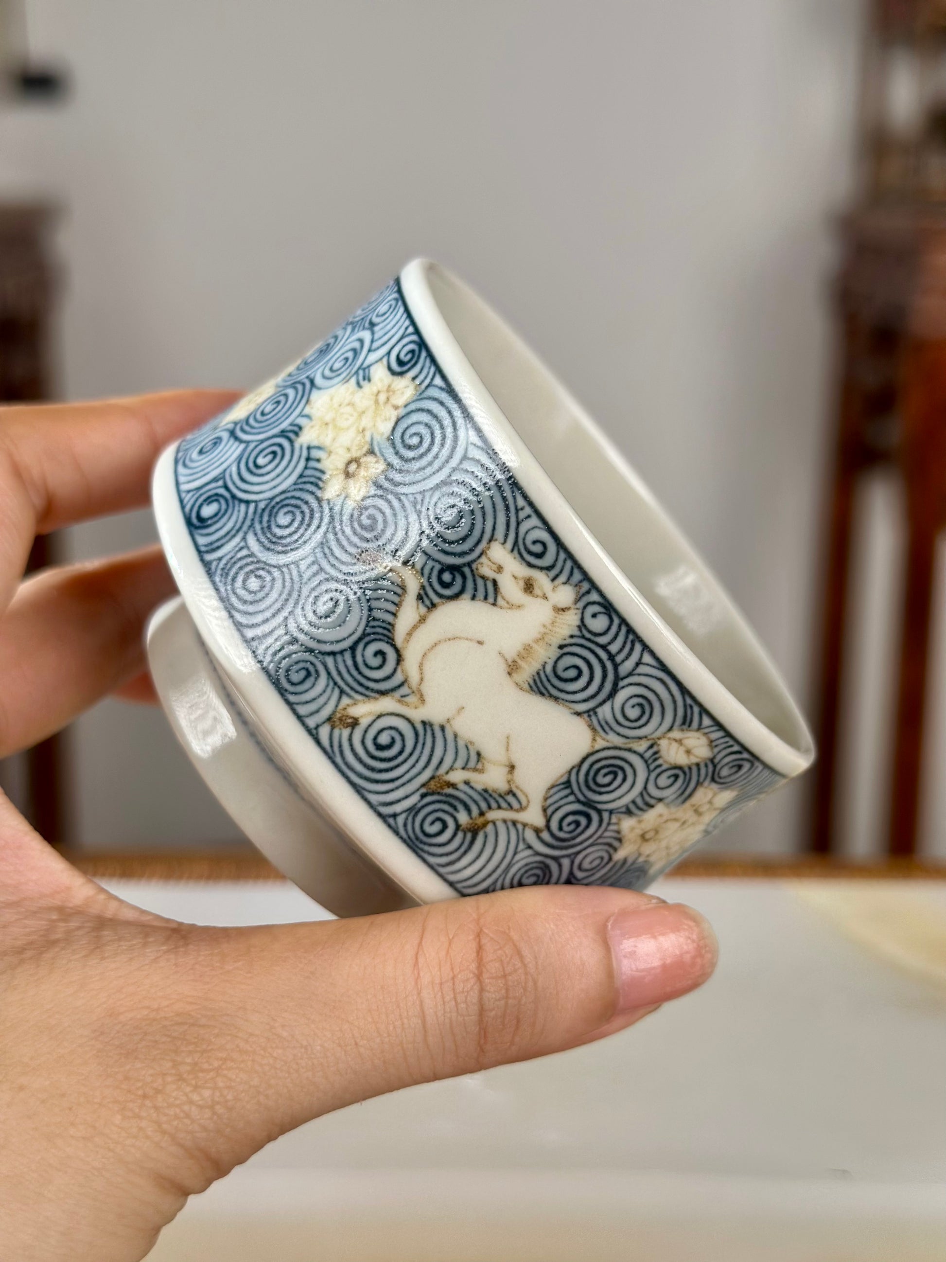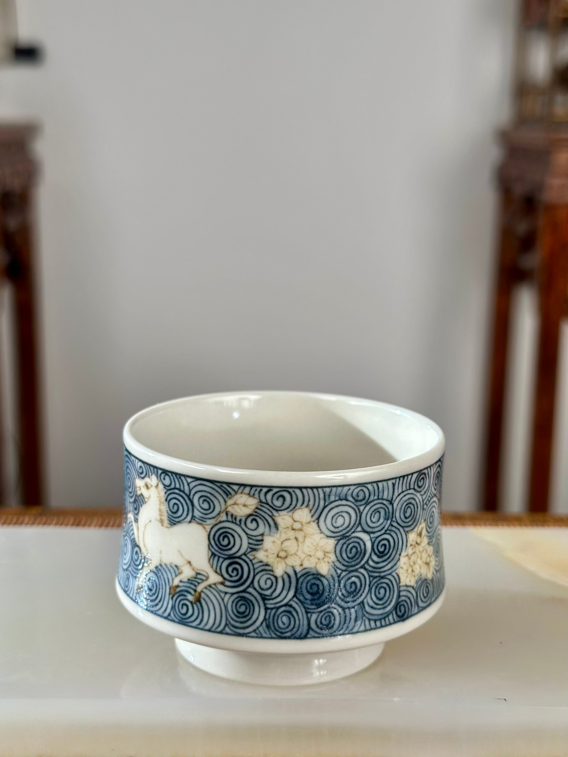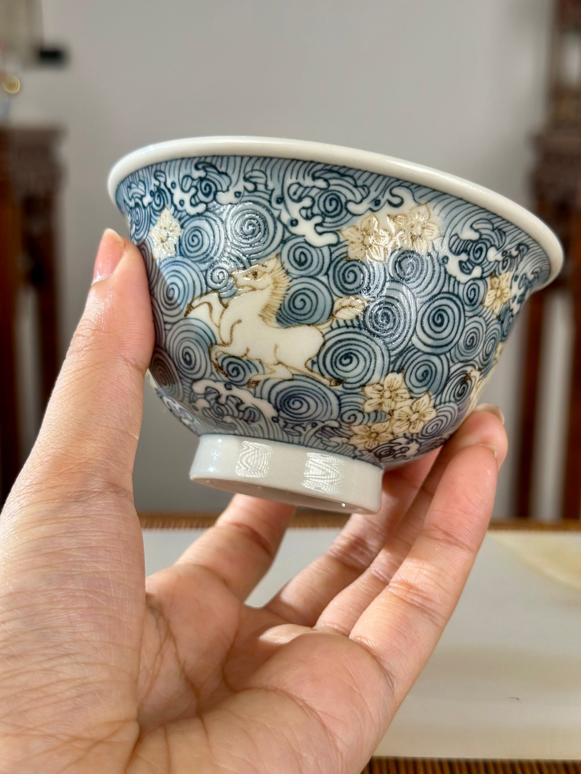 This extraordinary set is applied with two Chinese craftsmanship Blue White Porcelain and Underglaze Gold, painted with a Chinese auspicious pattern called "Horse, Flowers, Ocean waves", signifies fortune will come soon.