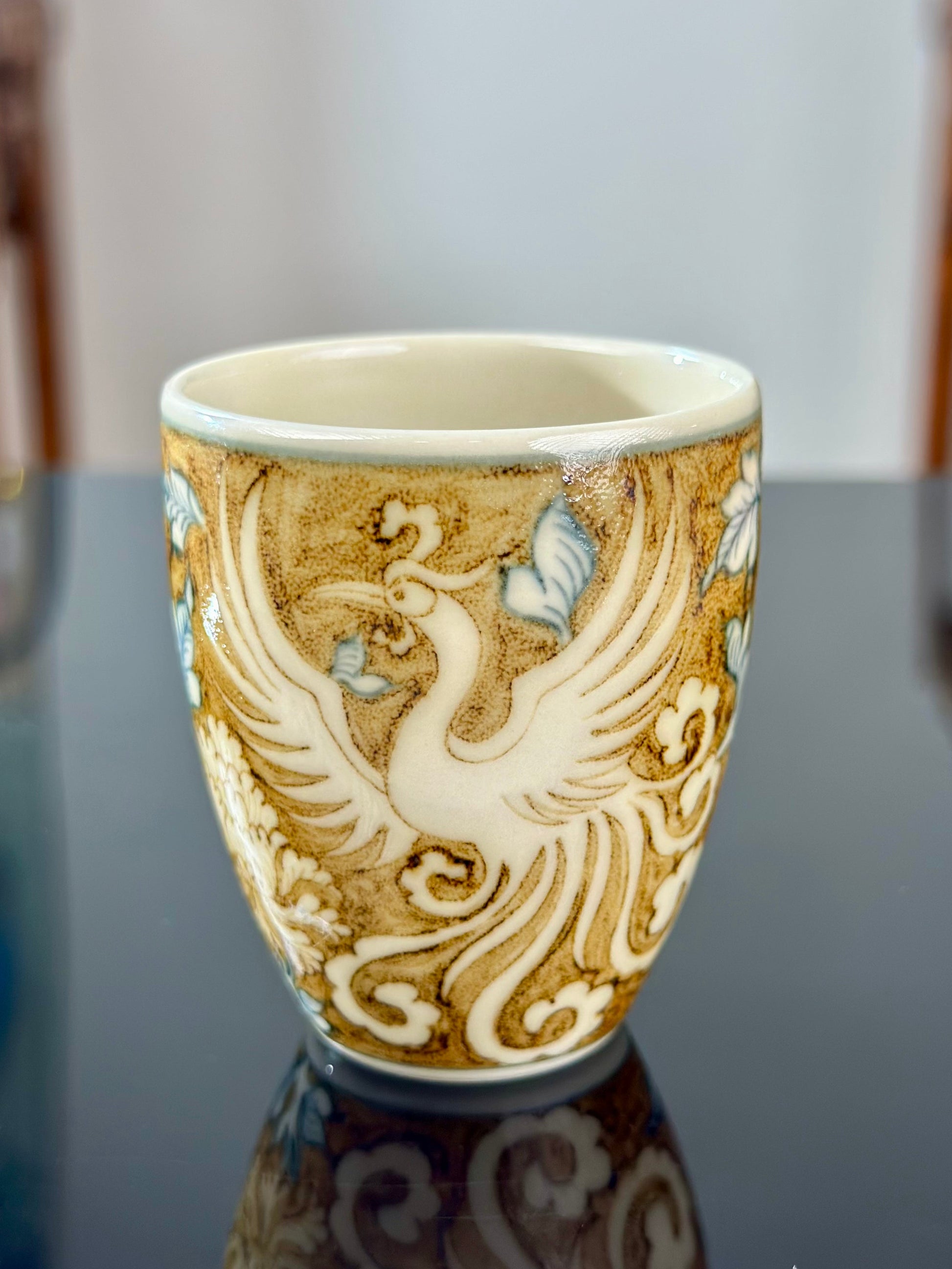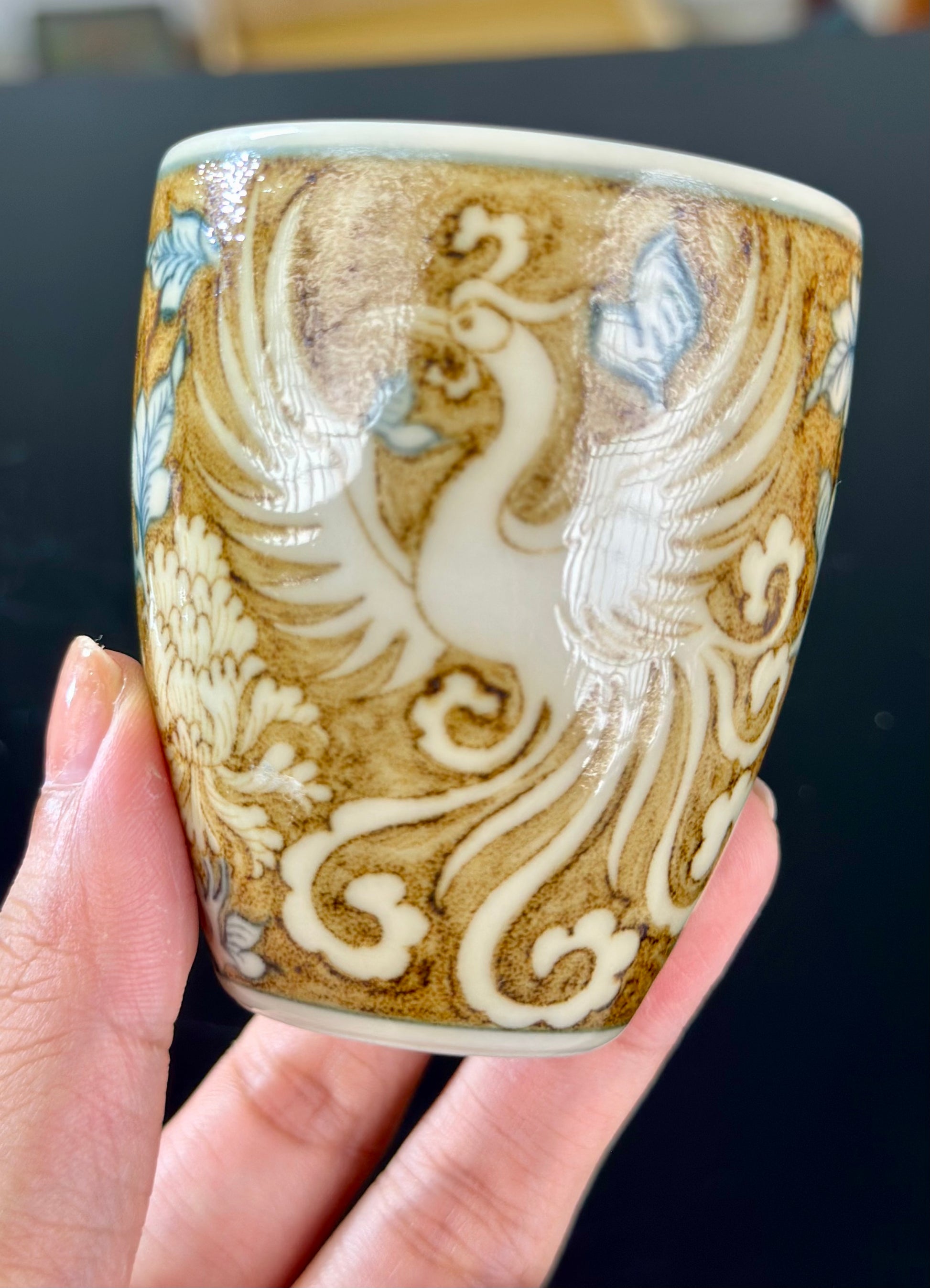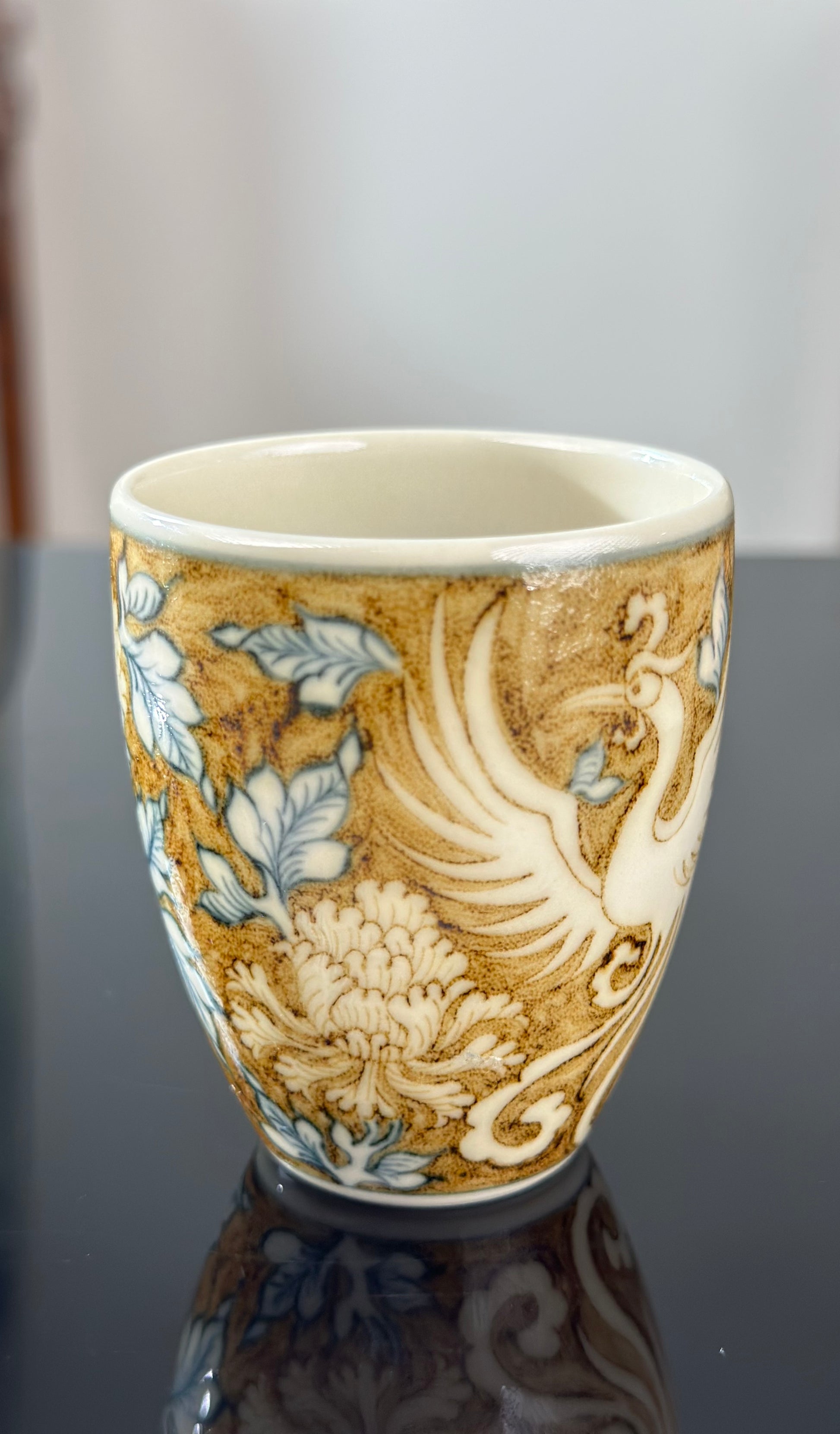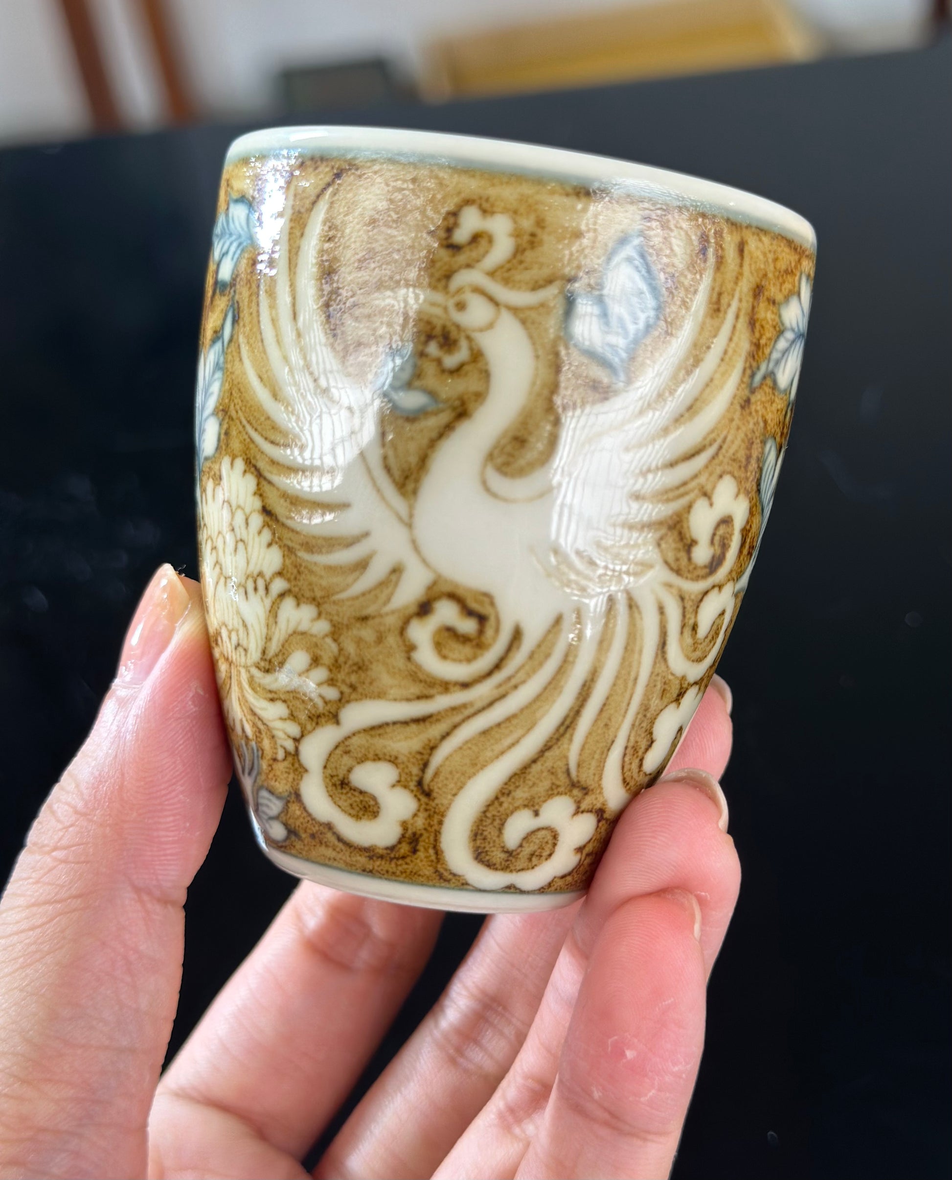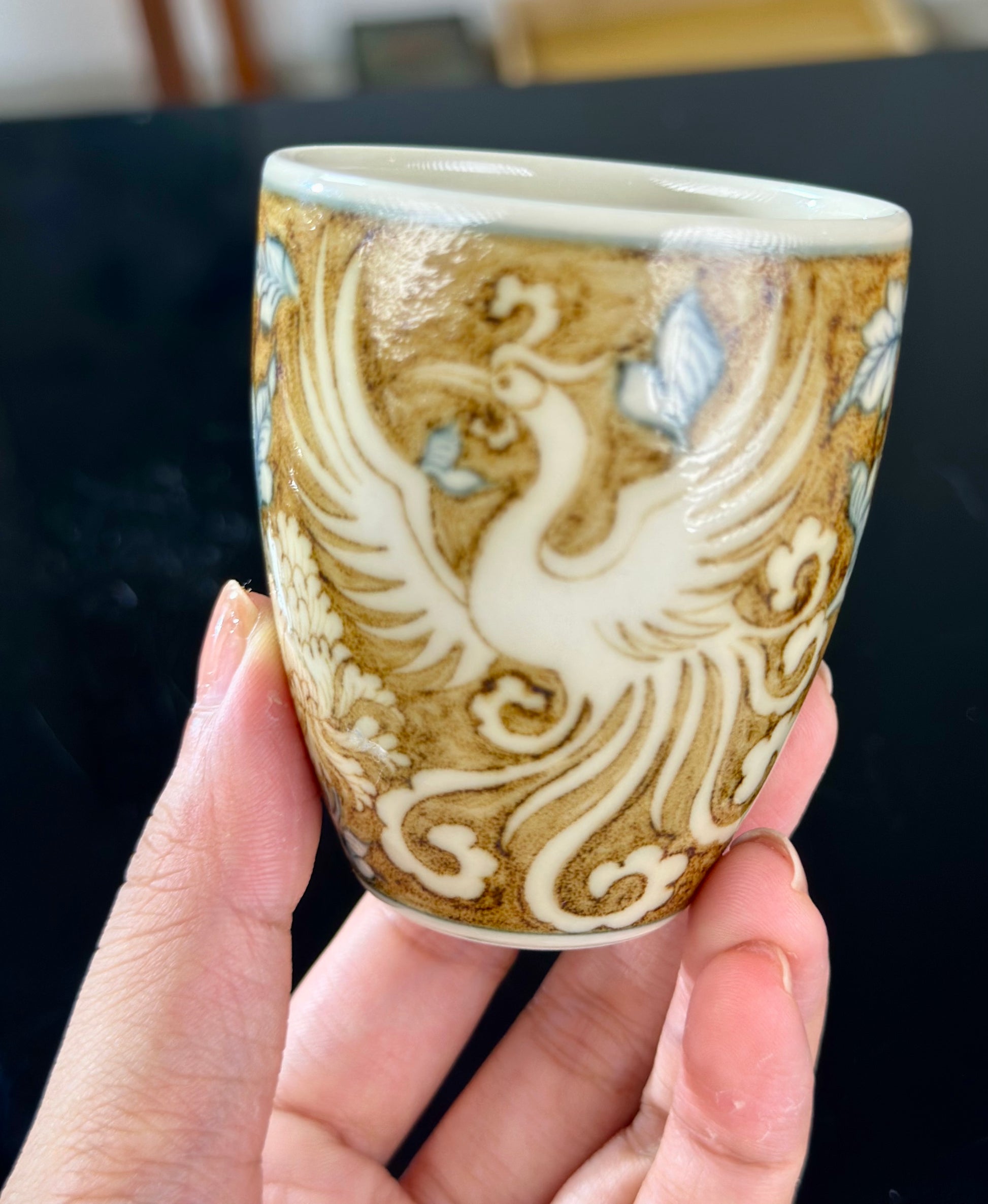 Handpainted Chinese Luxious Blue White Porcelain Underglaze Gold Youlijin Traditional Phoeni Pattern Artwork Teacup