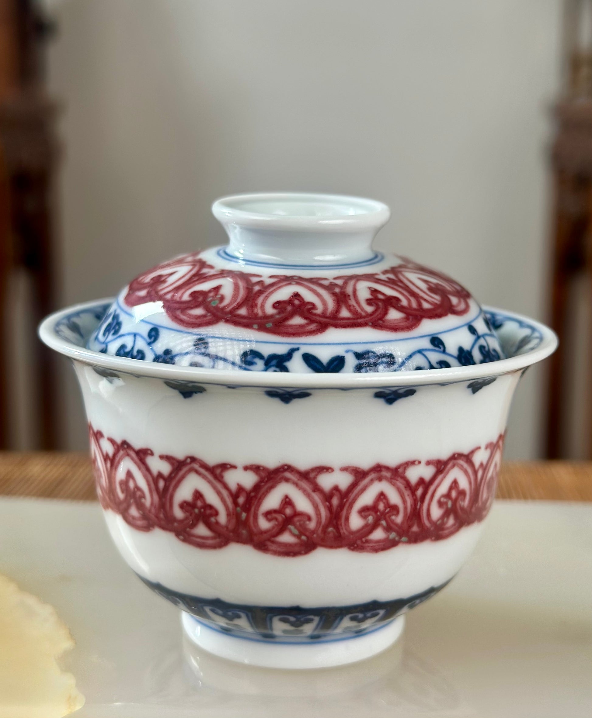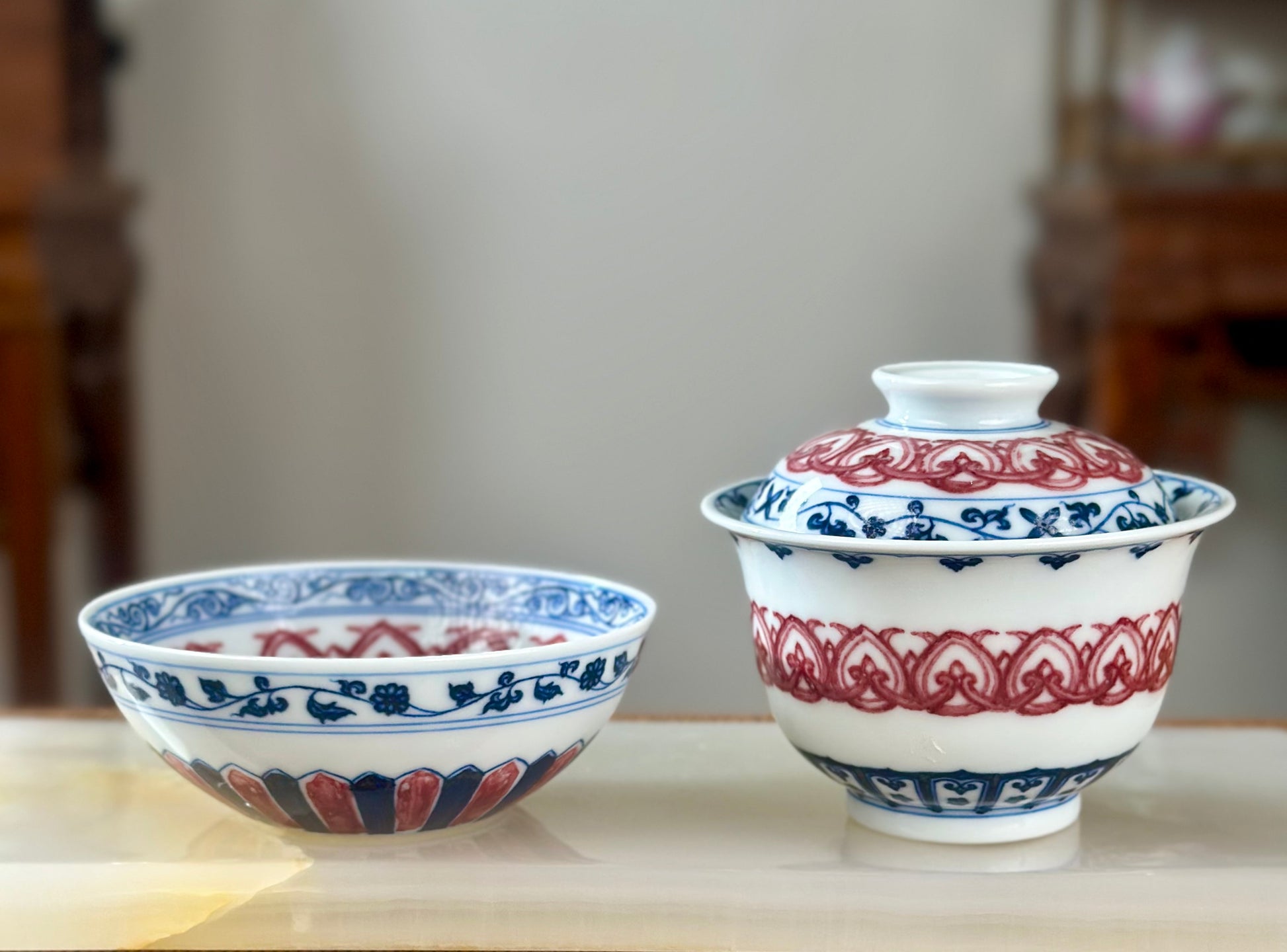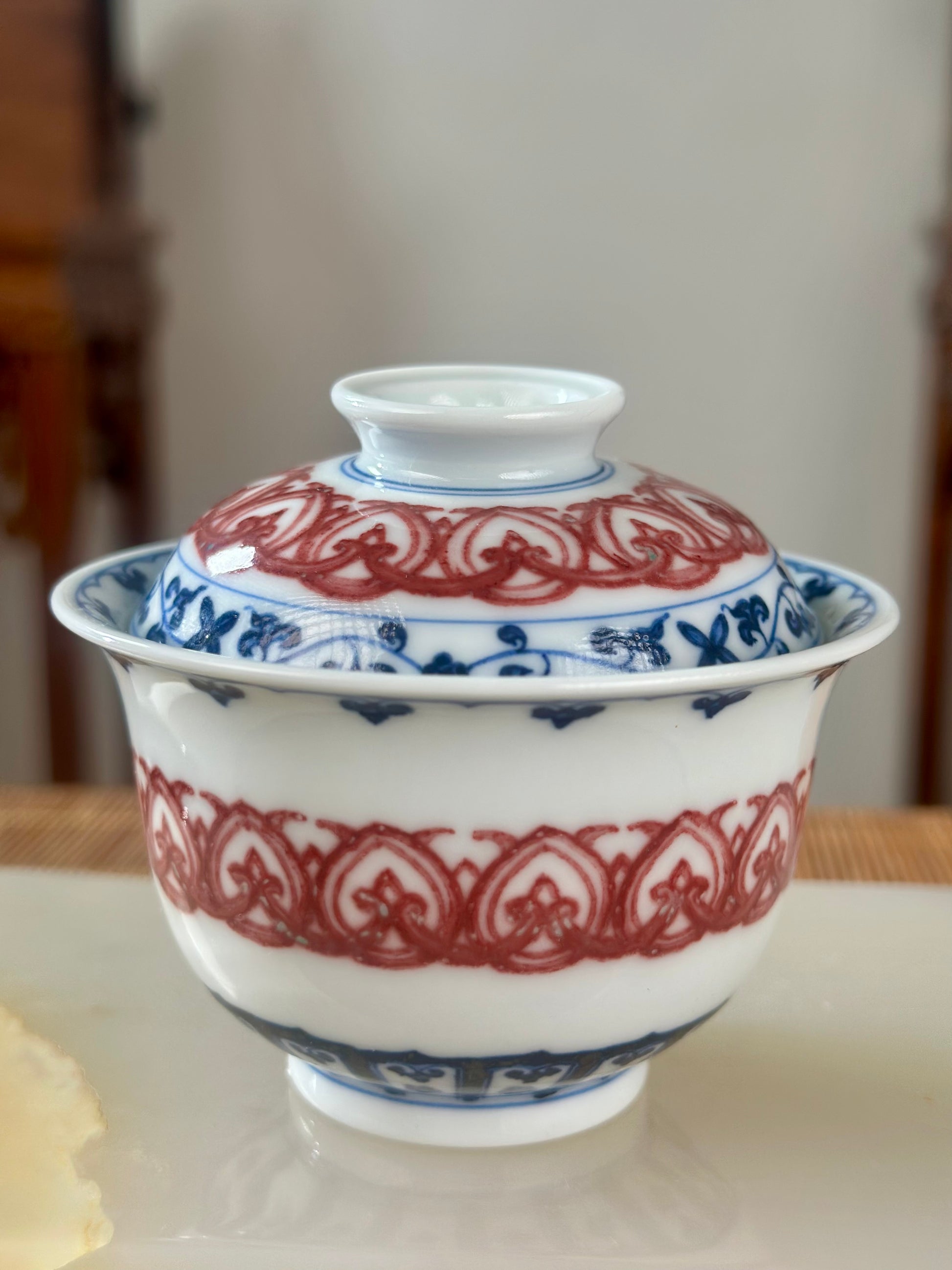 Handpainted Chinese Traditional Baoxiang Flower Pattern Blue and White Underglaze Red Youlihong Porcelain Jingdezhen Gaiwan Teacup Set