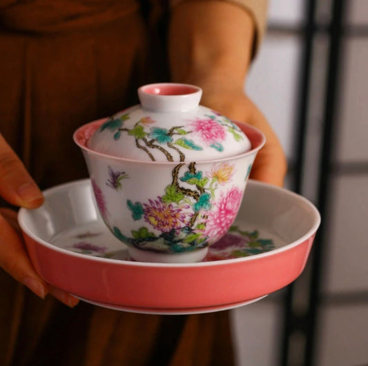 Handcraft Chinese Handpainted Chinese Chrysanthemum Enamel Gaiwan Set Jingdezhen Gaiwan Tea Boat Ceramic Master Pottery Artwork